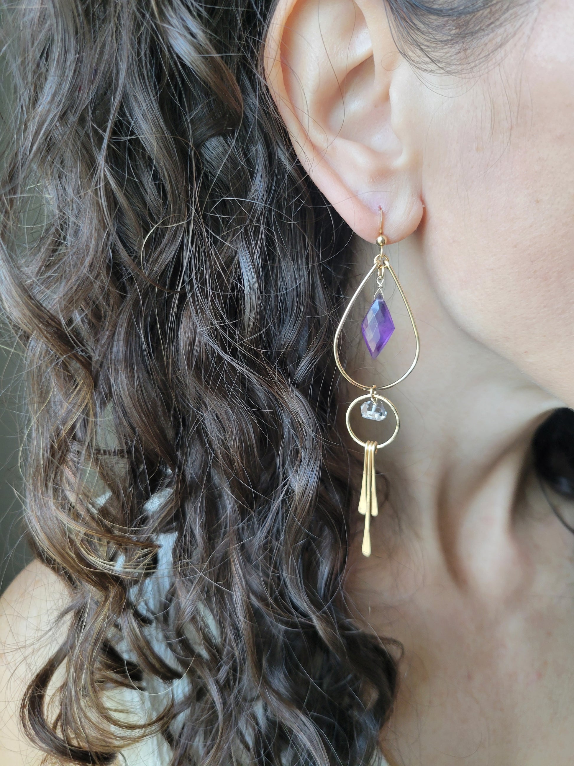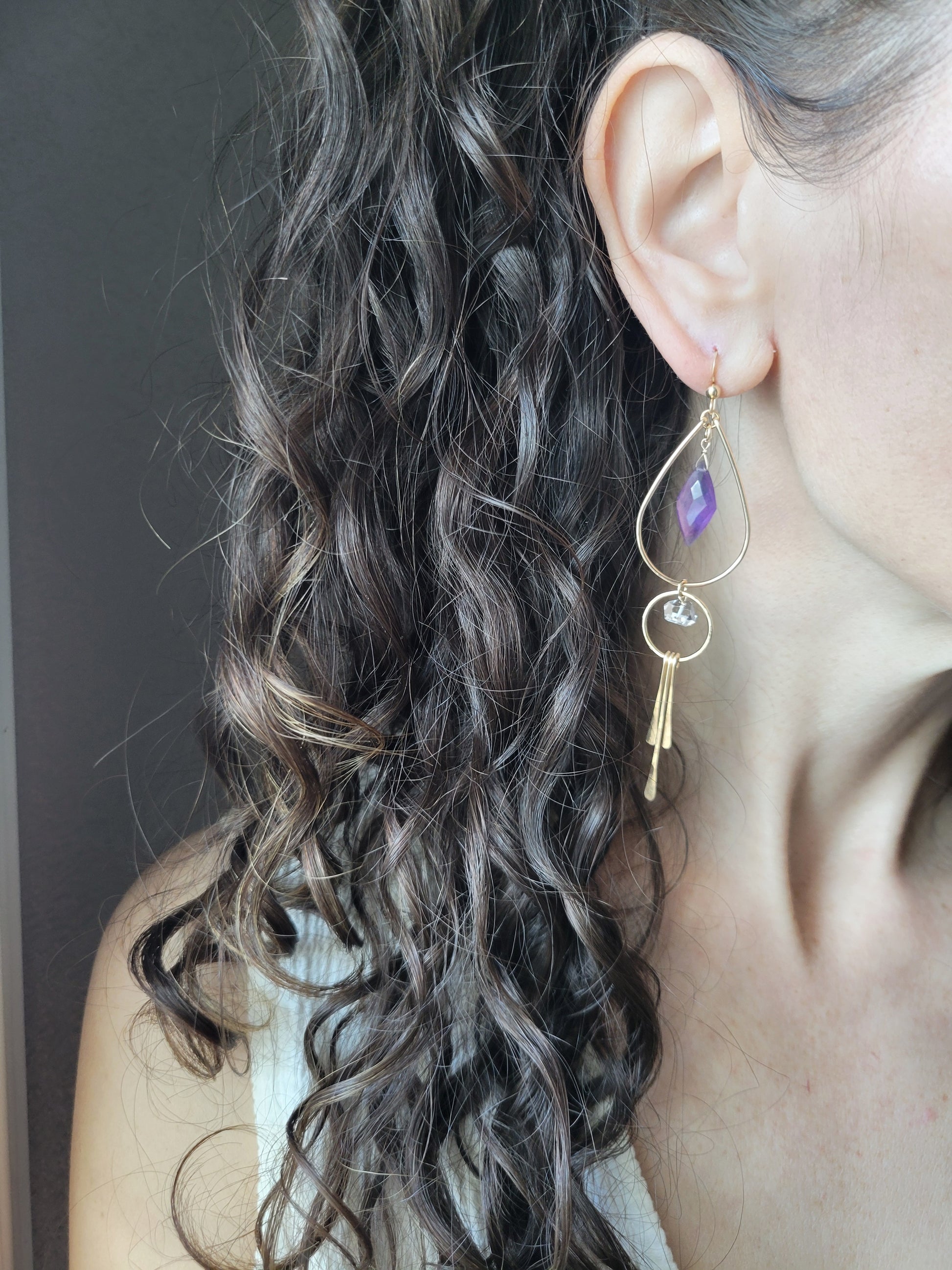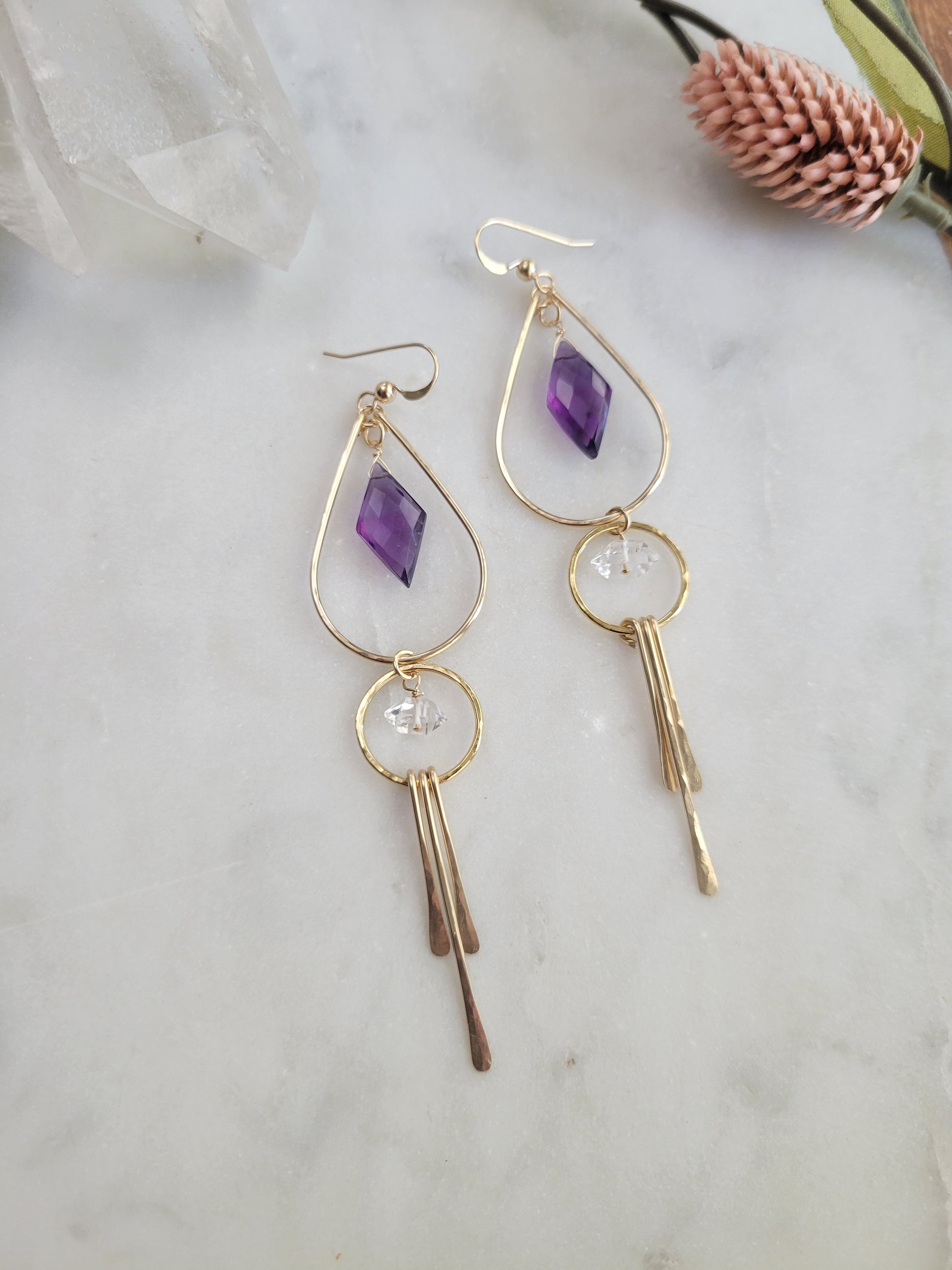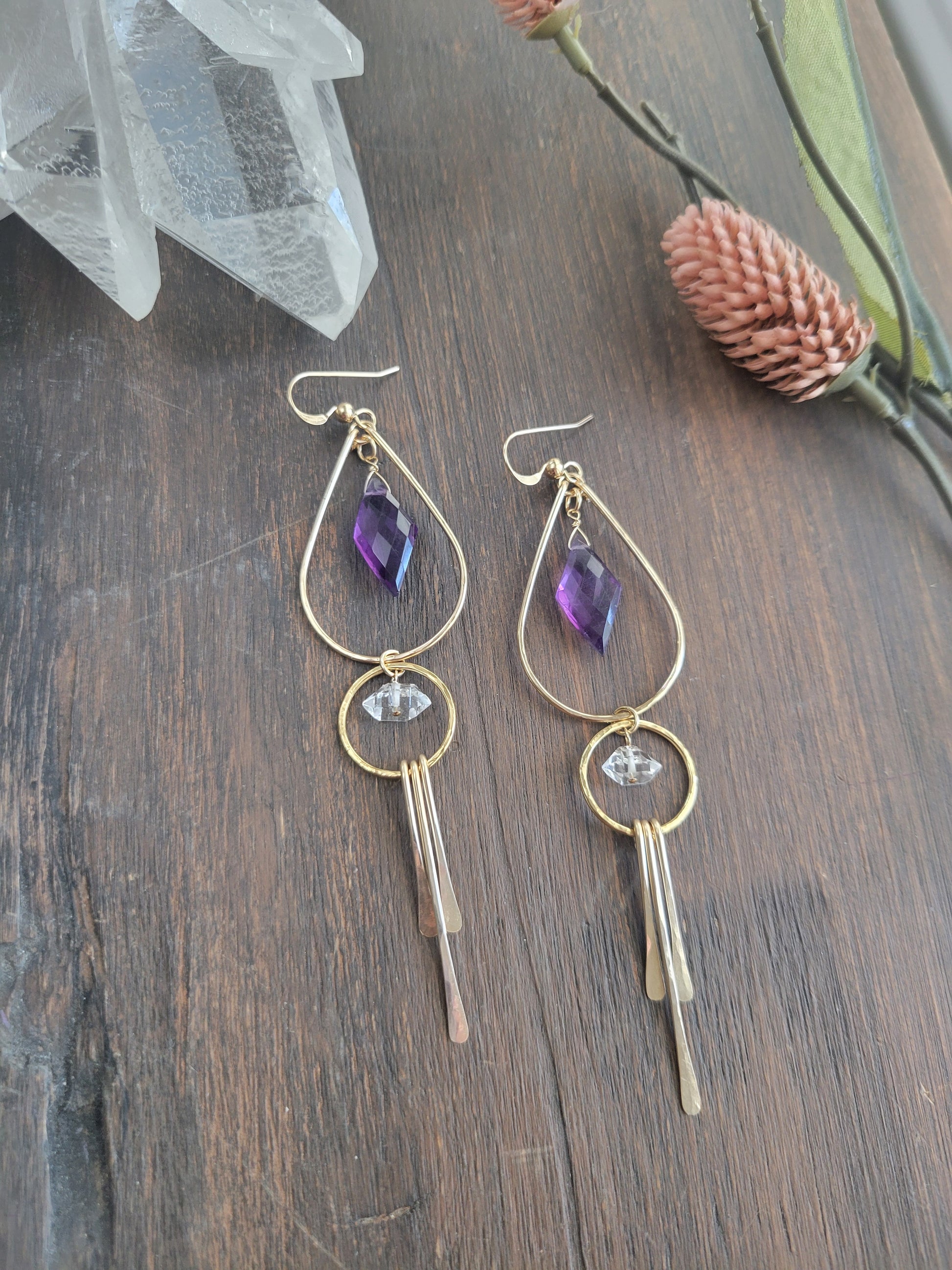 Beautiful and elegant Amethyst and Herkimer Diamond Fringe Earrings. These beauties are a dainty statement earring that you can wear casually, on a night out with friends, or on that special date.