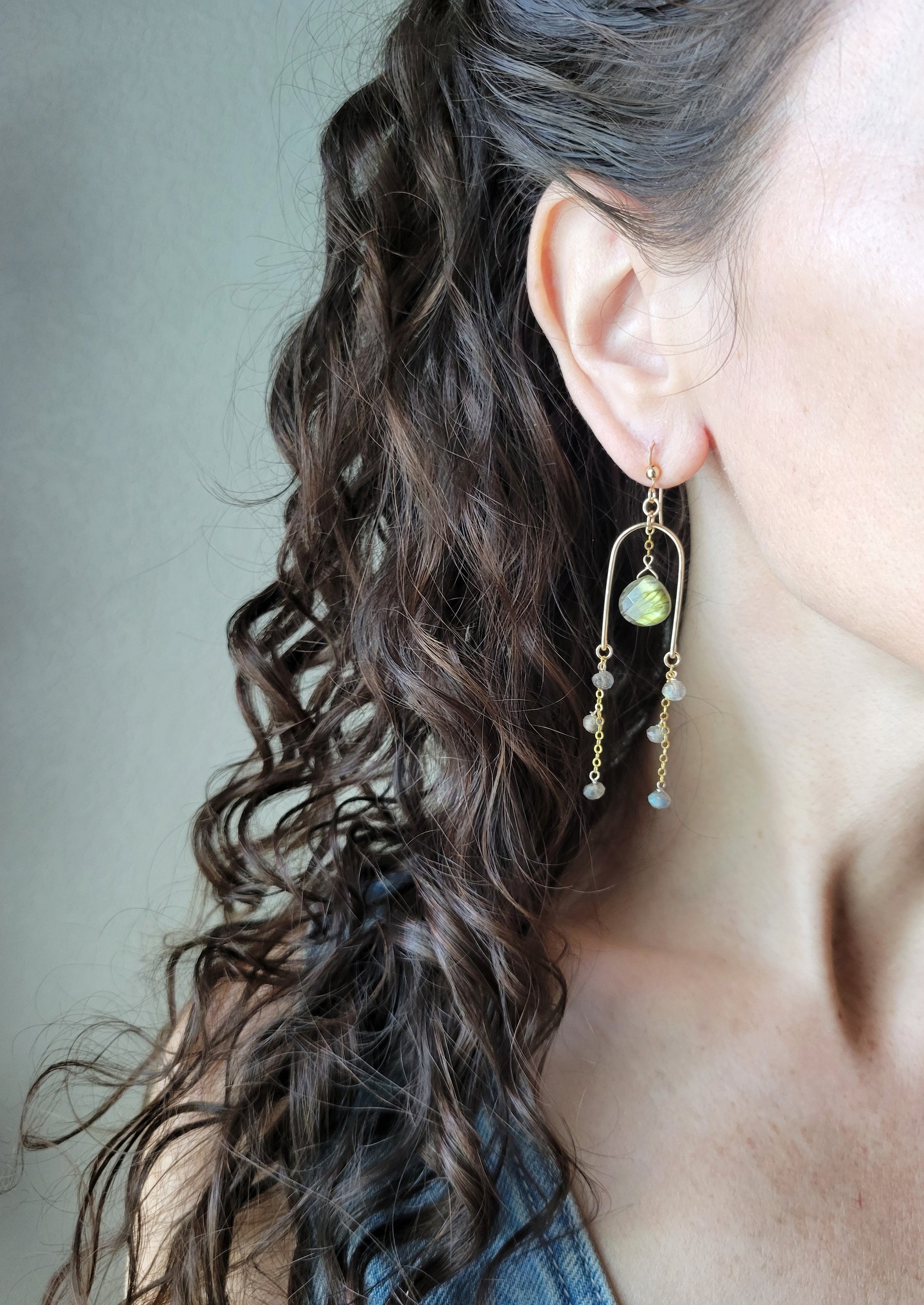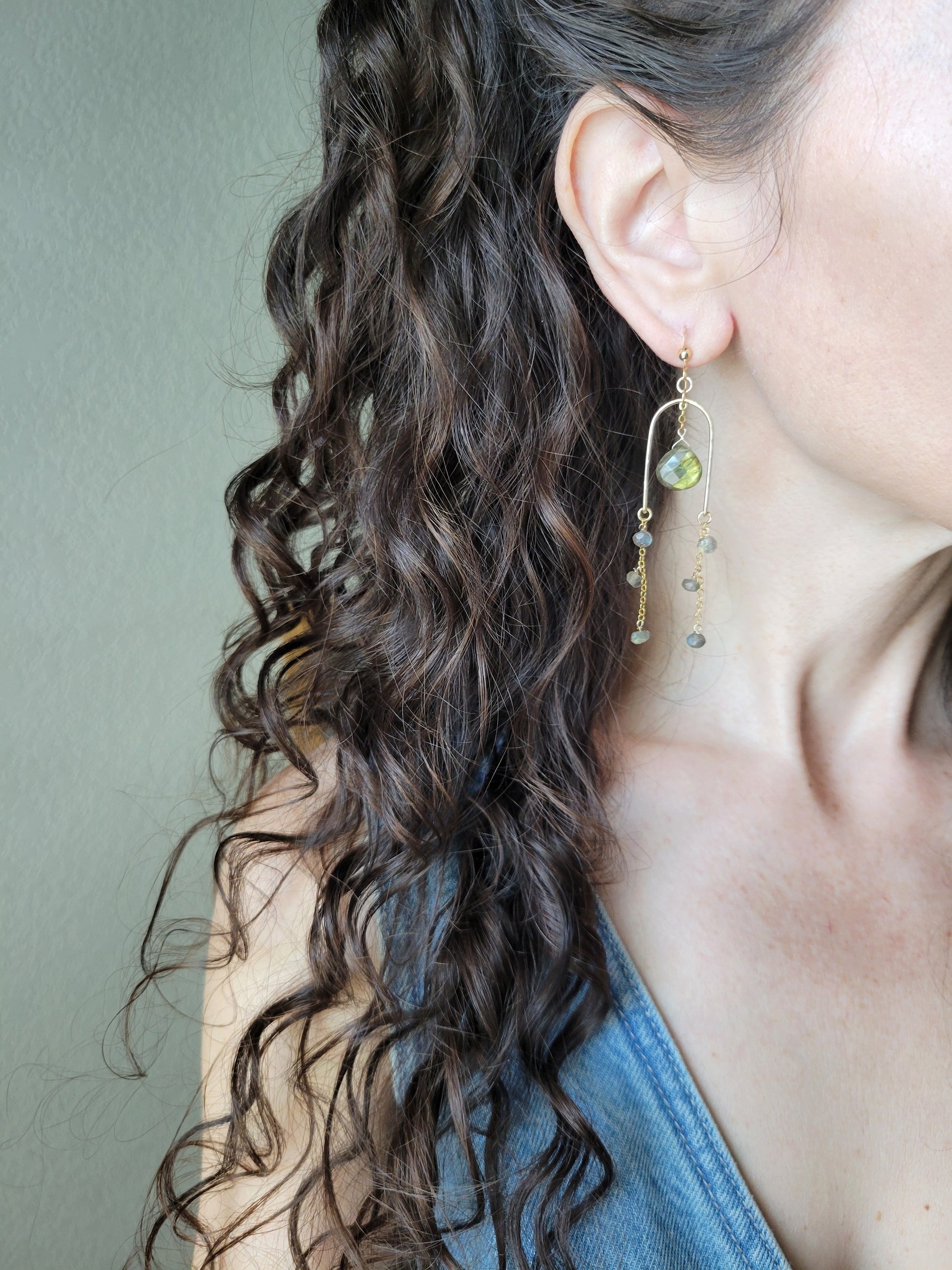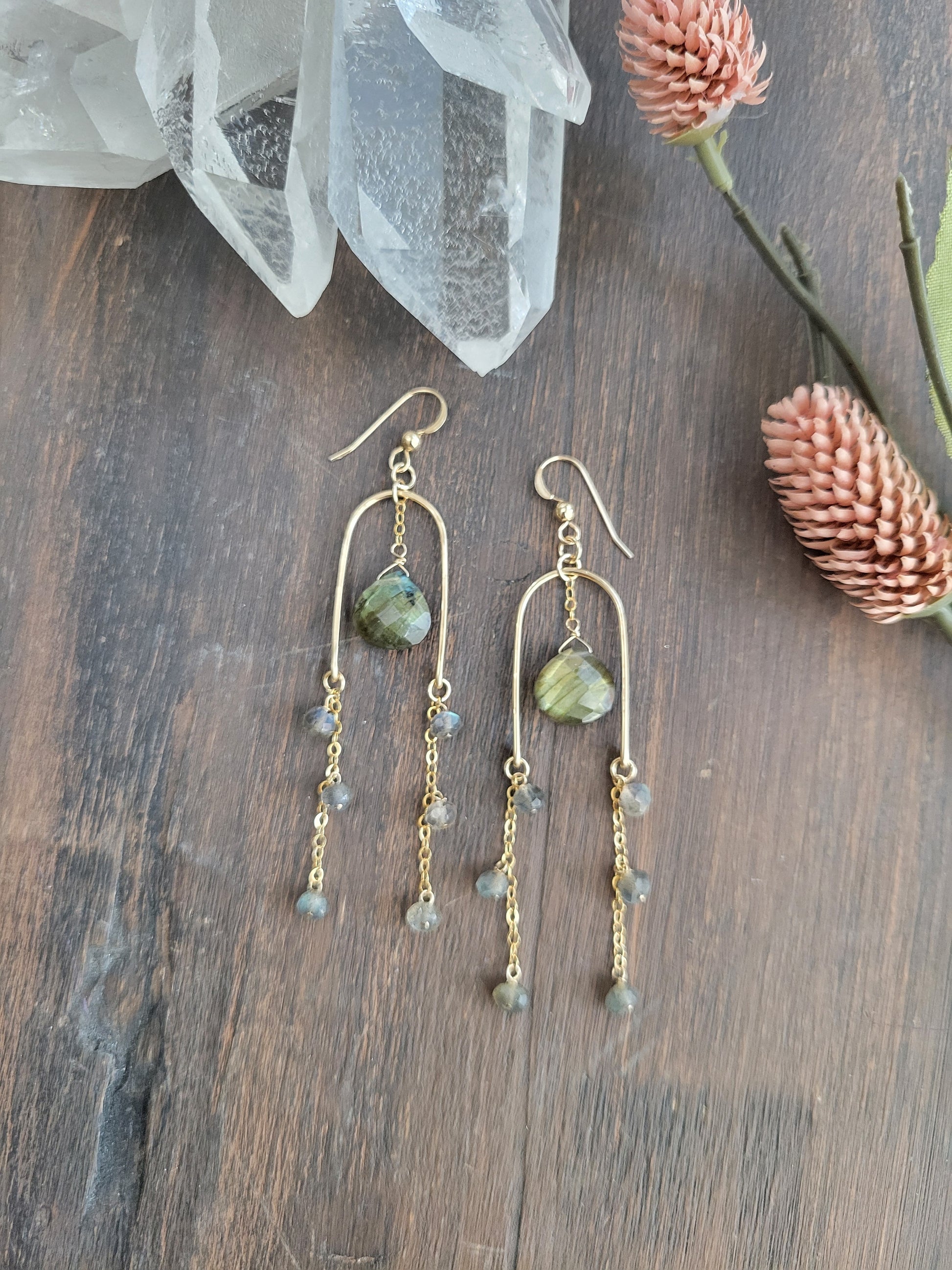 The Celeste Earrings feature the beautiful Labradorite gemstone. These have a fun boho and elegant feel to them. They are lightweight and you can easily dress them up or down.