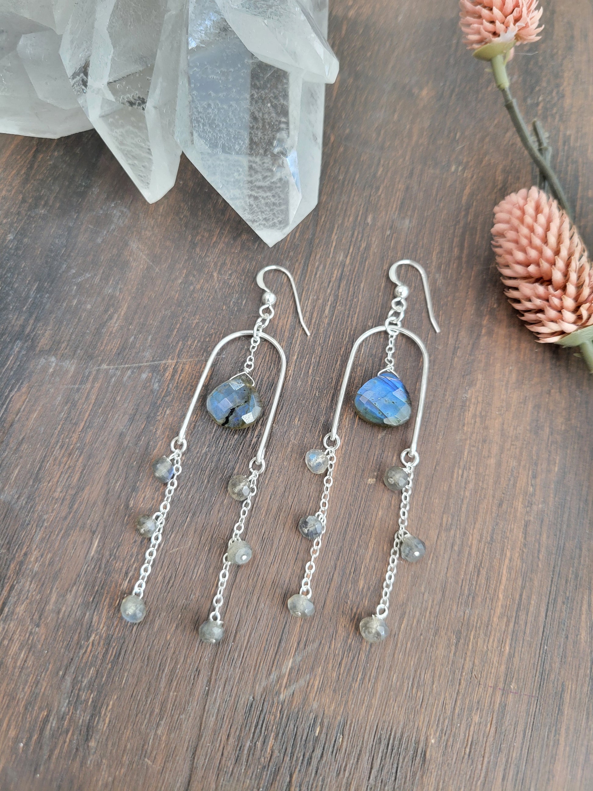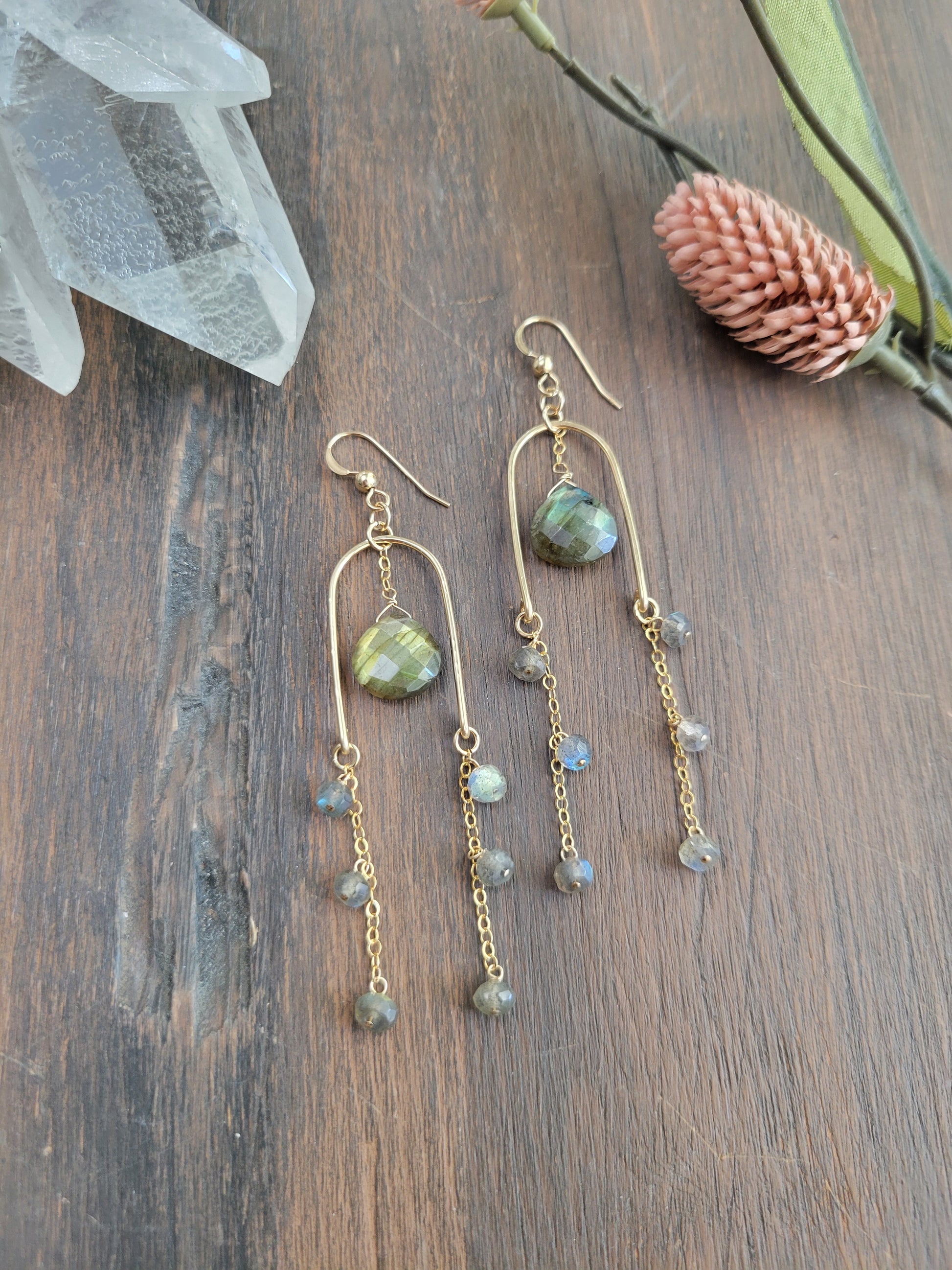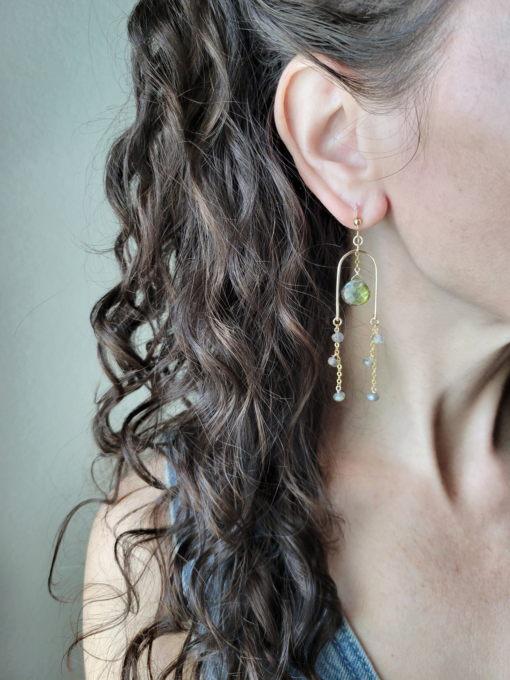 The upside down u shape is hand formed and lightly hammered. The Labradorite in between will vary in colors of blues, greens, and yellow green. If you have a preference, feel free to message me. The Labradorite along the dangling chain is individually wrapped on and are grey with some flashes of color here and there.
