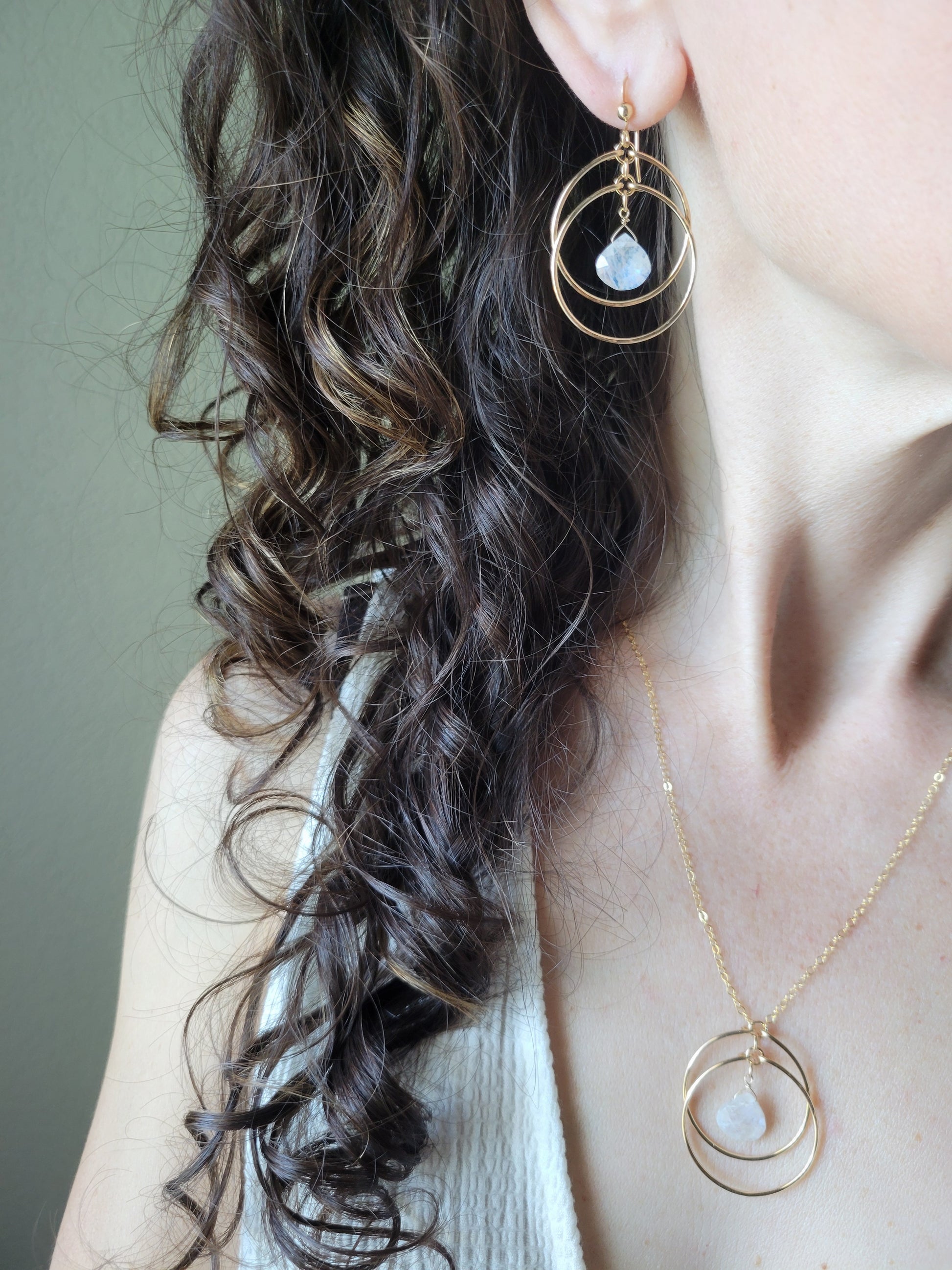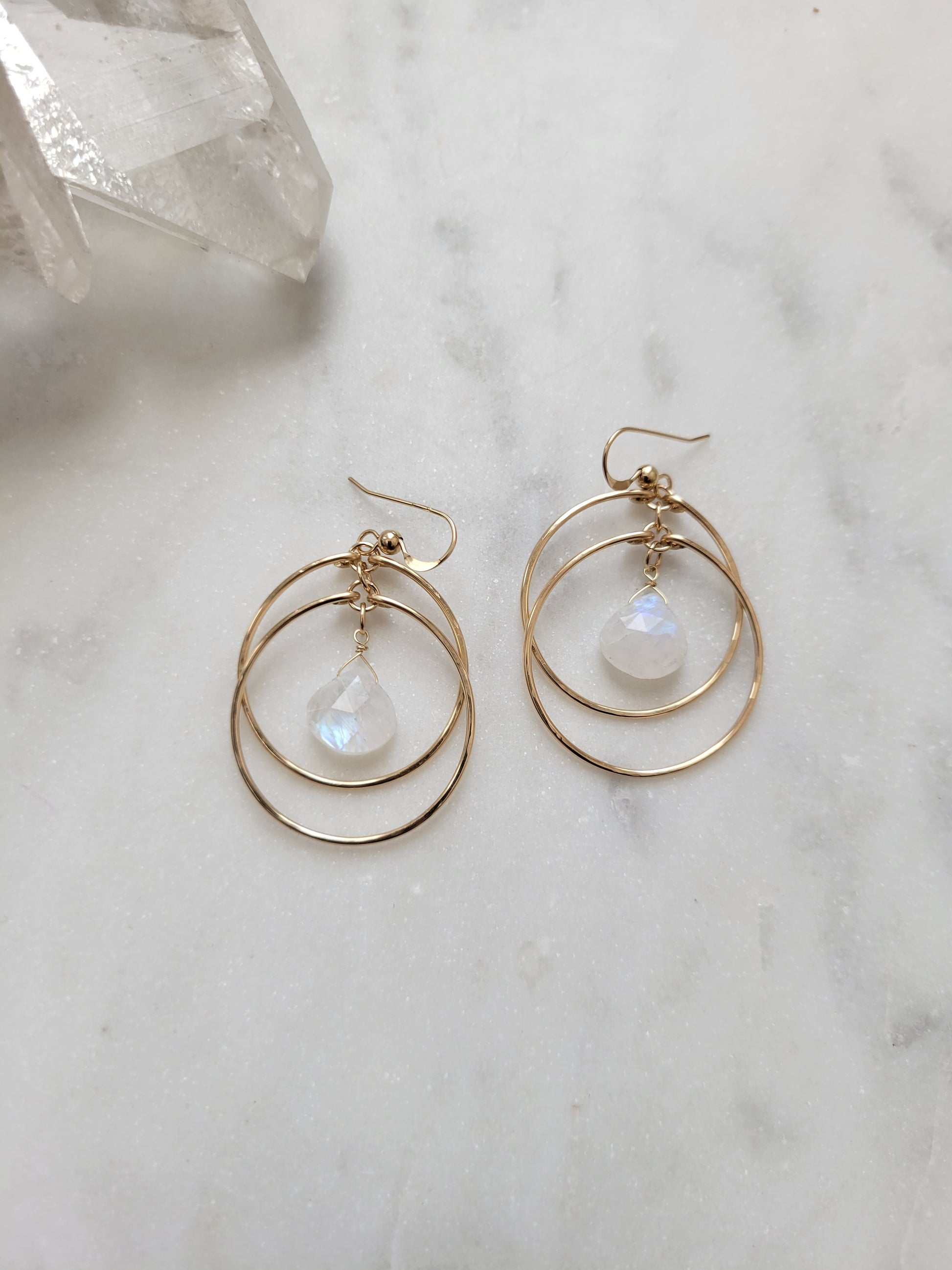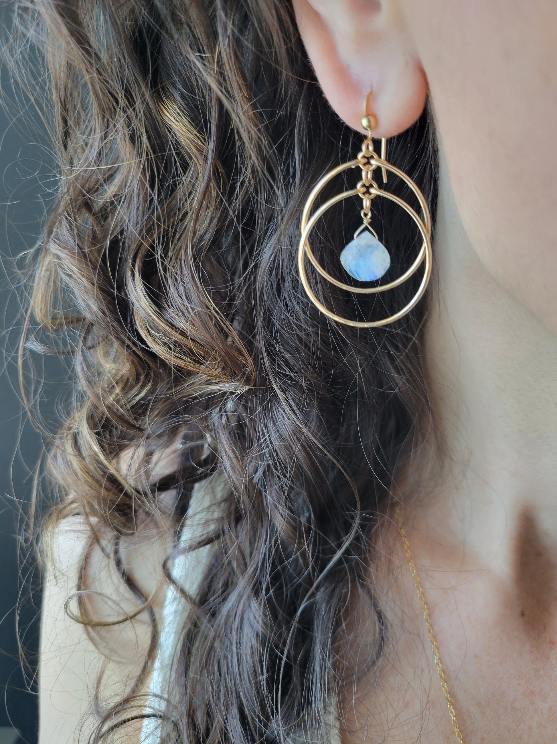 Gorgeous Crescent moonstone Hoop Earrings. The Two circles create a Crescent moon shape at the bottom of the circles. Moonstone is said to be linked to to the divine feminine. It is believed to connect with the moon's energy, bringing balance, calm, abundance, and intuition to the person wearing it.
