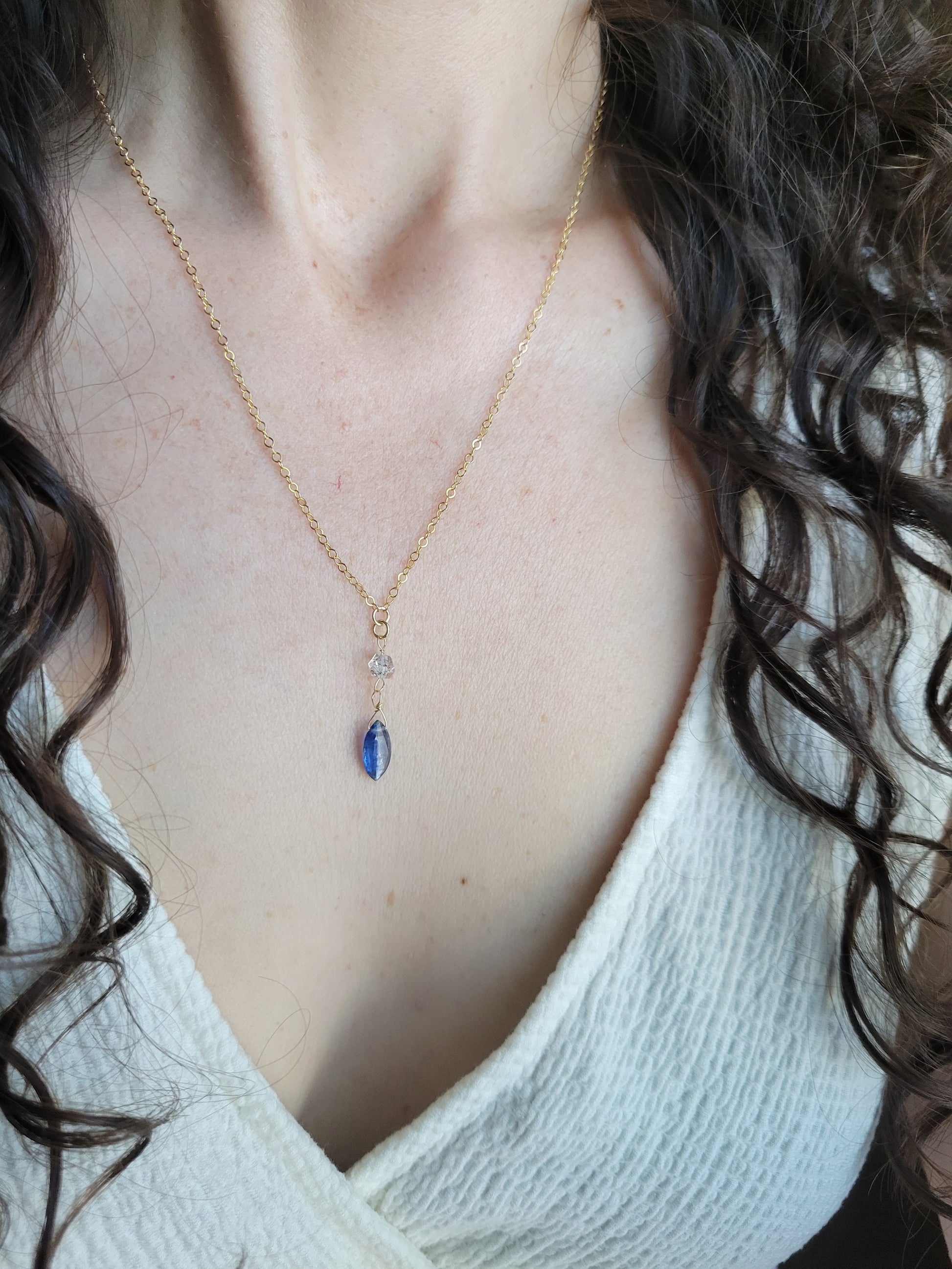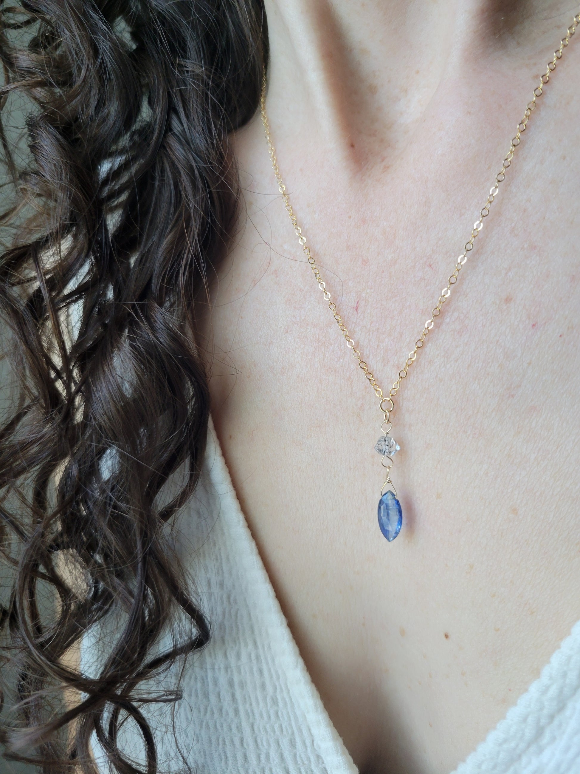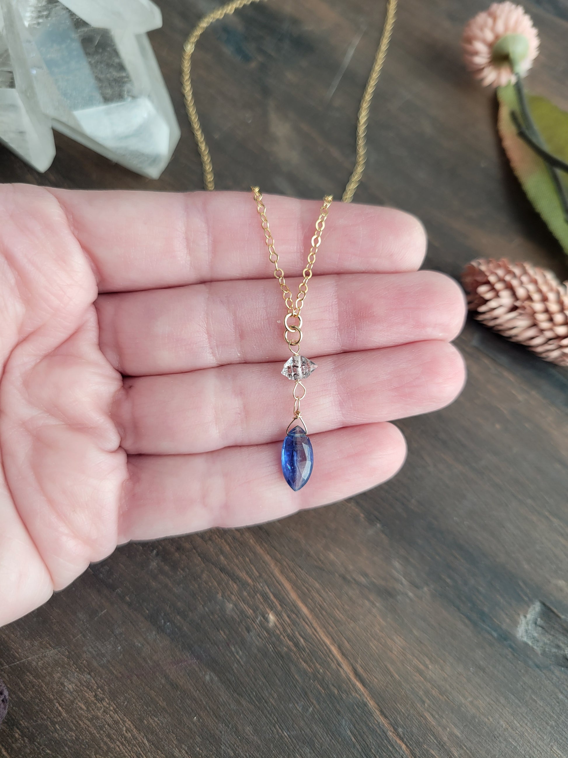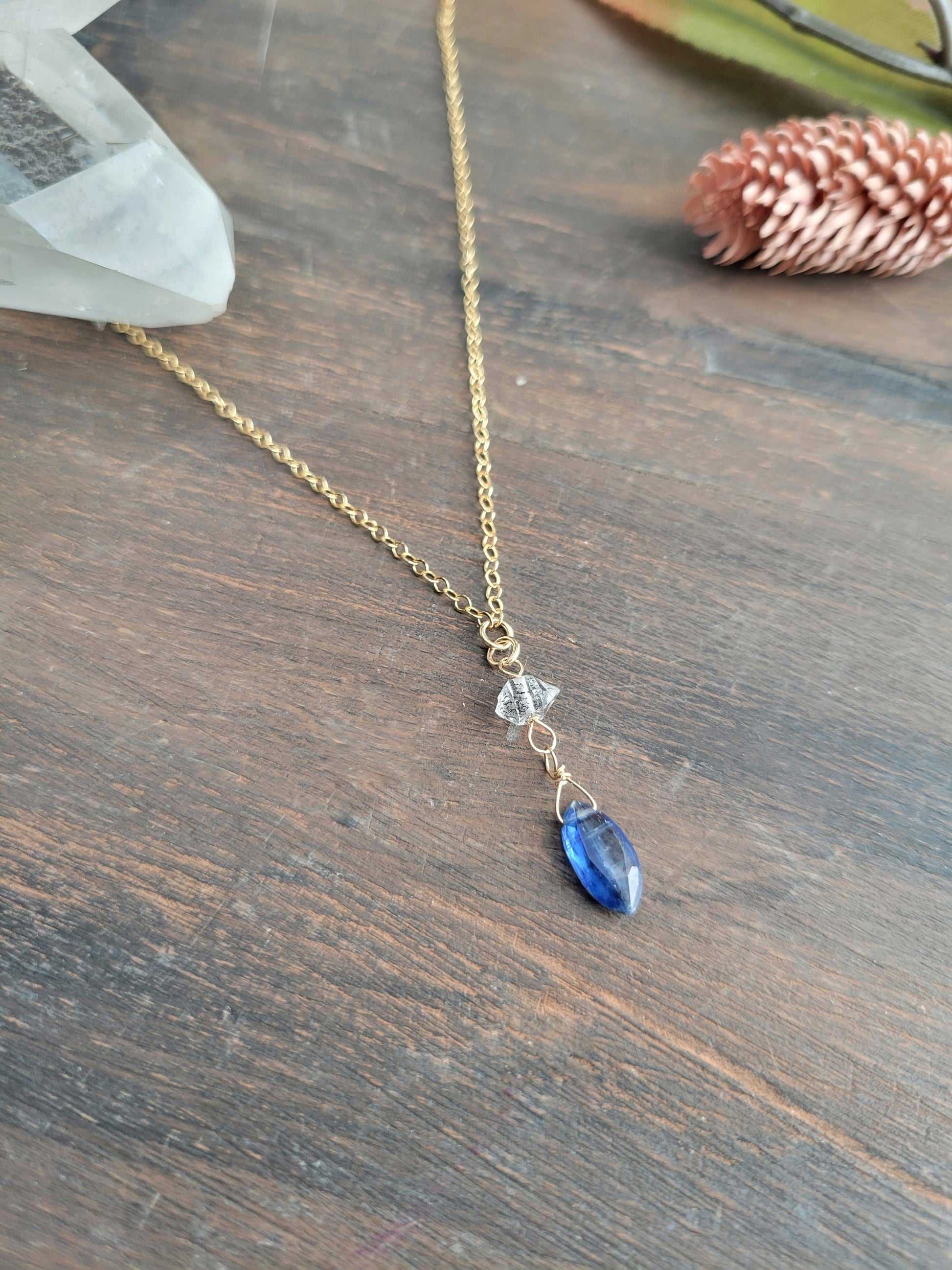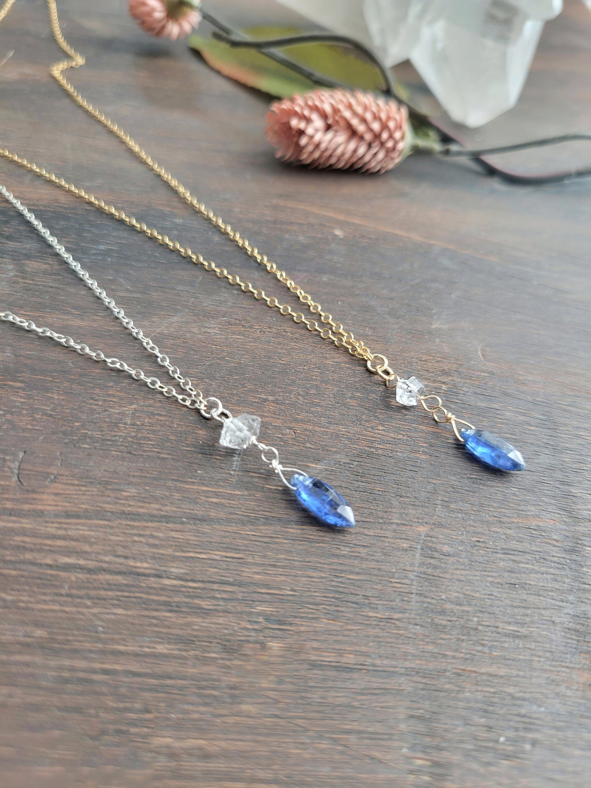 Dainty Kyanite and Herkimer Diamond Drop Necklace in your choice of 14K Gold Filled or Sterling Silver.