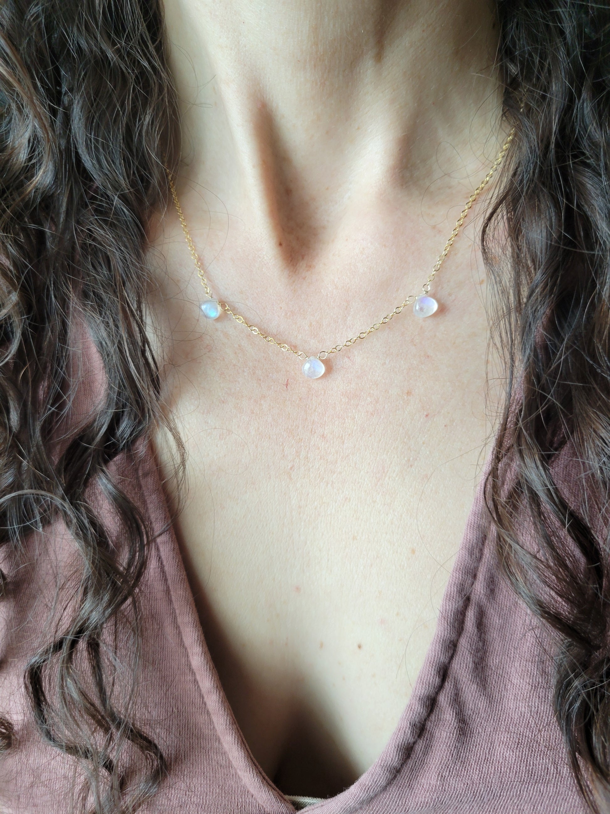 3 petite Moonstones are wire wrapped to a 14K Gold Filled Cable Chain.