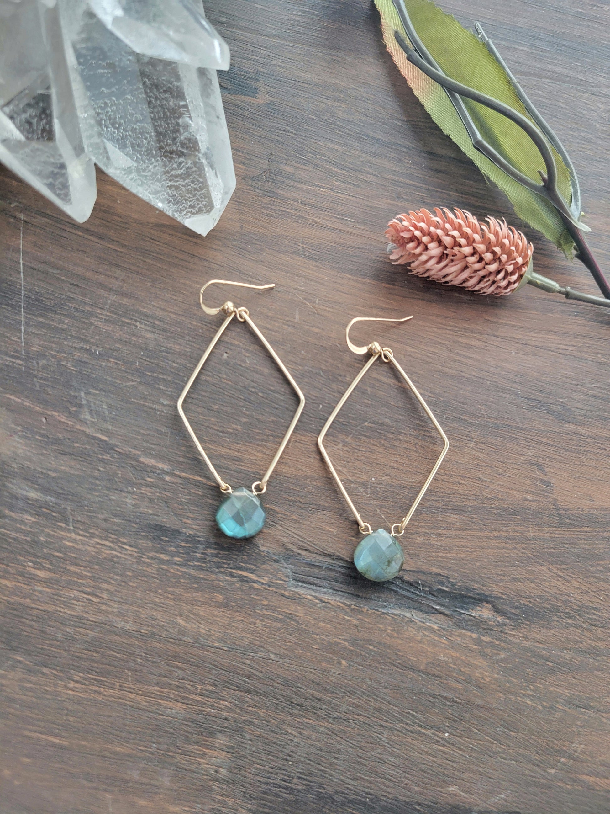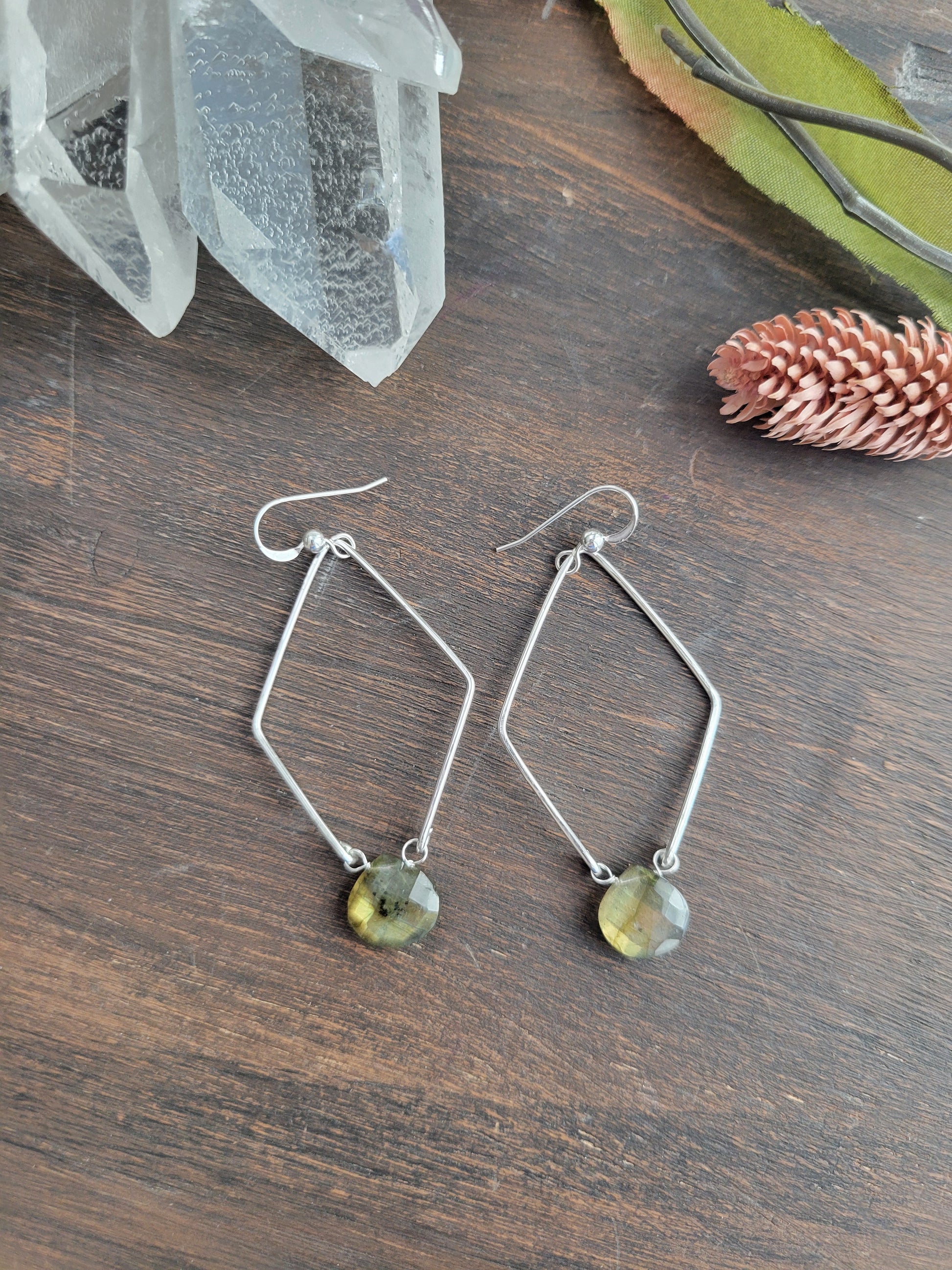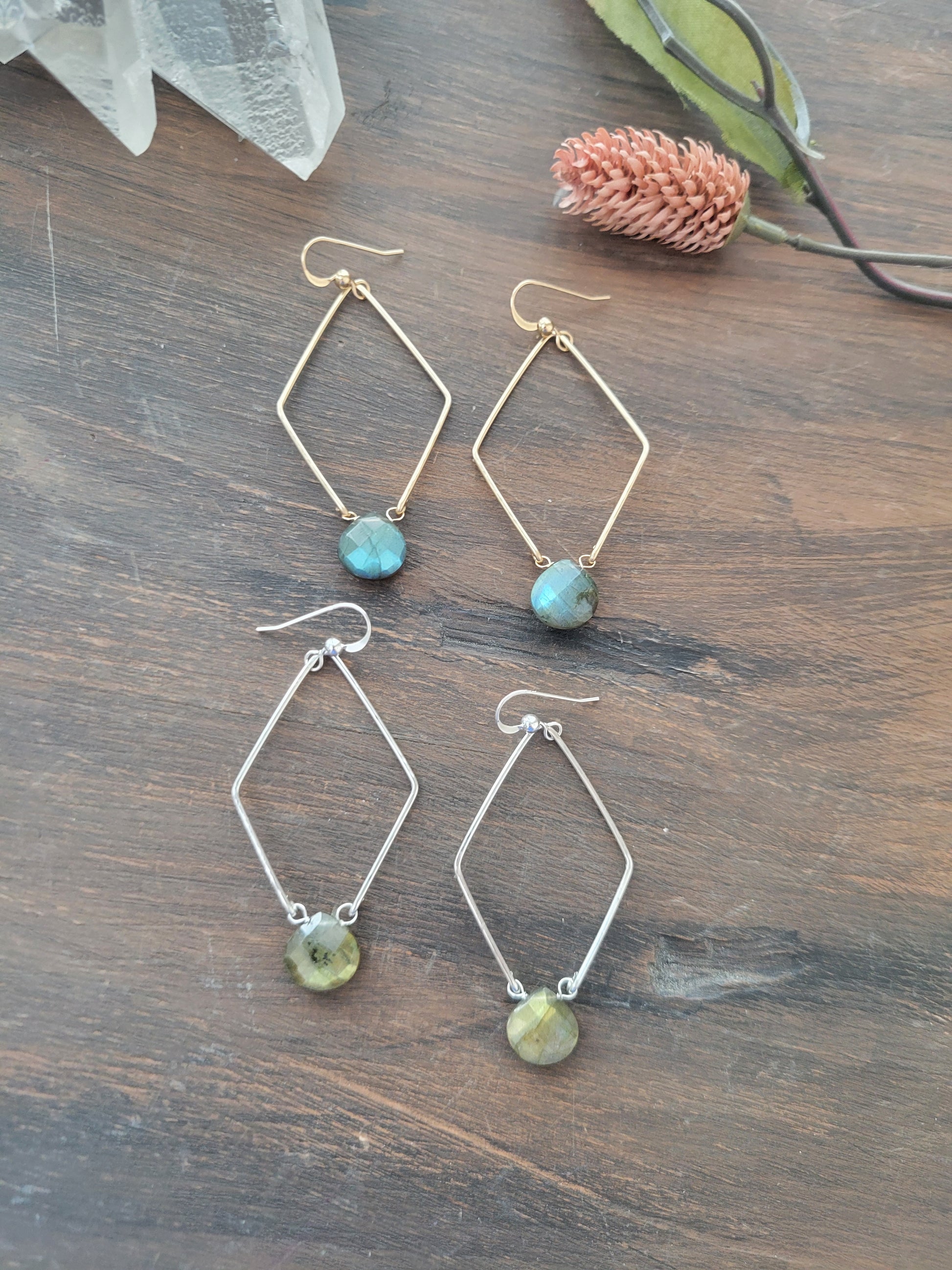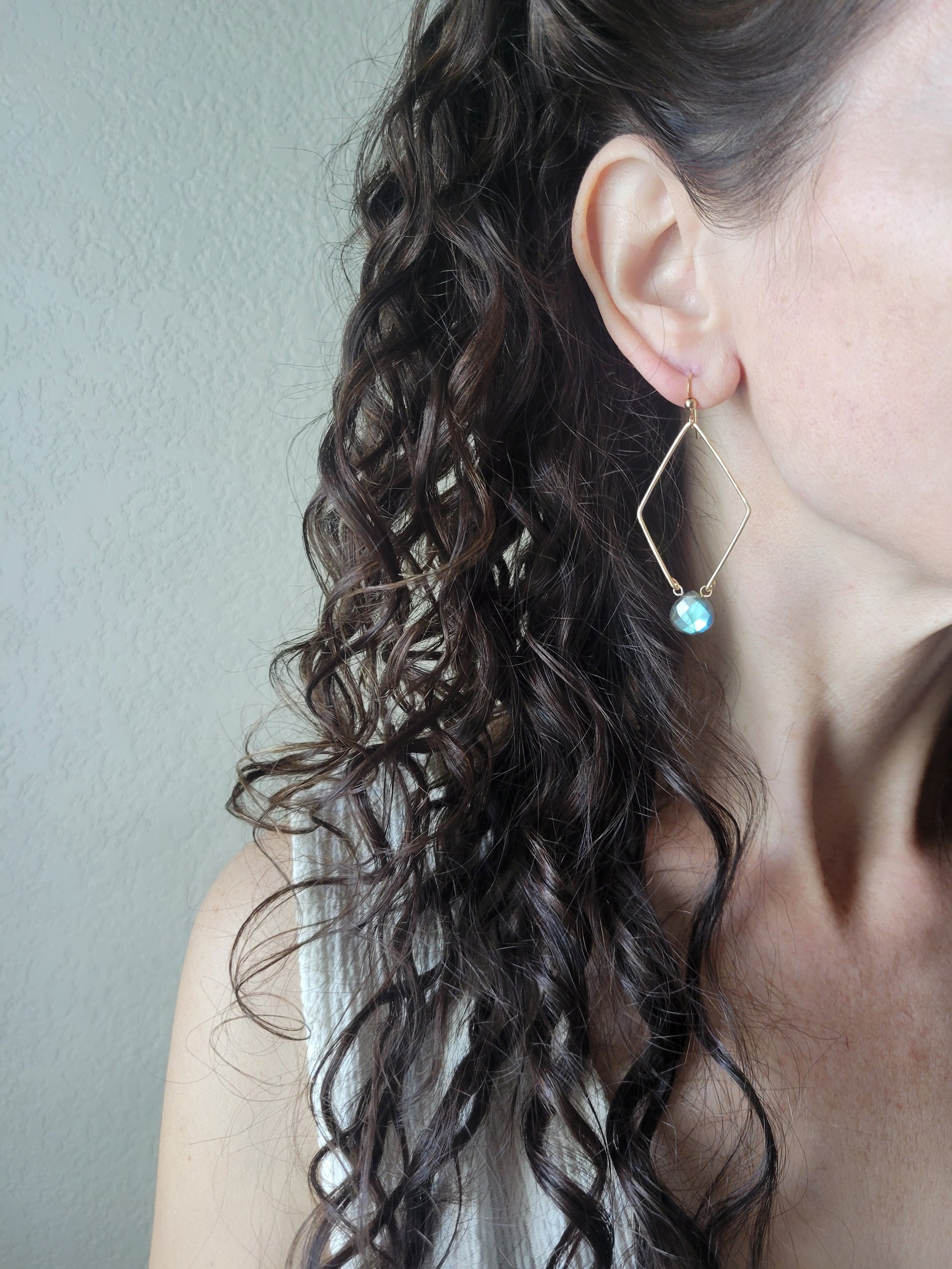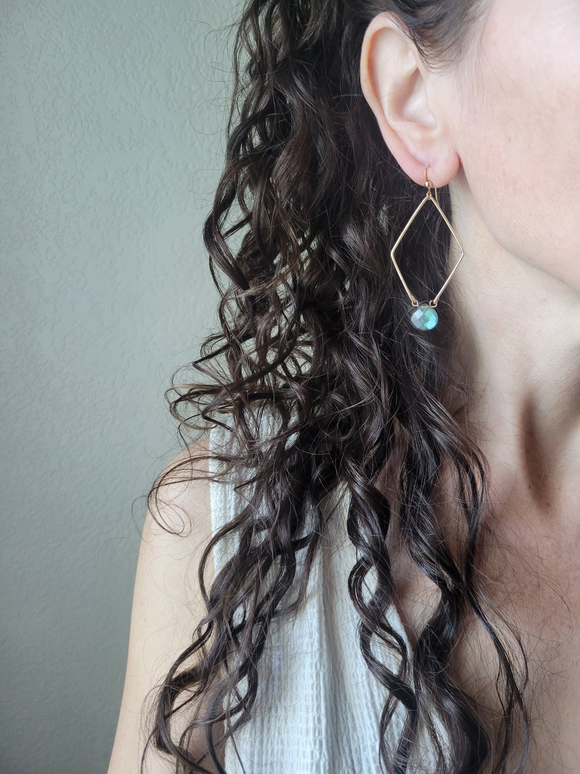 Each "diamond hoop" is hand formed and lightly hammered for texture and shape. A beautiful Labradorite hangs at the bottom.