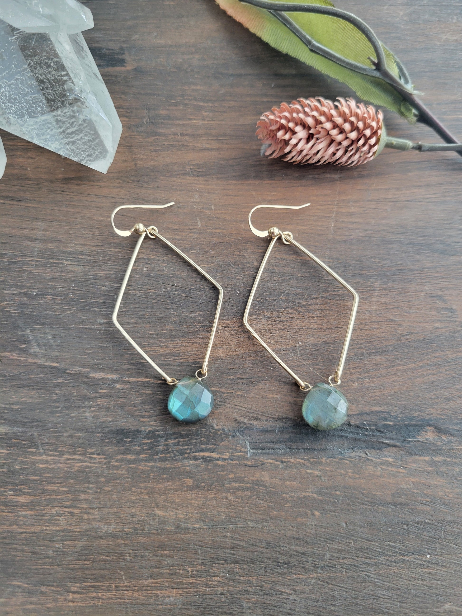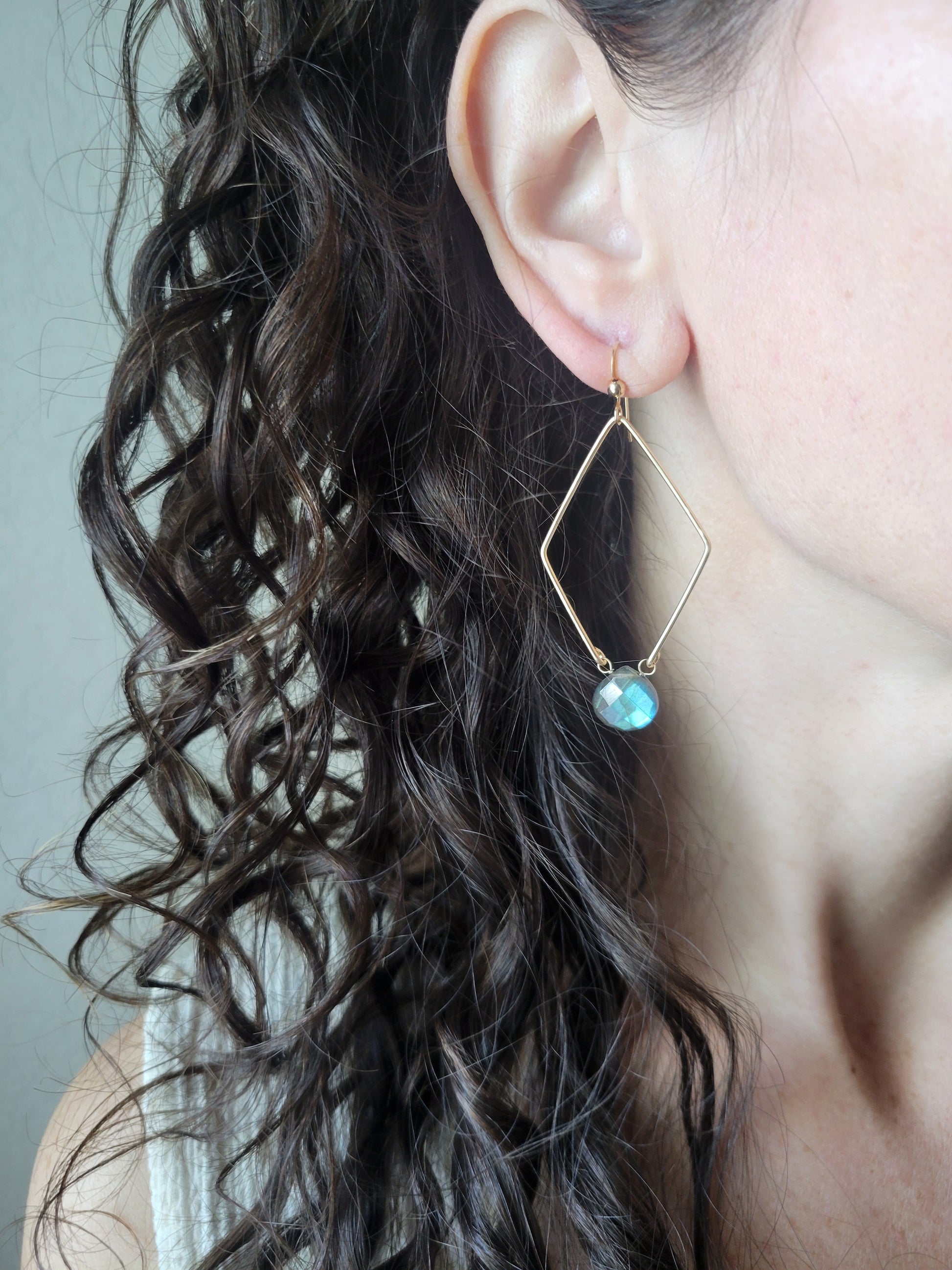 Beautiful and unique diamond shaped Labradorite Hoop Earrings in your choice of Sterling Silver or 14K Gold Filled. These are lightweight and easy to wear. A fun piece of jewelry for a friend or yourself!