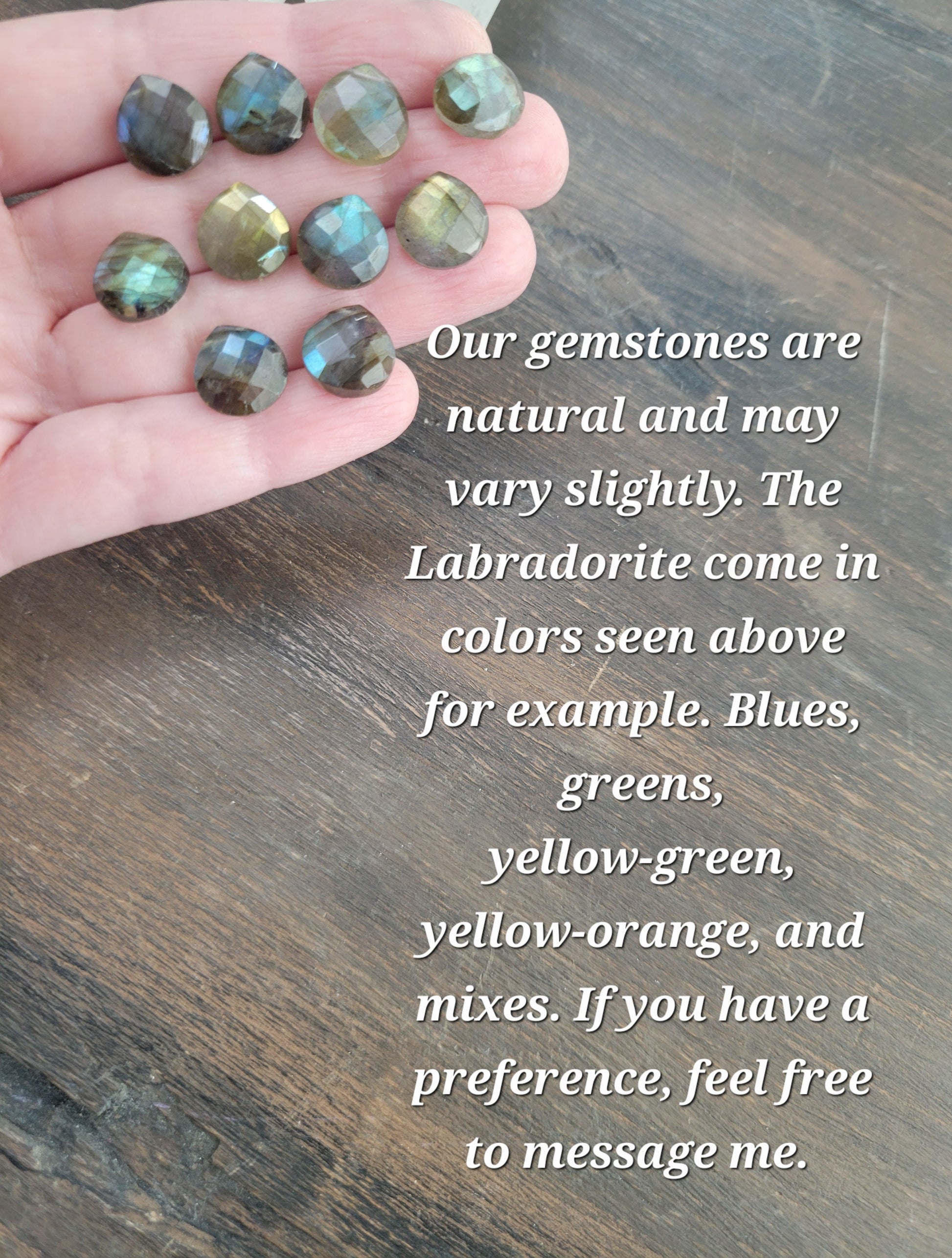 The Labradorite will vary in colors of blues, greens, yellow-green, yellow-orange, or a mix of these. If you have a preference, feel free to message me. The Labradorite may flash differently depending on lighting and angles.