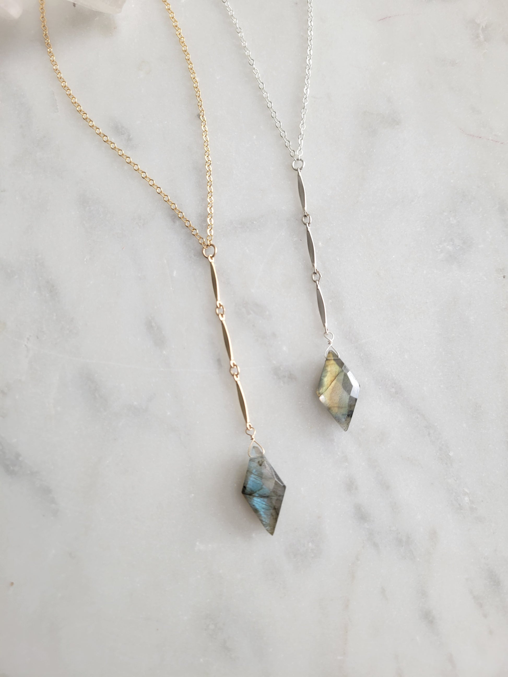 Dainty and magical Diamond Labradorite Y Necklace in your choice of Sterling Silver or 14K Gold Filled. This necklace looks beautiful worn with a V neck as shown or over the top of a t-shirt for a more casual look.