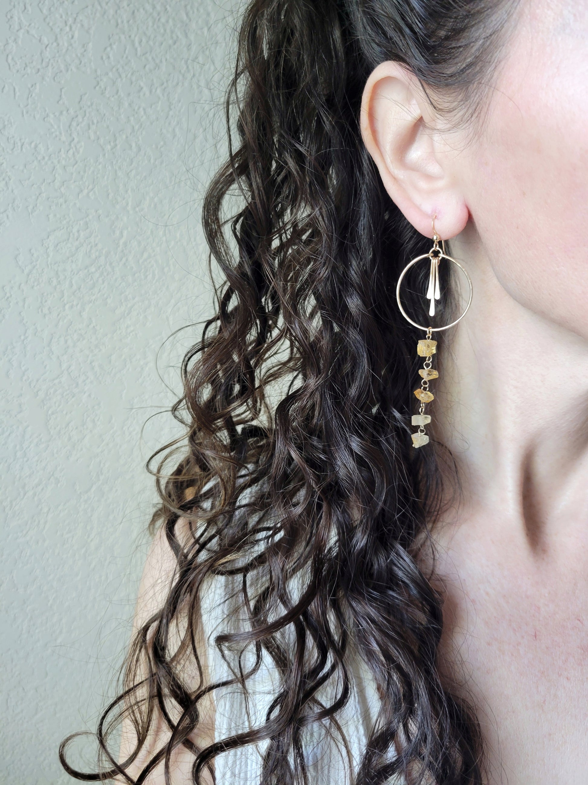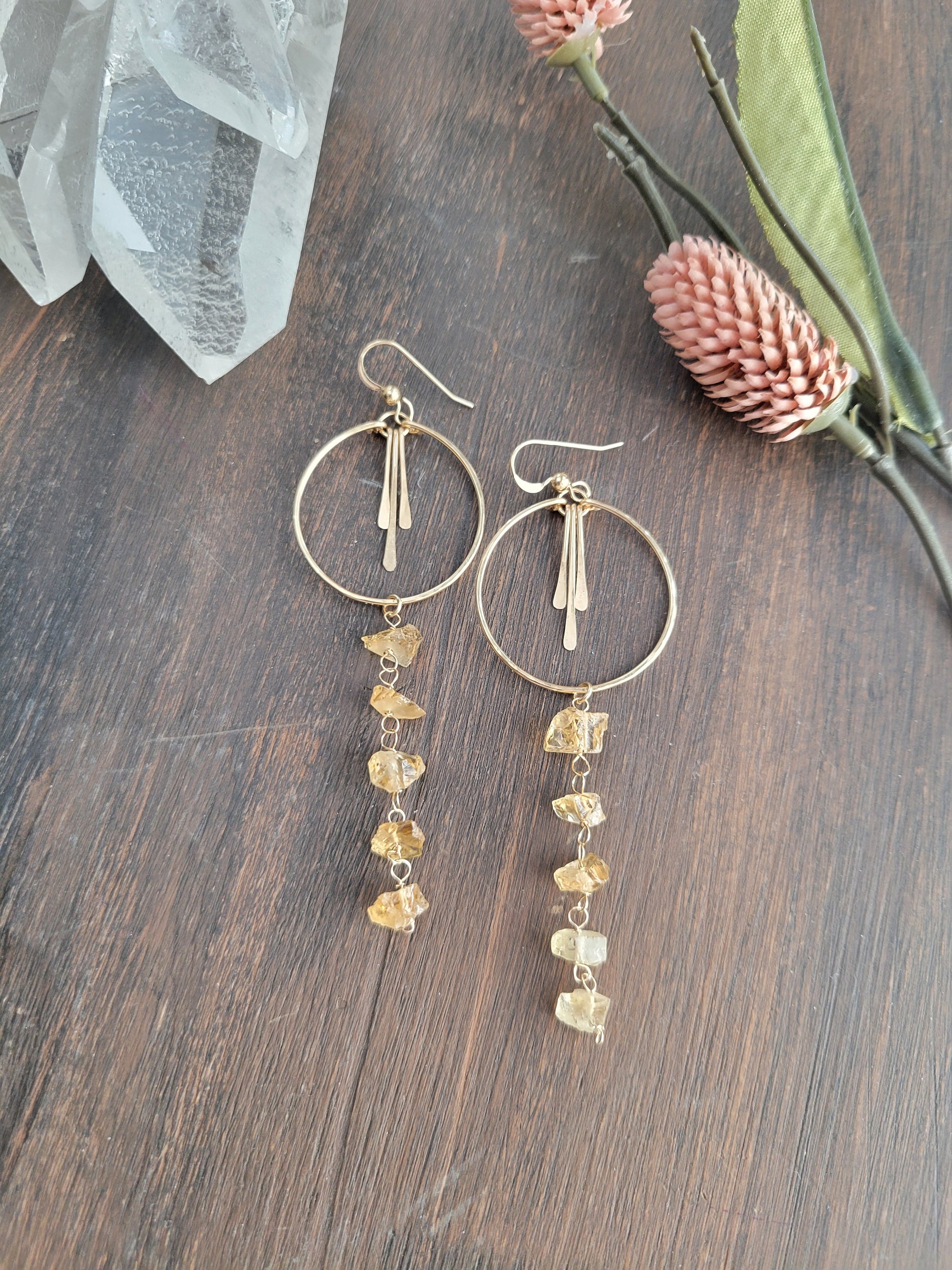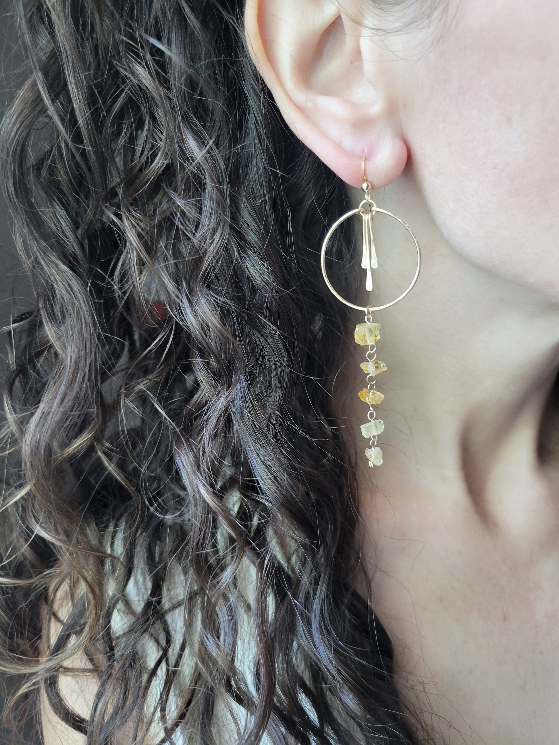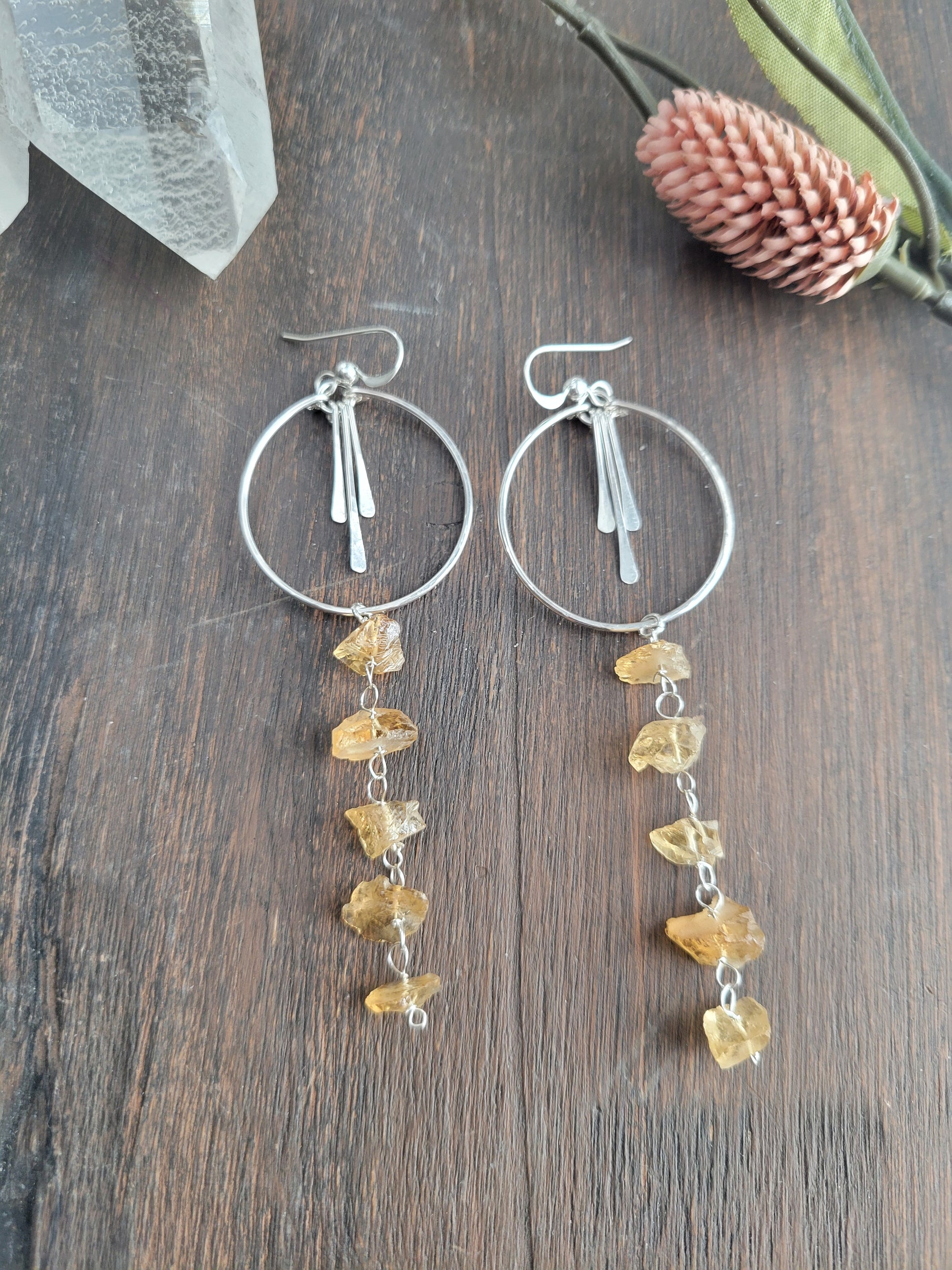 The materials used are your choice of either 14K Gold Filled or Sterling Silver. The circles are hand formed and hand hammered as well as the fringe pieces. Five raw Citrine gemstone chips are wire wrapped together dangling on each earring.