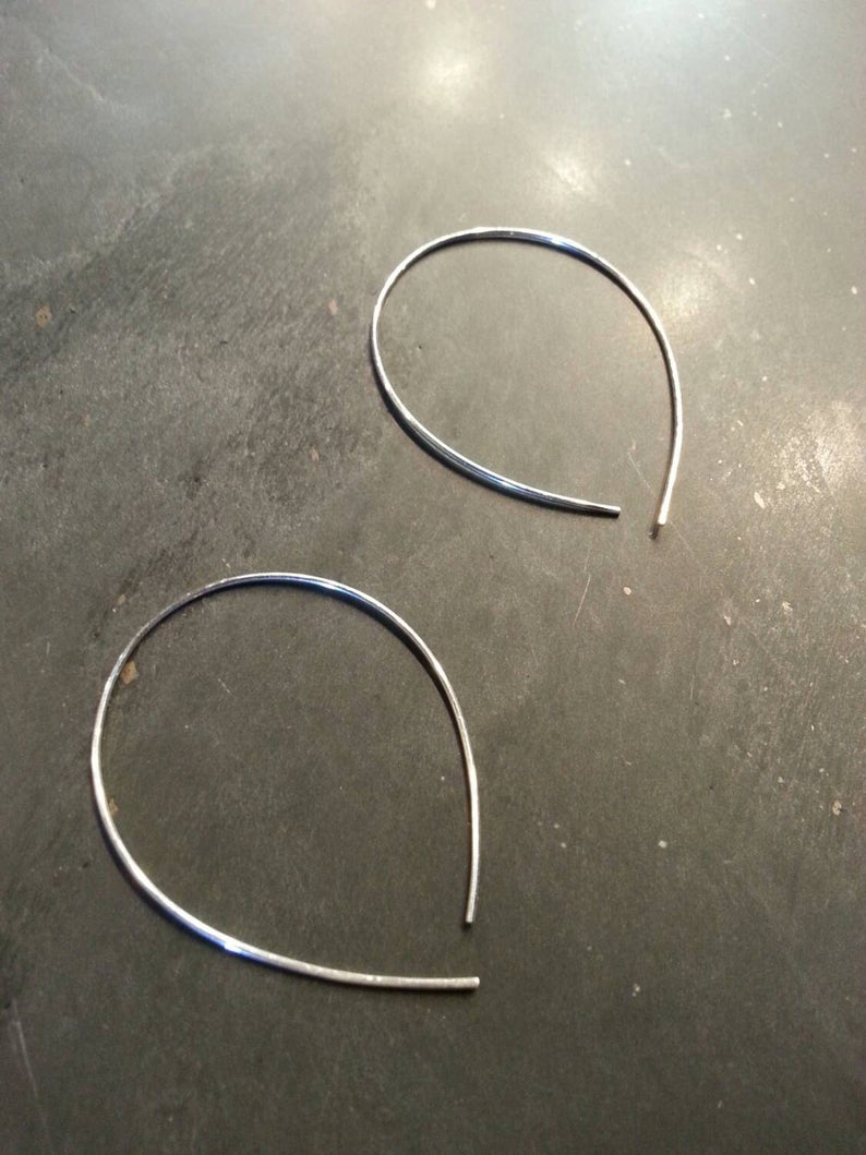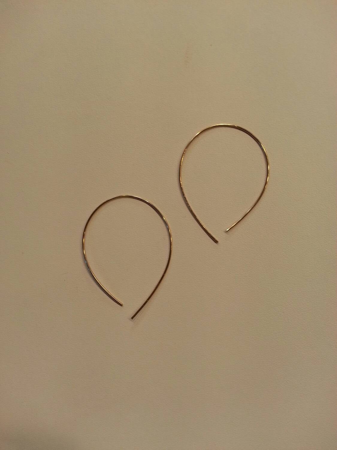 The little details: These earrings are hand hammered for texture and strength. The longer side of the earrings are hammered a little more than the other side to give them a more 'flattened' look. You insert these earrings through the shorter end and they hang approx. 1 3/4 inches. They are available in either 14K Gold Filled or Sterling Silver. (Please specify your preference in the drop down box provided when ordering).