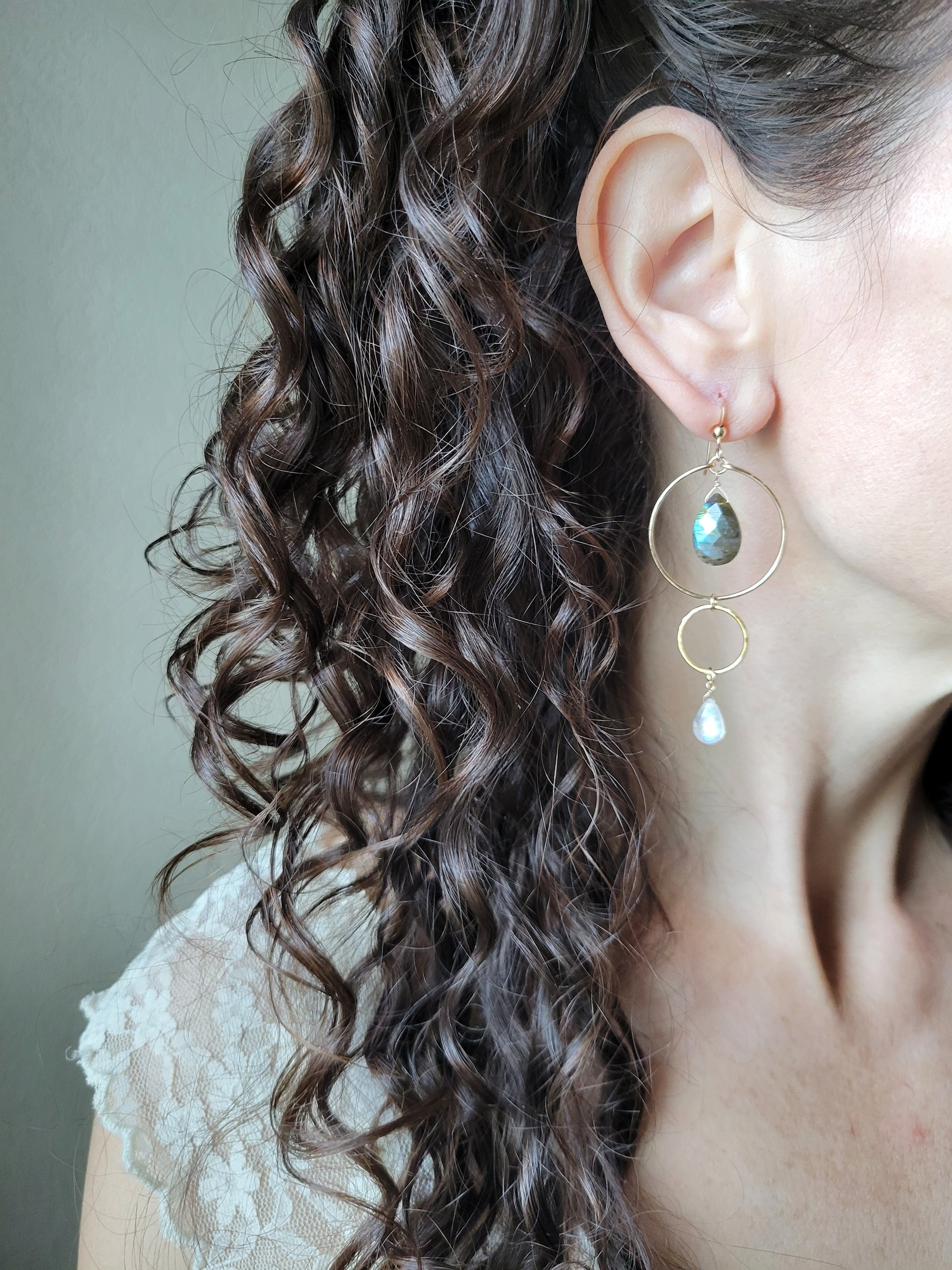 Gorgeous Labradorite and Moonstone Dangle Hoop Earrings in your choice of Sterling Silver or 14K Gold Filled.