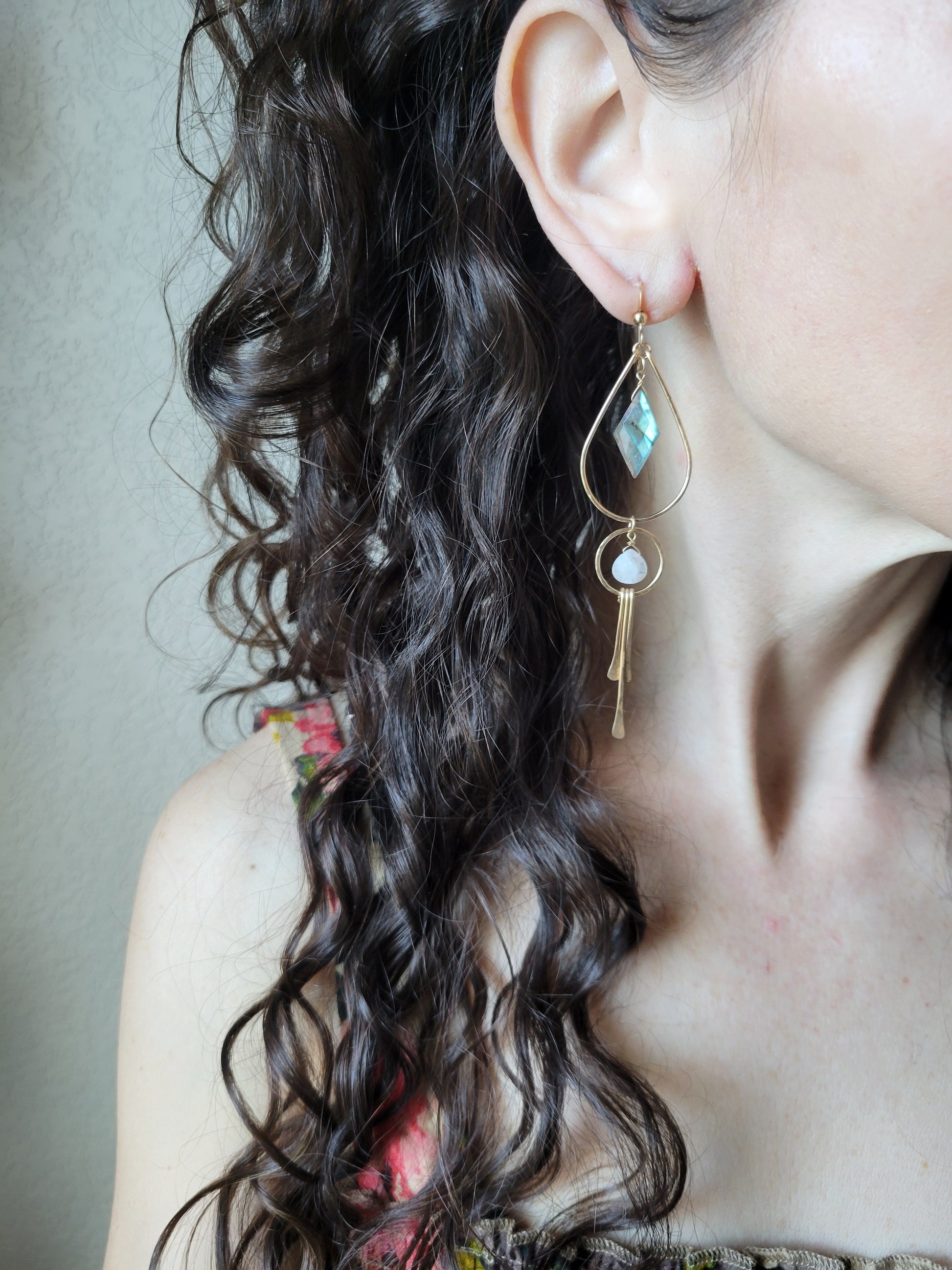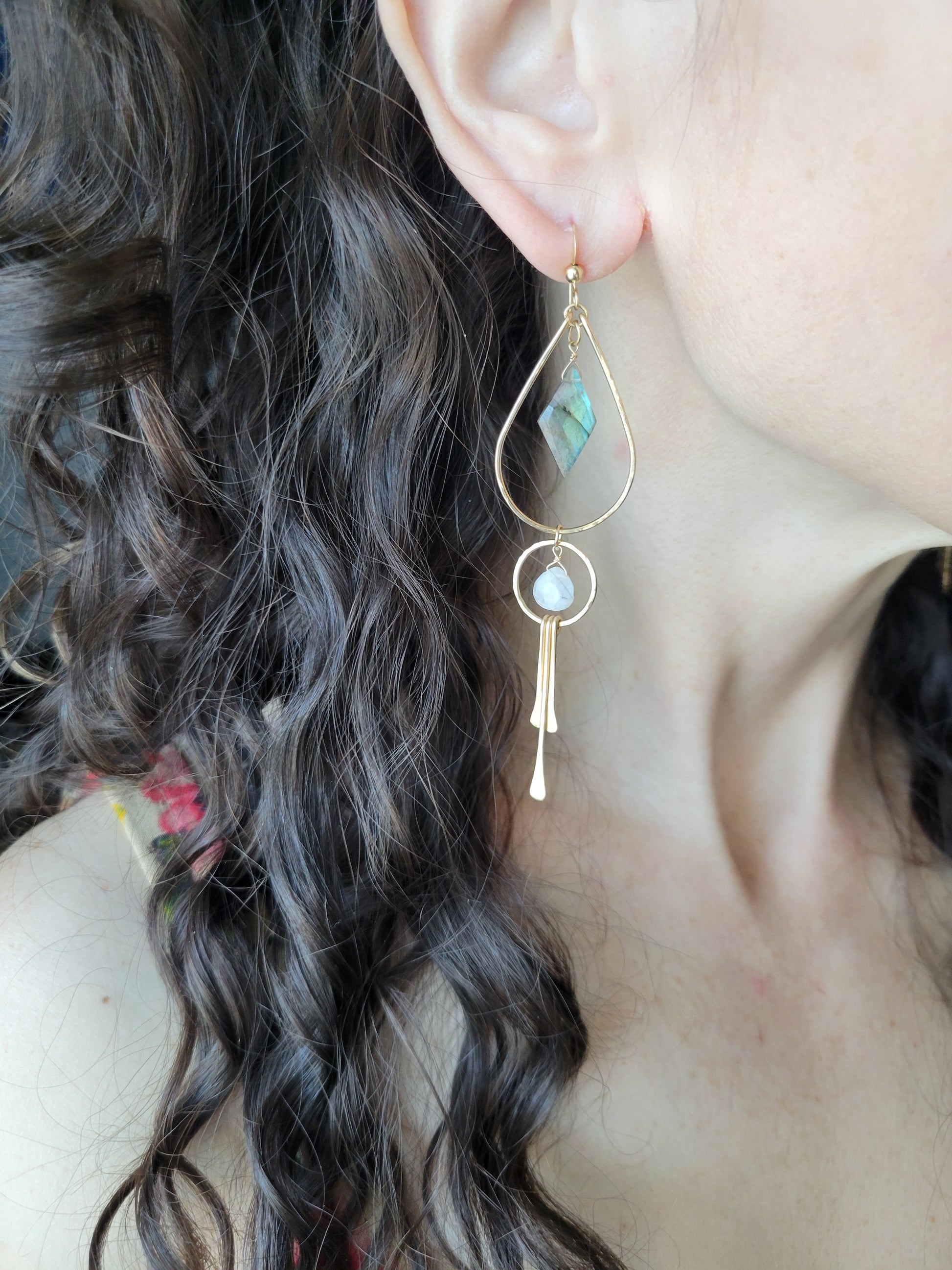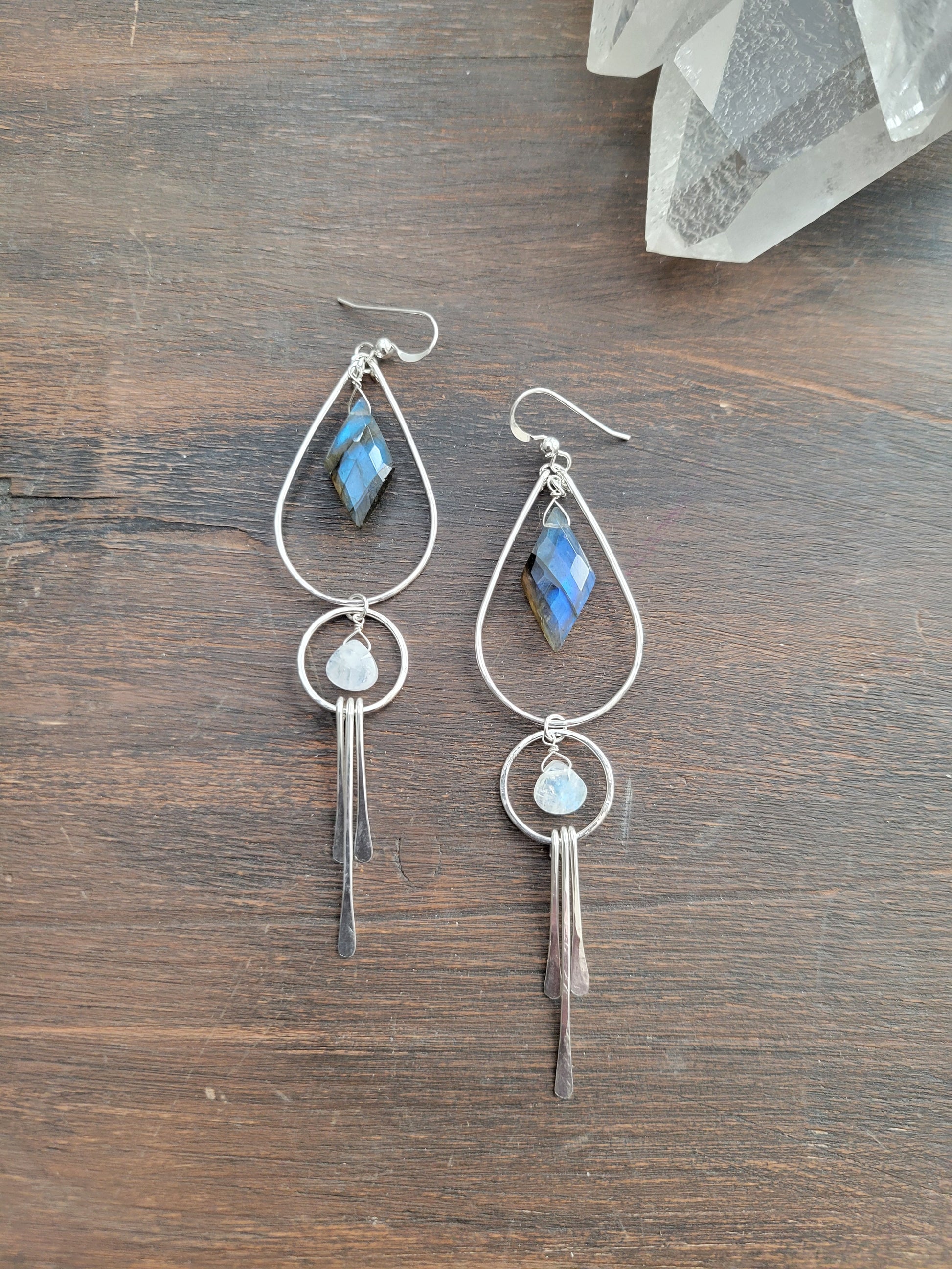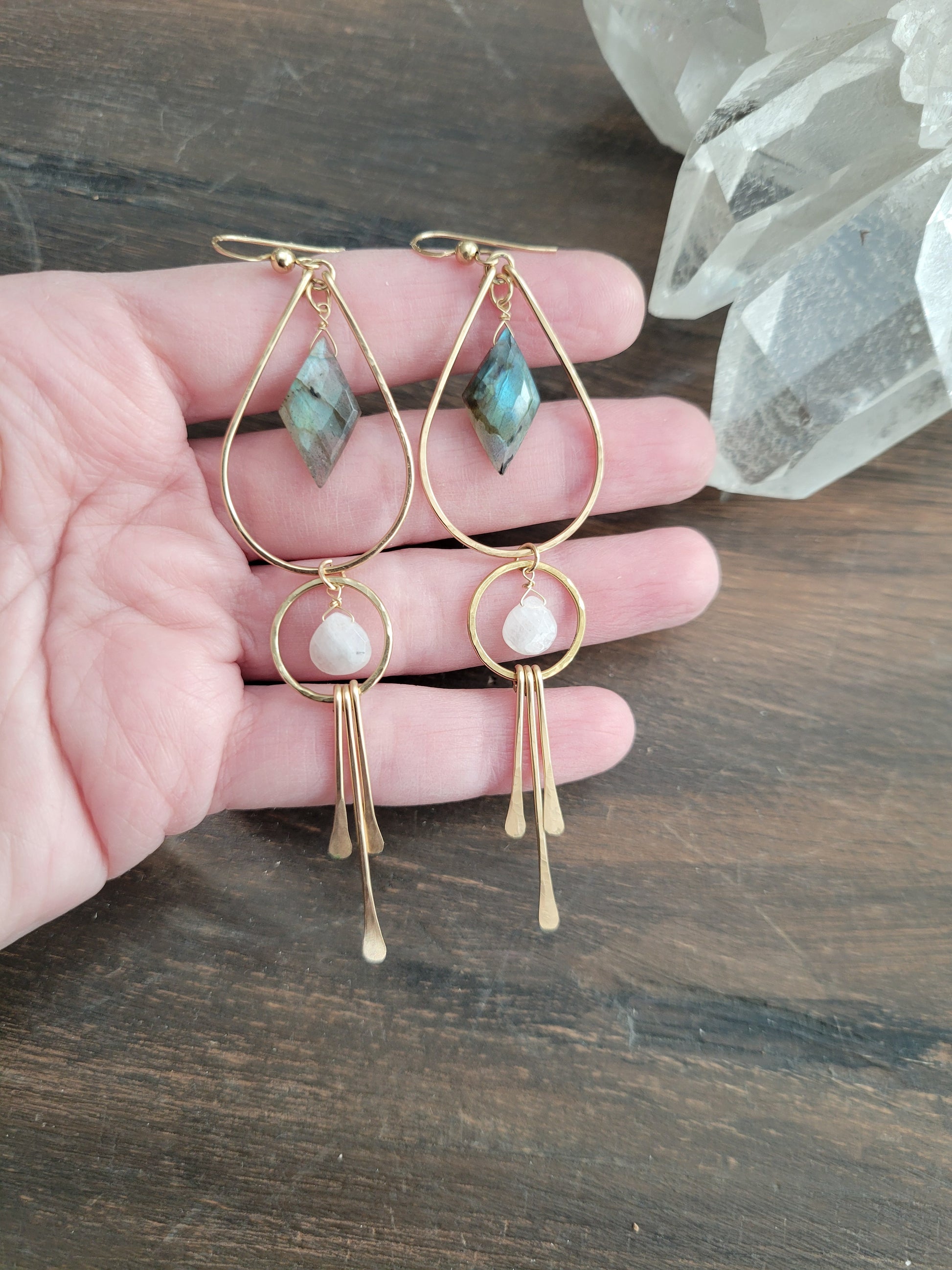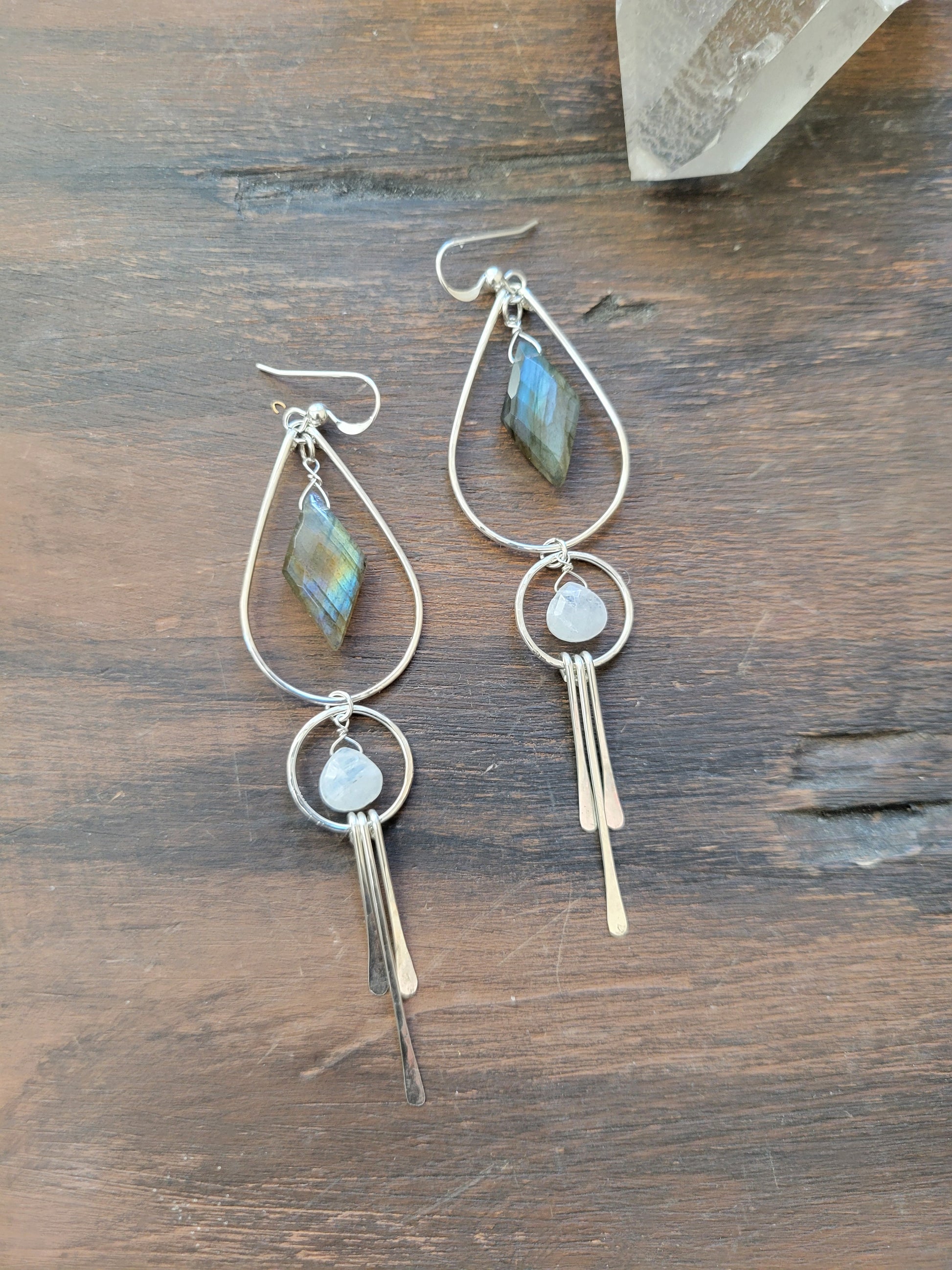 Each piece is hammered for texture and shape. The top stone is a gorgeous diamond shaped Labradorite Gem and the bottom is a cute and petite Moonstone Gem.