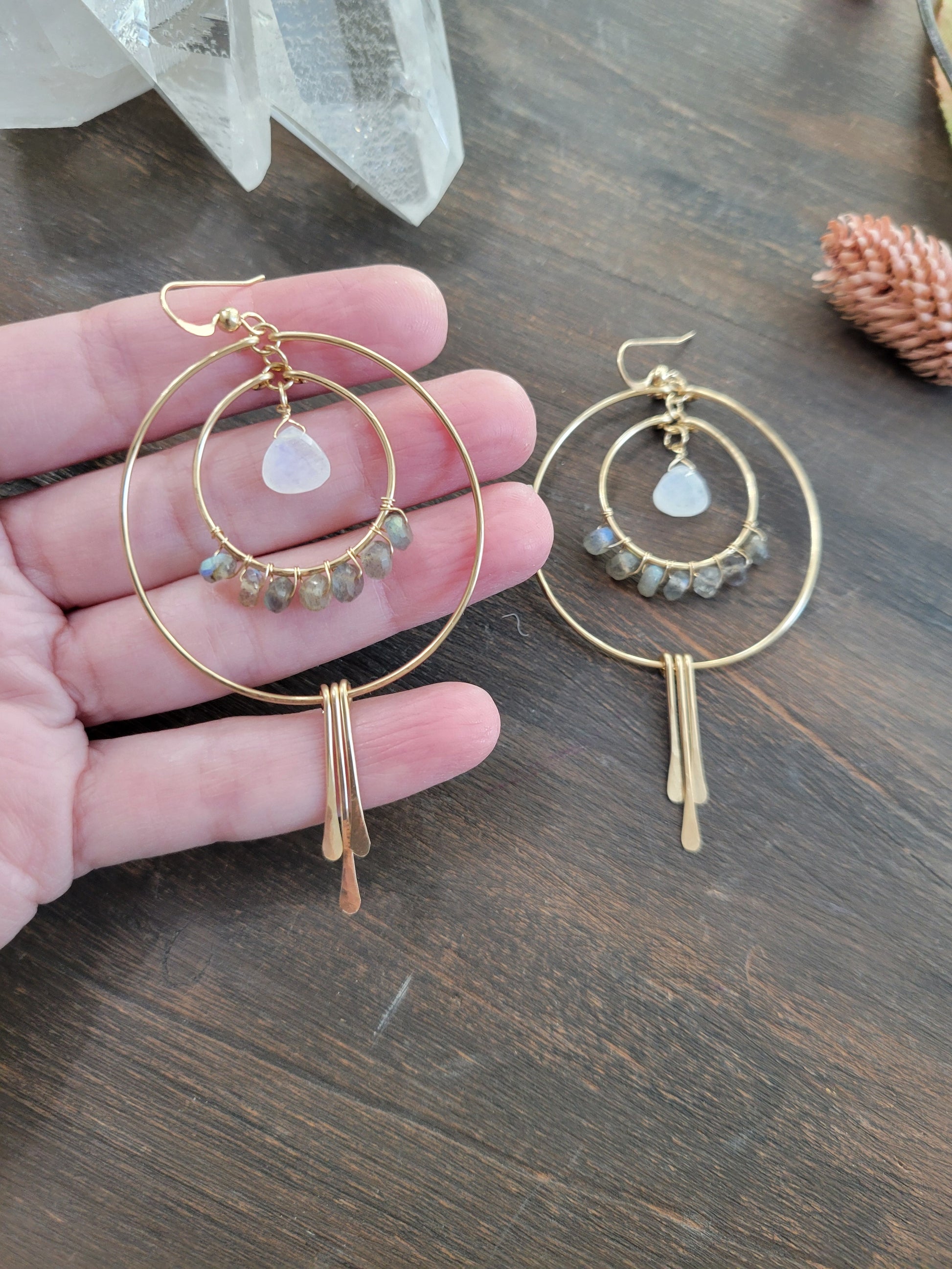 Each piece is hand formed and hammered from your choice of Sterling Silver or 14K Gold Filled Materials. The Moonstone dangles in the center of the smaller circle and the Labradorite are hand wire wrapped along the smaller circle.