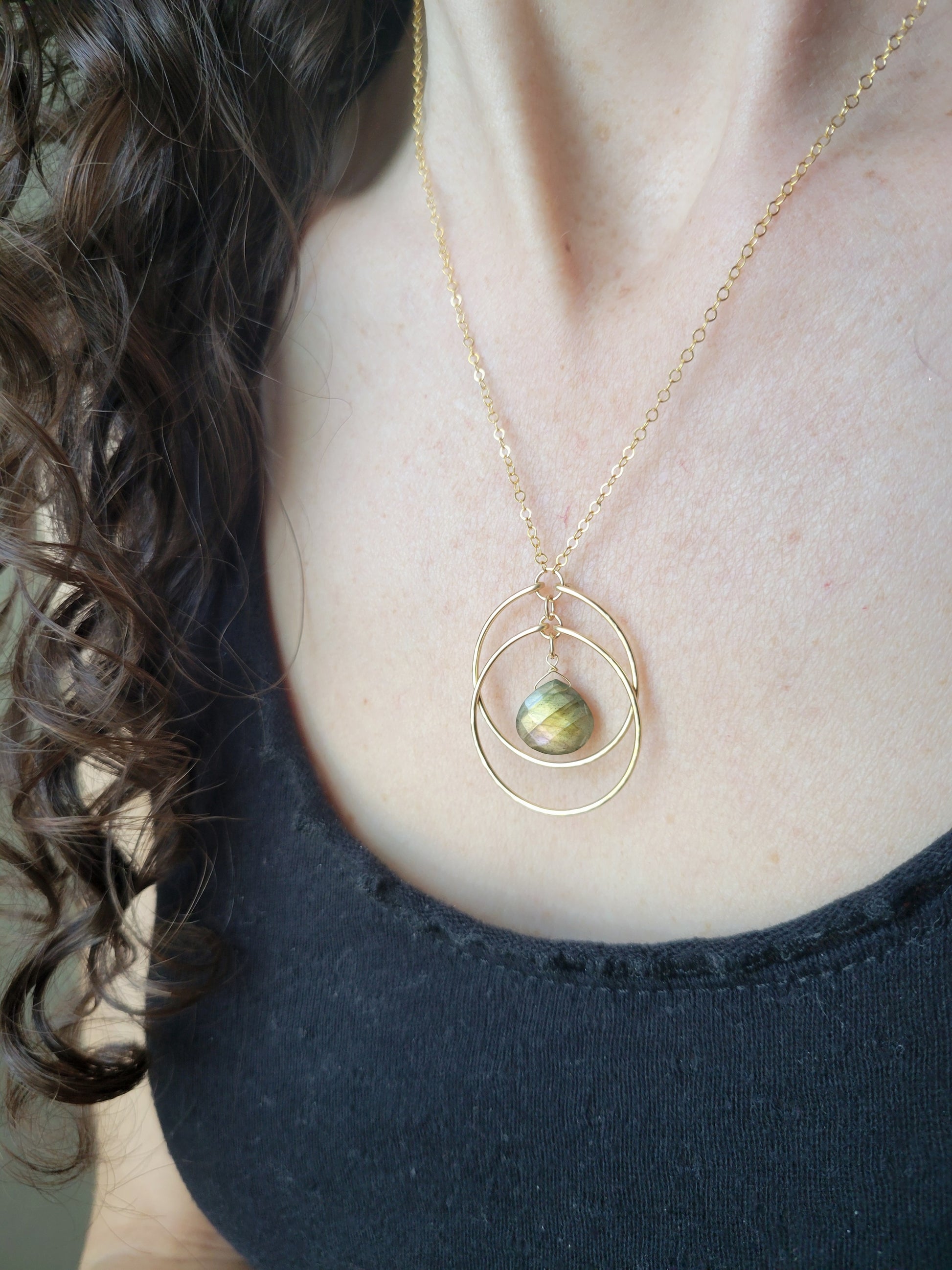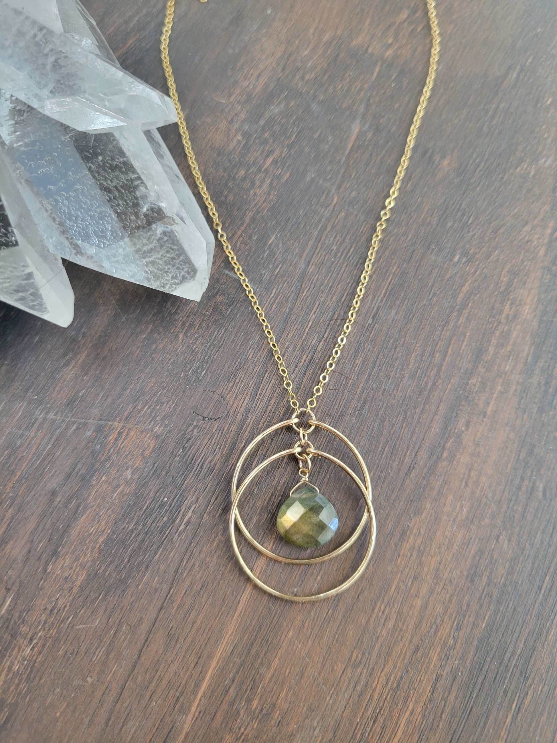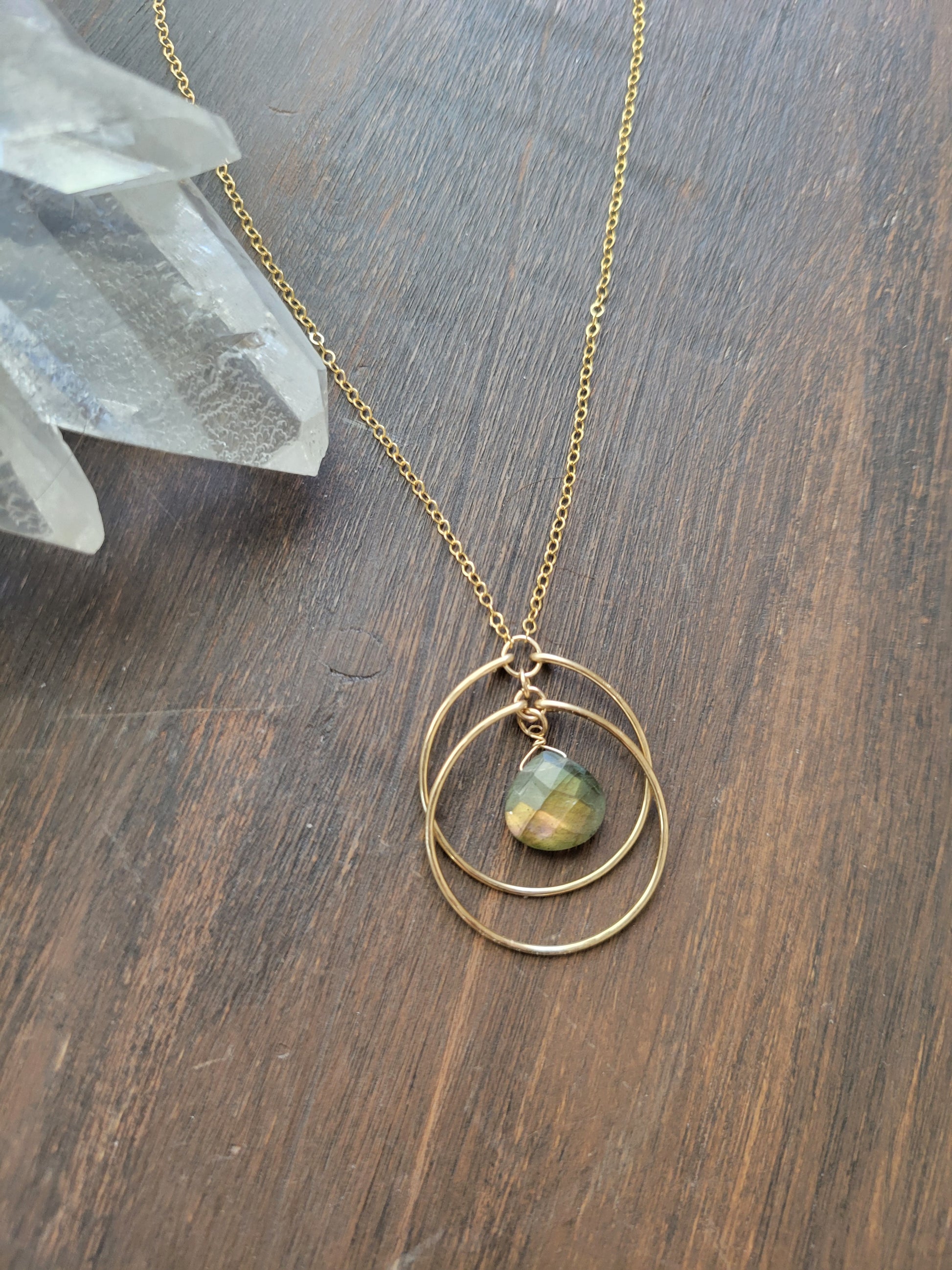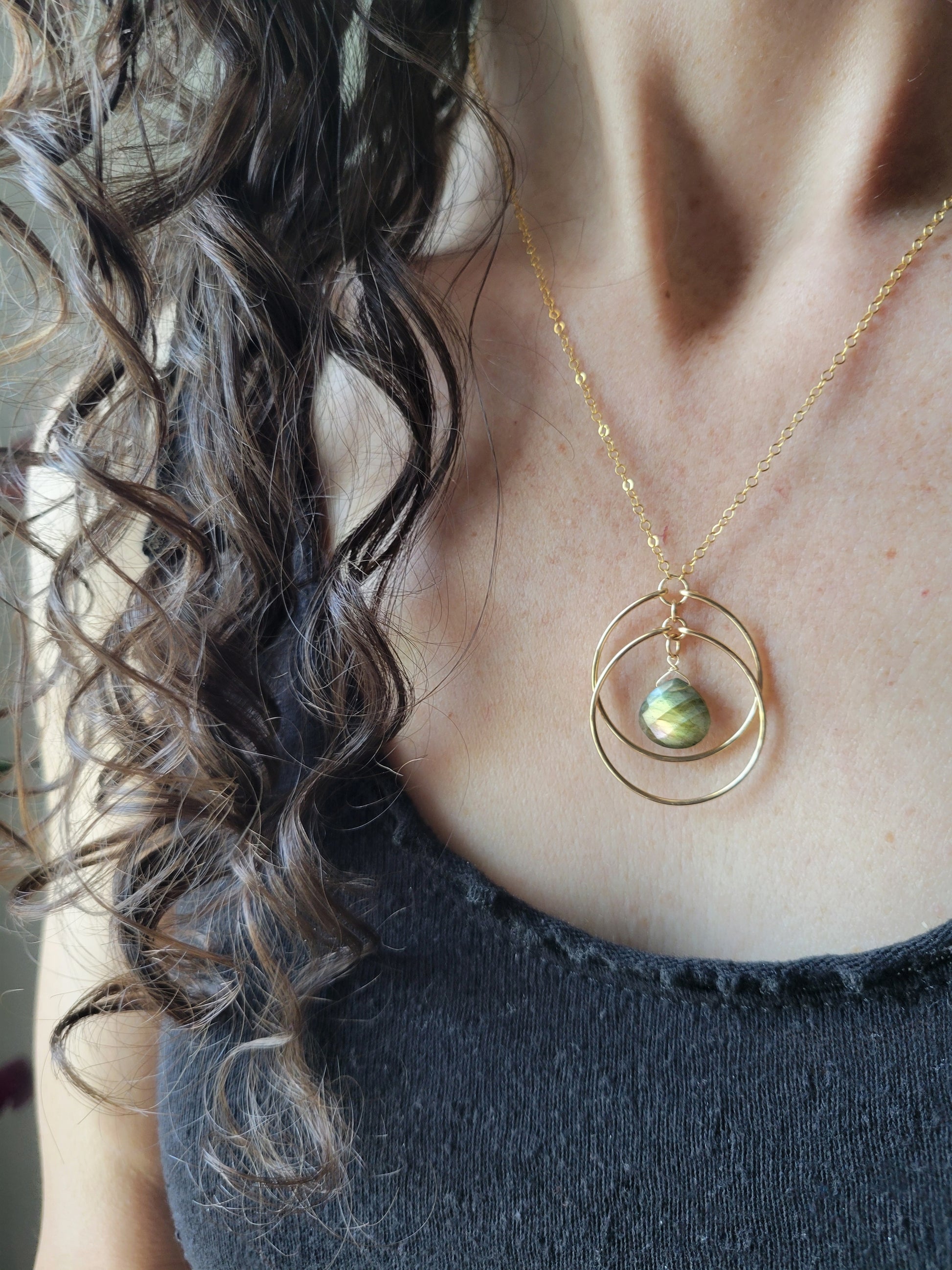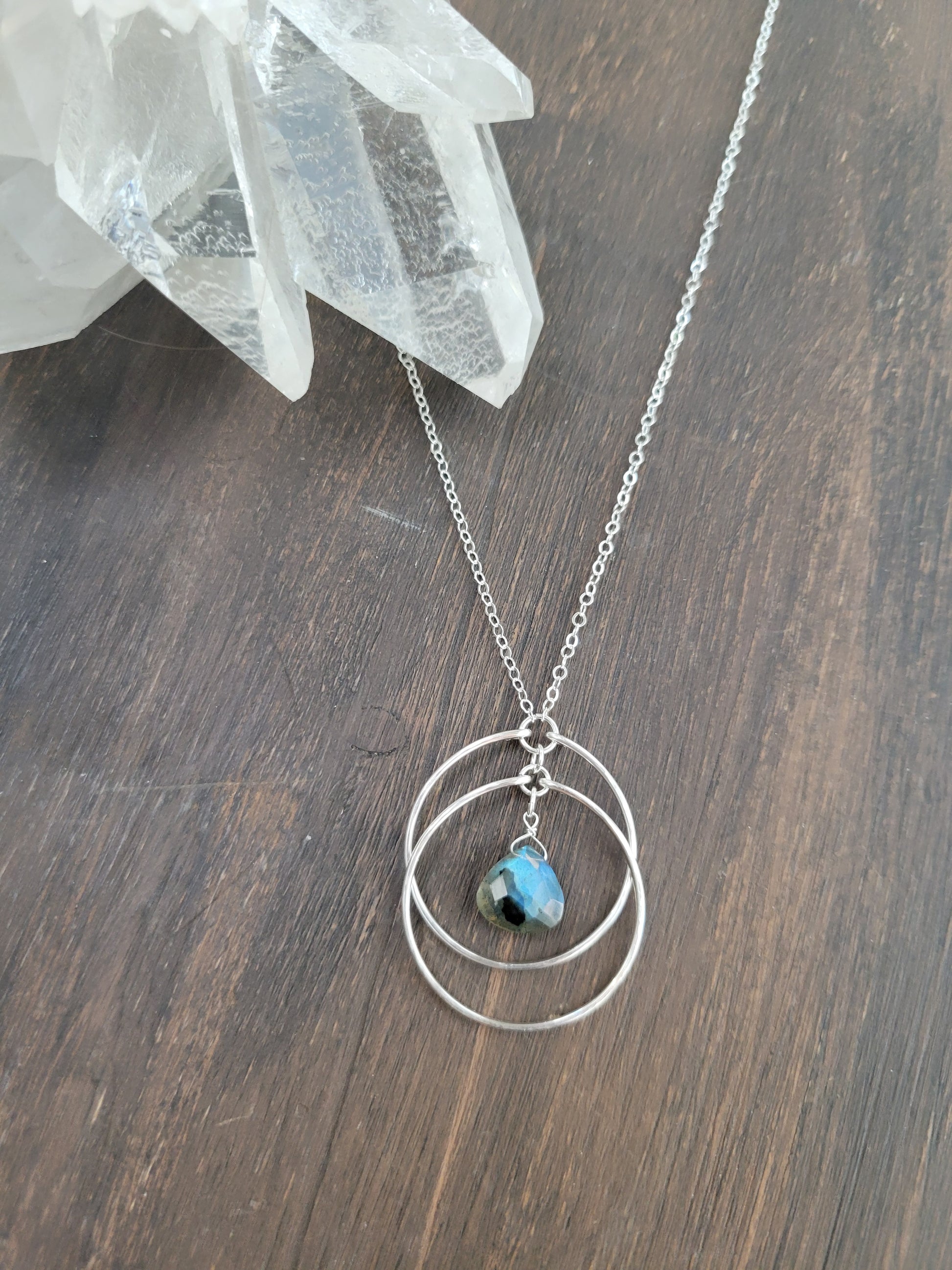 Beautiful Labradorite Crescent Moon Necklace. The two circles at the bottom uniquely create a crescent moon shape. A wonderful gift for a friend or yourself!