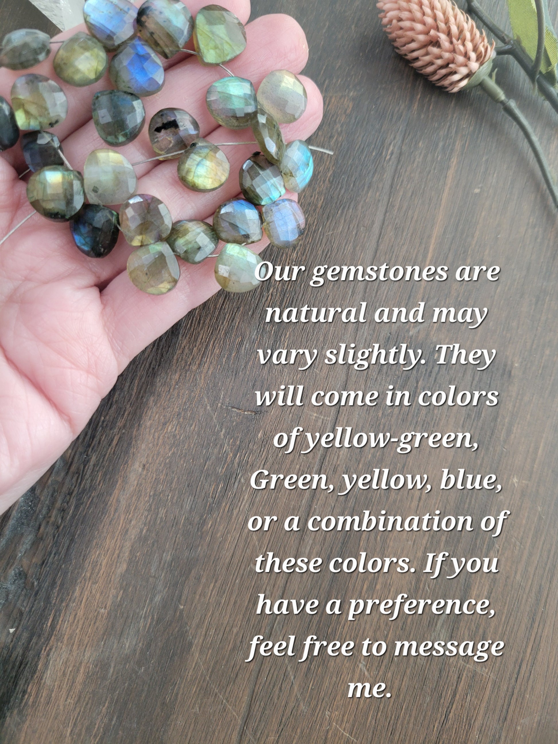 These labradorite's have lovely flash. They come in colors of blues, greens, yellow-green, and a combination of these. If you have a preference, feel free to leave a not at checkout or message me.
