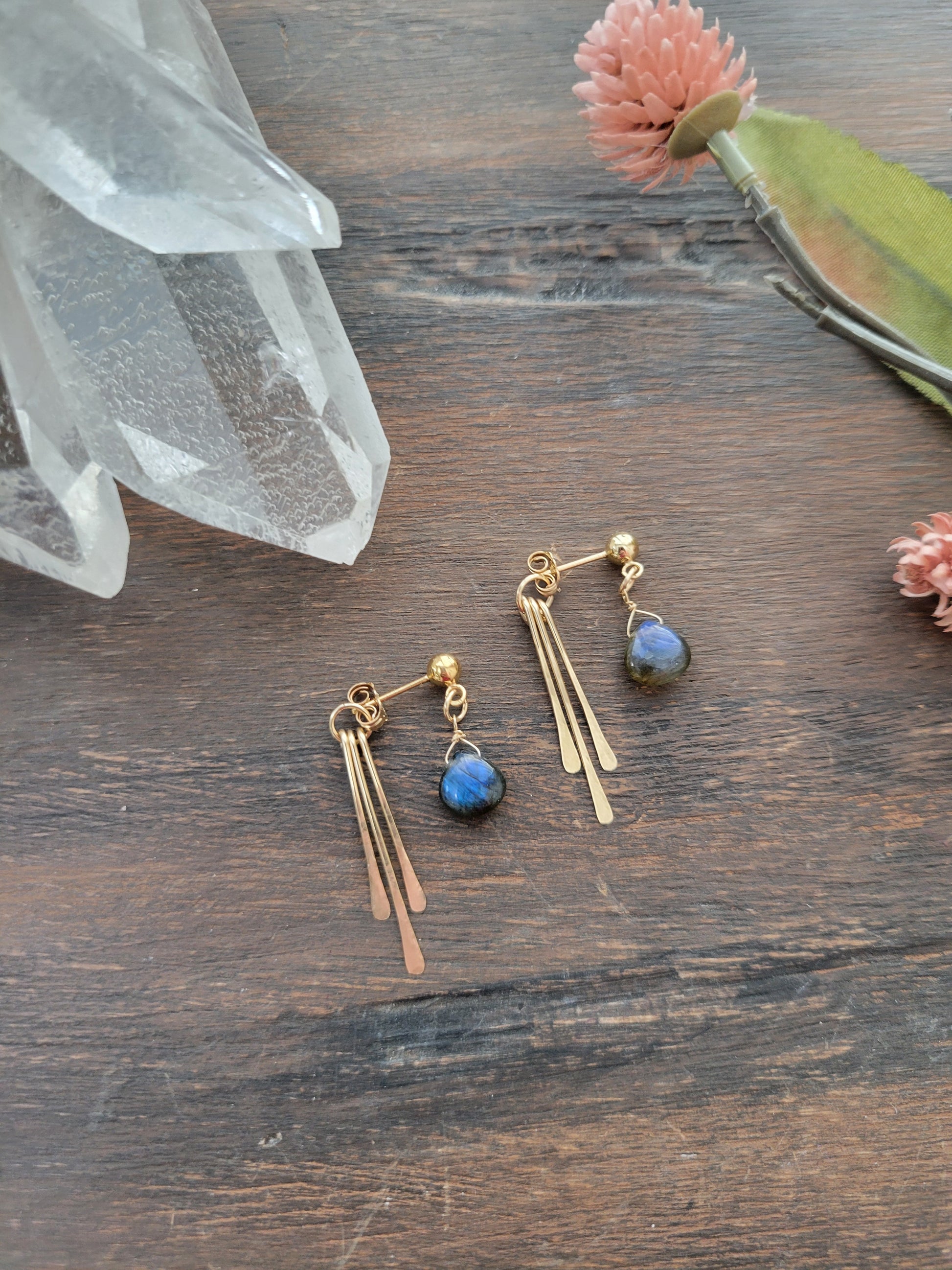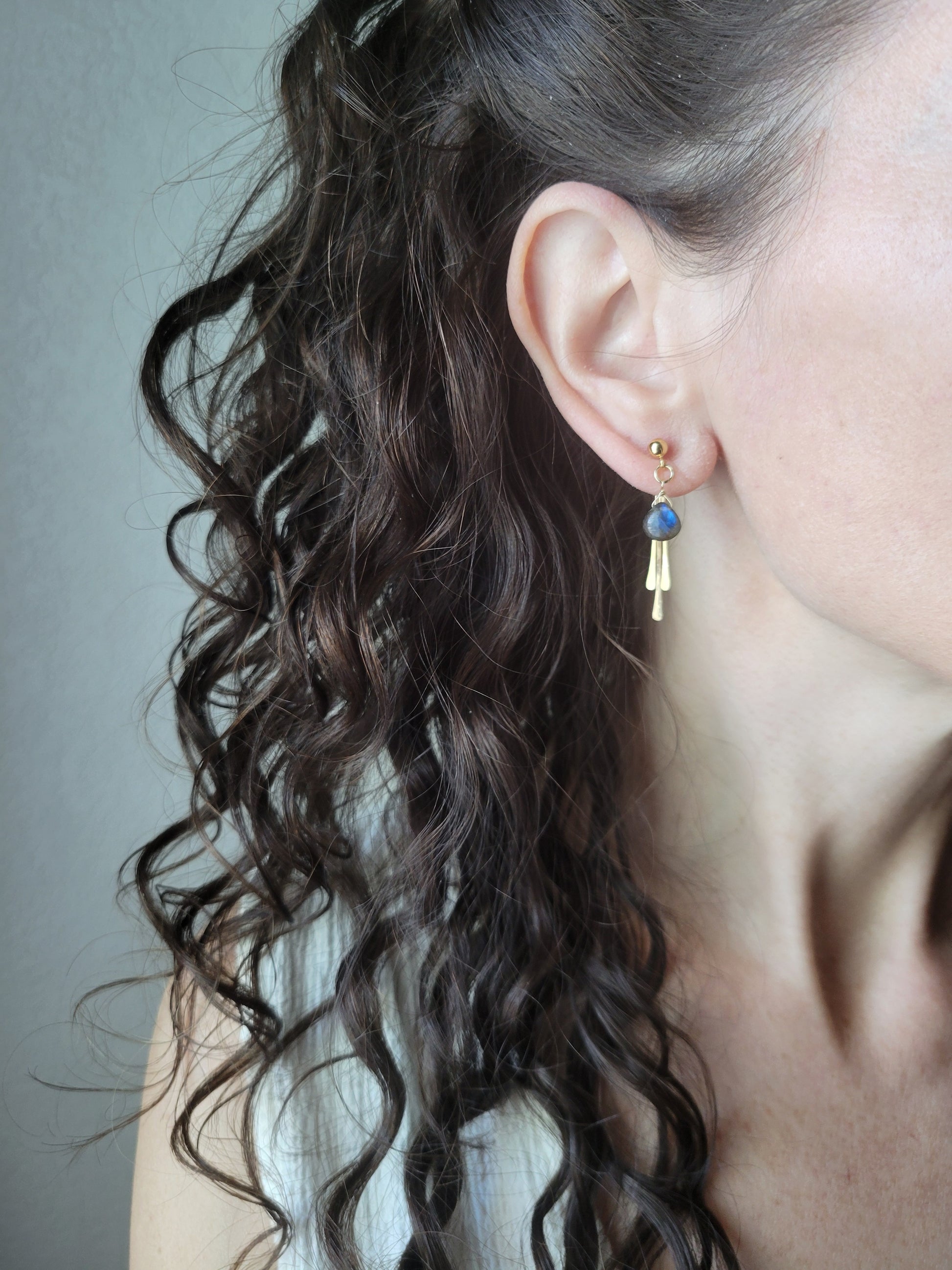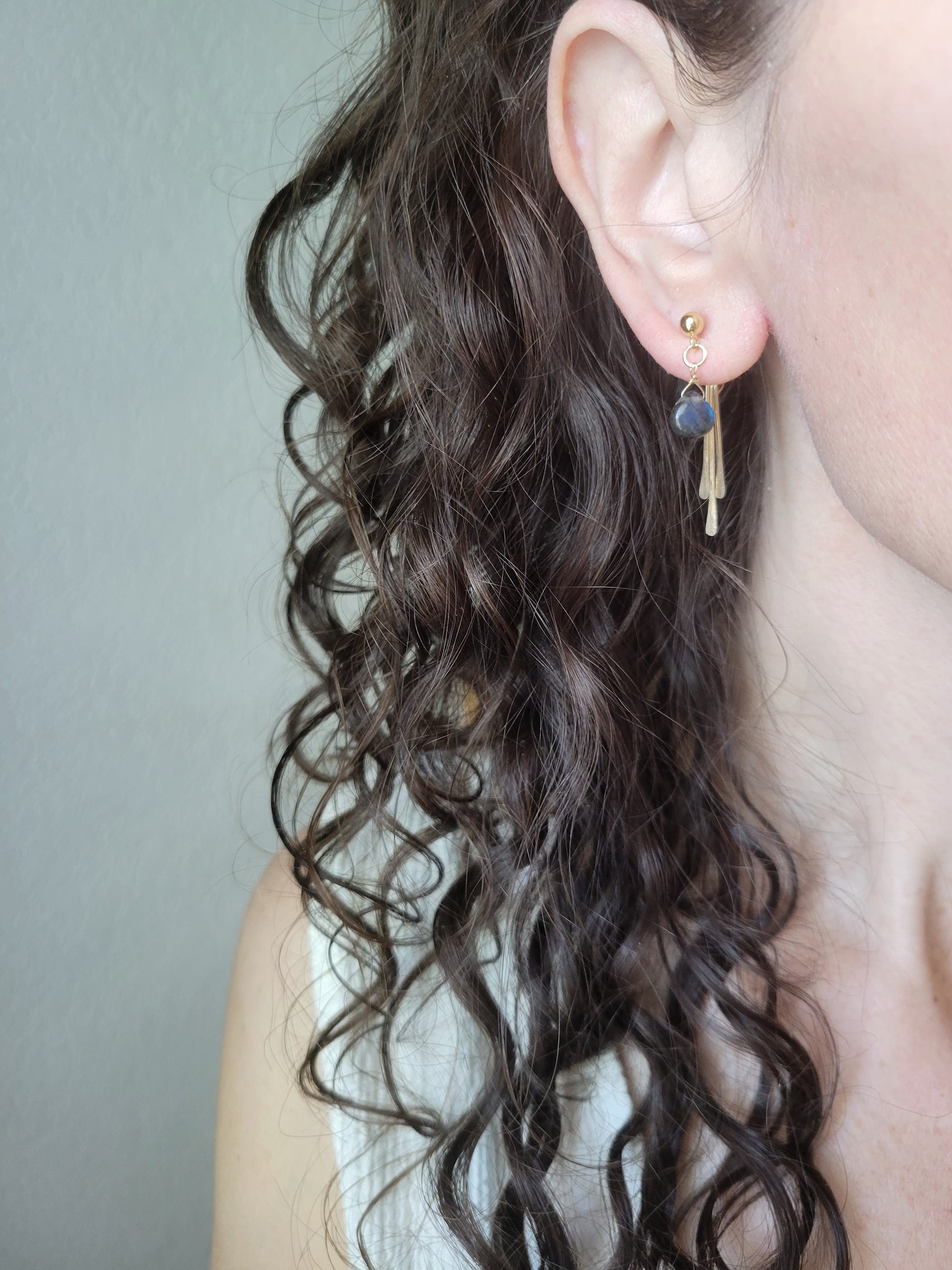 Beautiful and unique Labradorite Fringe Stud Earrings. Fun and dainty earrings that you can wear casually or dressed up. They are available in 14K Gold Filled or Sterling Silver.