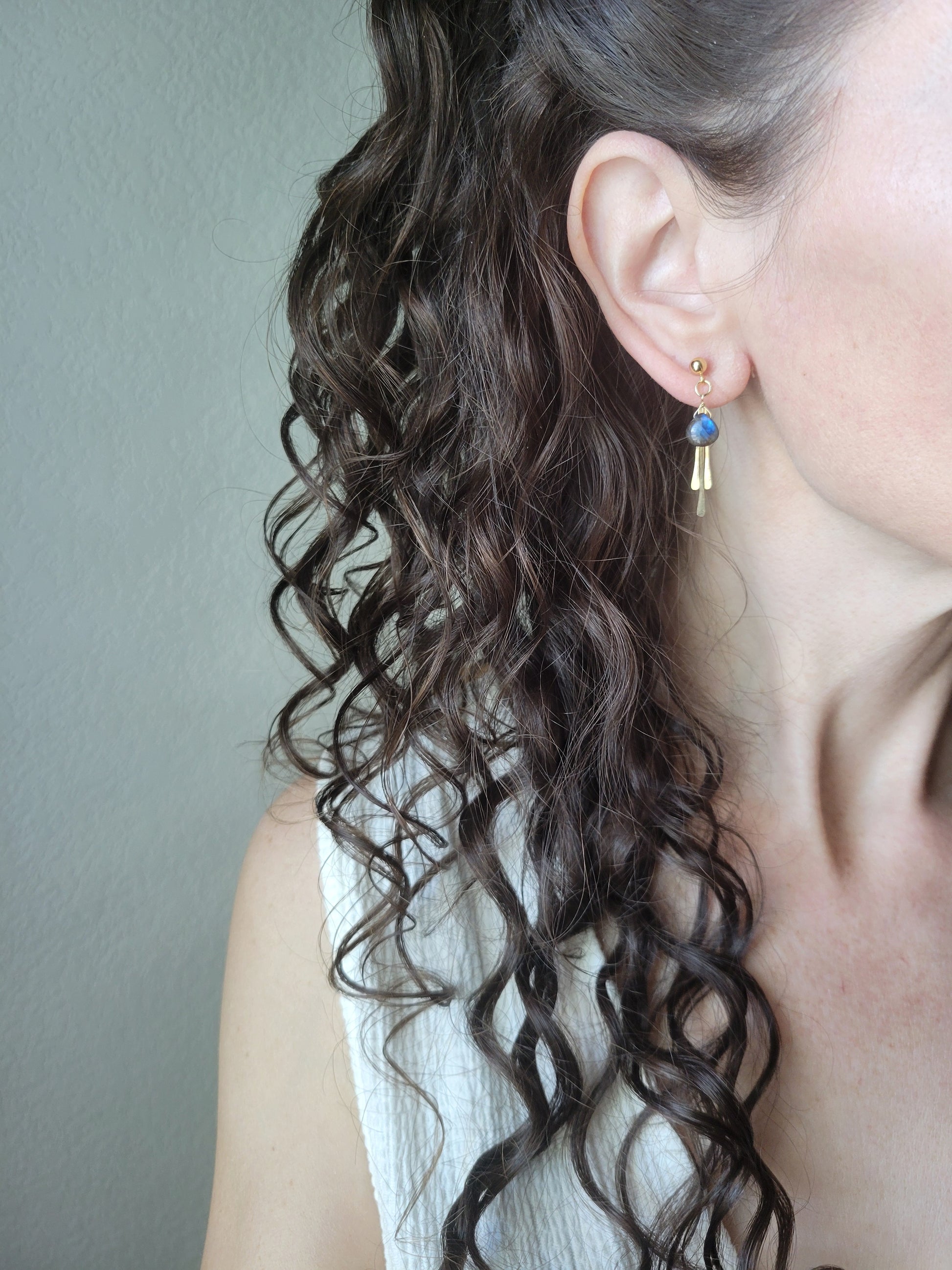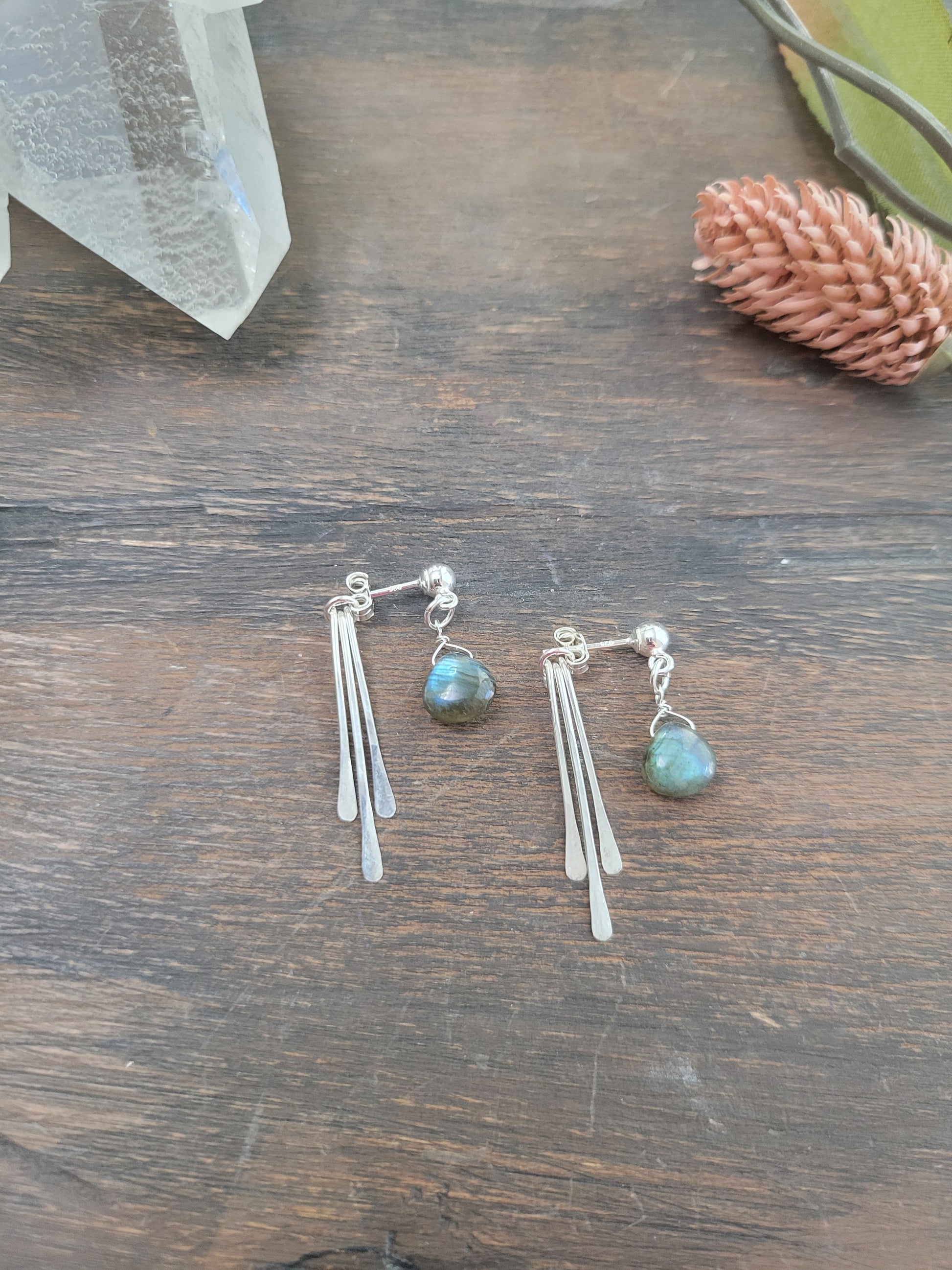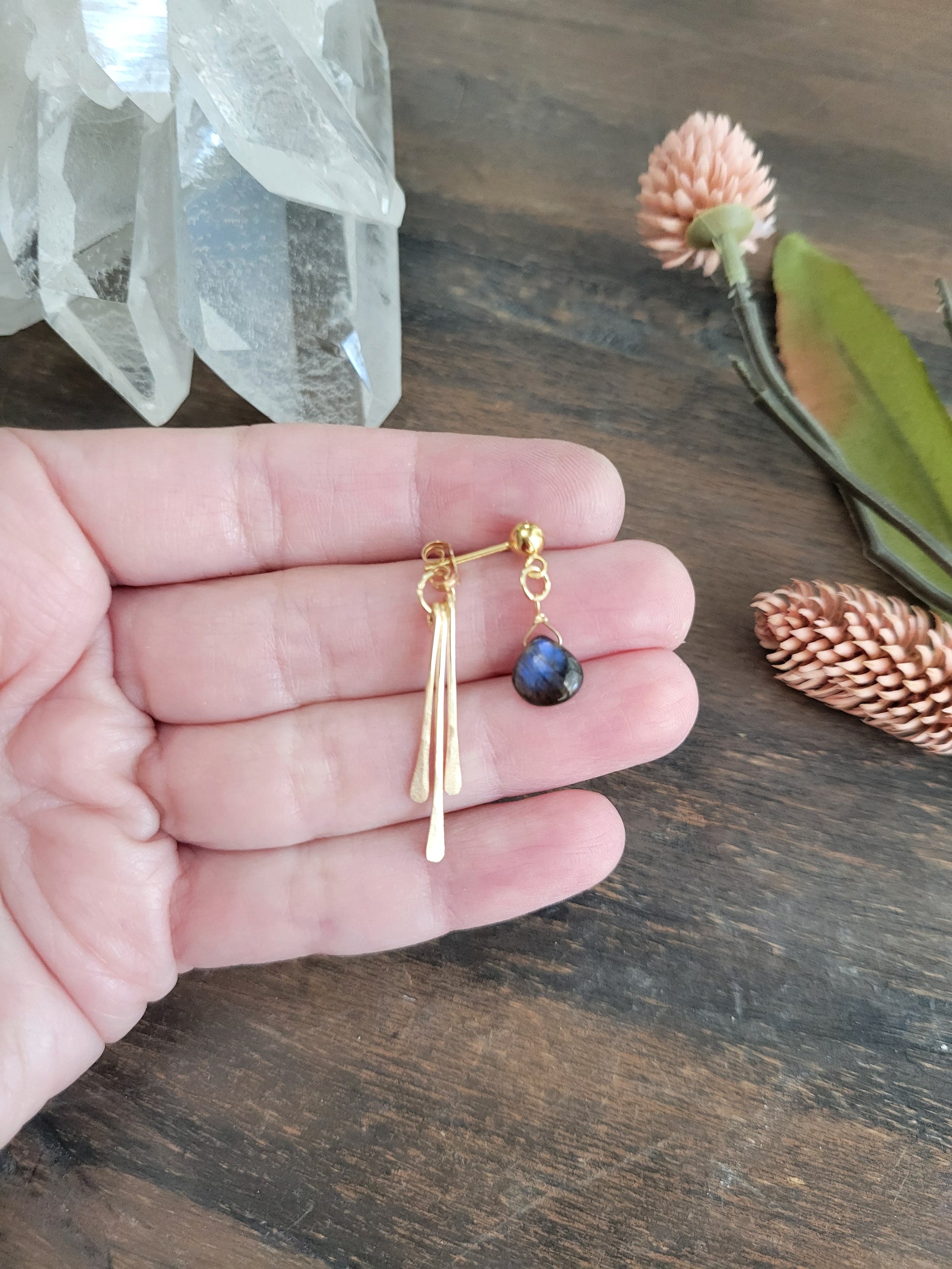 Beautiful and unique Labradorite Fringe Stud Earrings. Fun and dainty earrings that you can wear casually or dressed up. They are available in 14K Gold Filled or Sterling Silver.