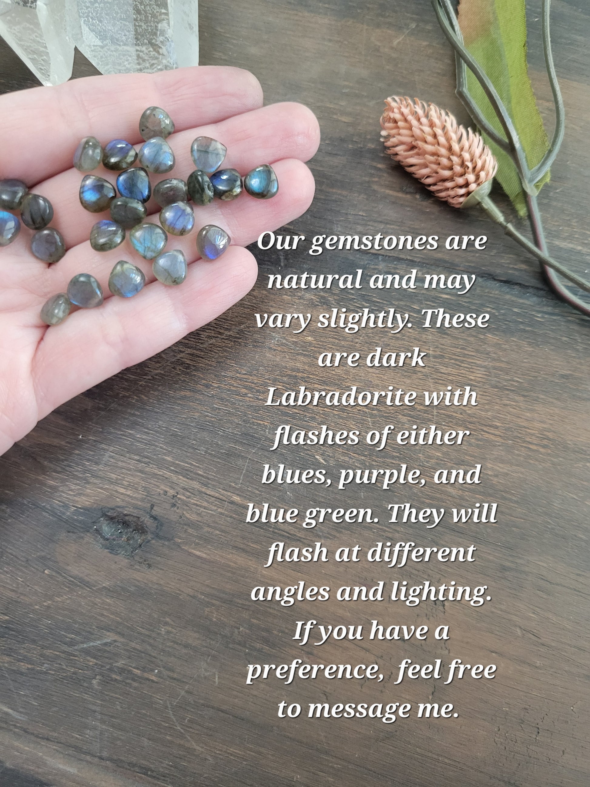 The labradorite are natural and may vary. These are dark labradorite that flash either blues, blue-green, or purples depending on the lighting and angles.