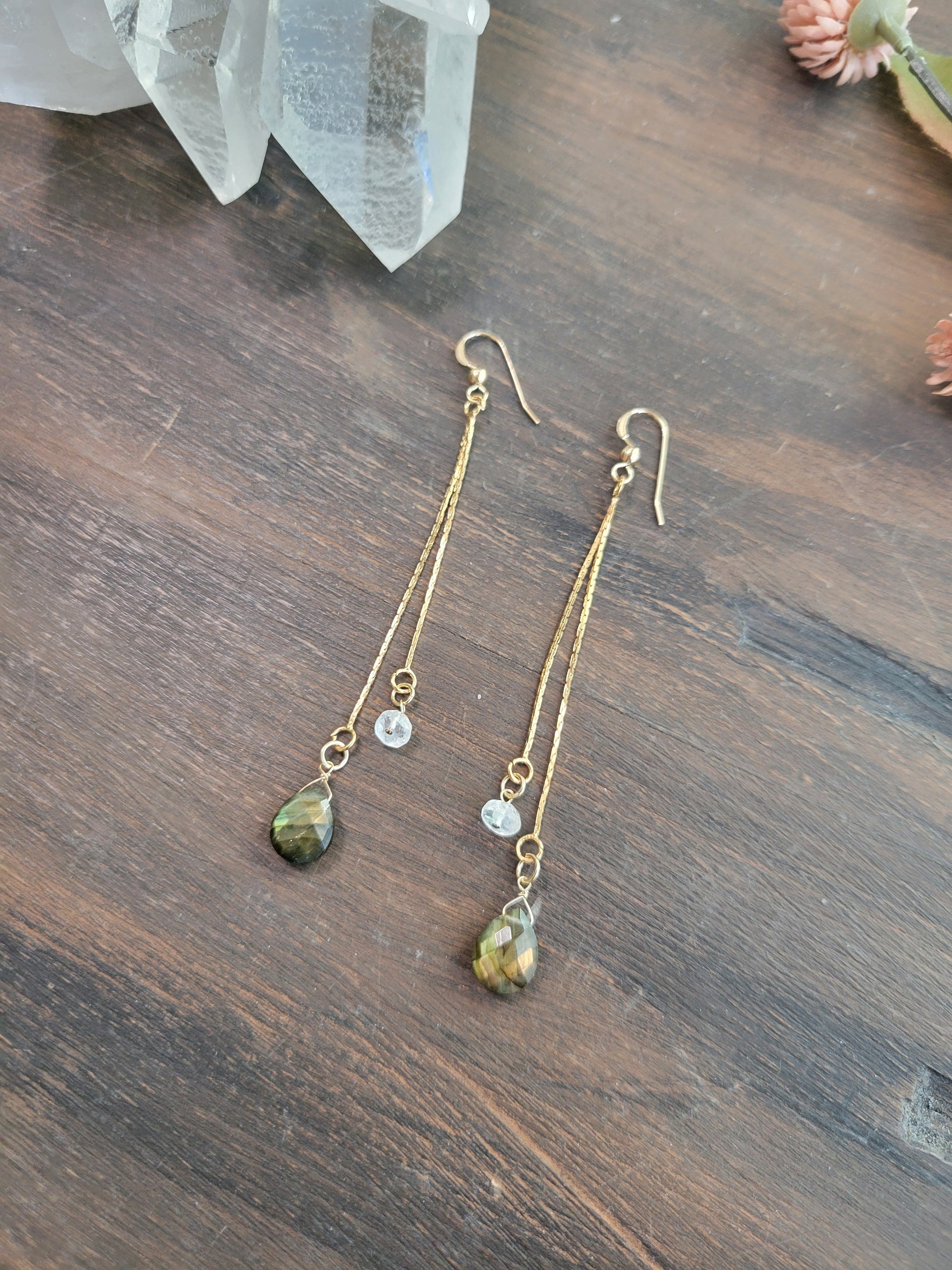 Beautiful chain dangle earrings with Labradorite and Moonstone. These beauties are lightweight and elegant. They are very versatile as you can wear them casually or for a more formal event.