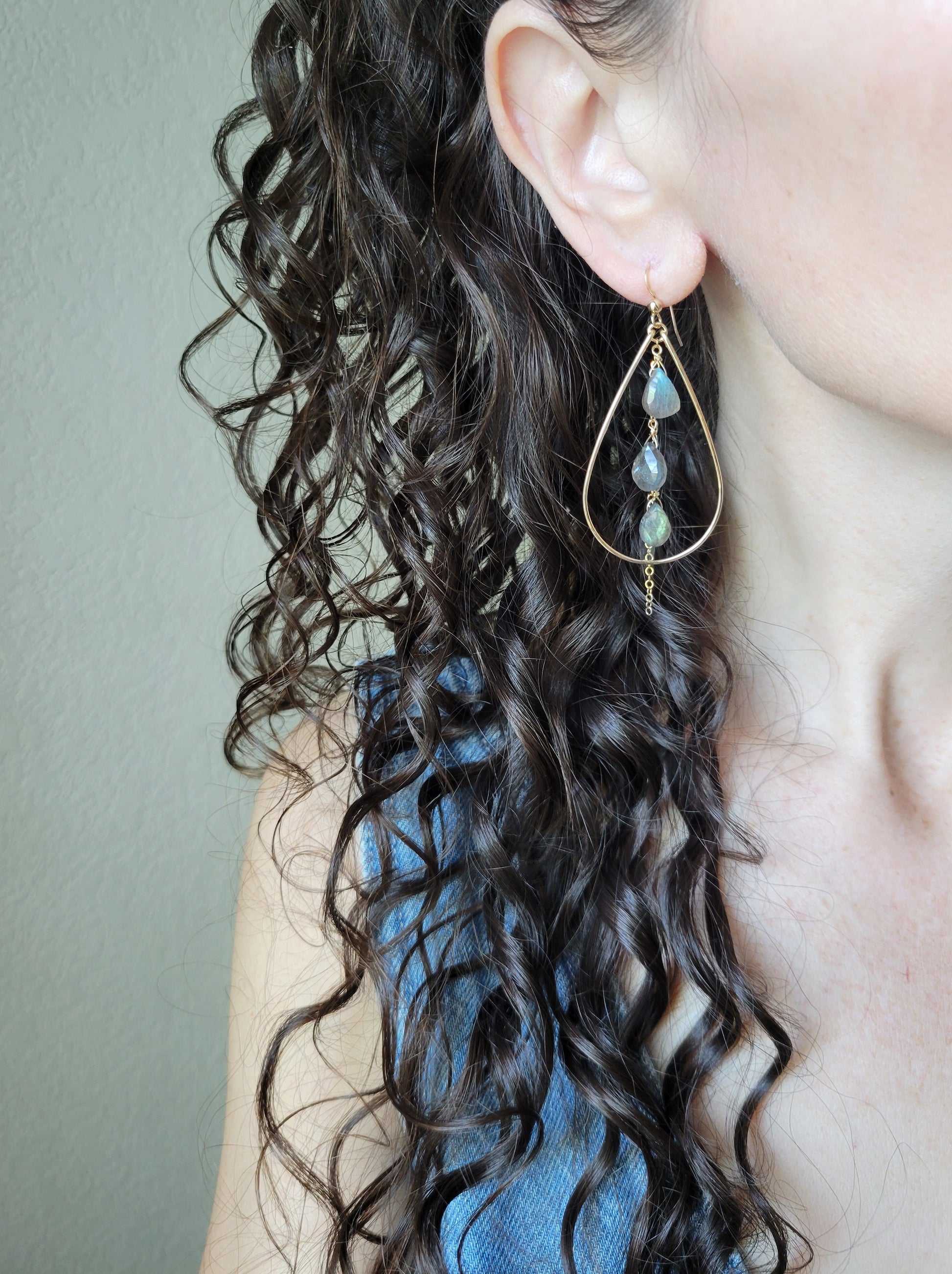 Each earring has 3 wire wrapped Labradorite gemstones that beautifully cascade down the chain. The labradorites are a grey in color with some having flashes of blues, greens, or yellow/orange.