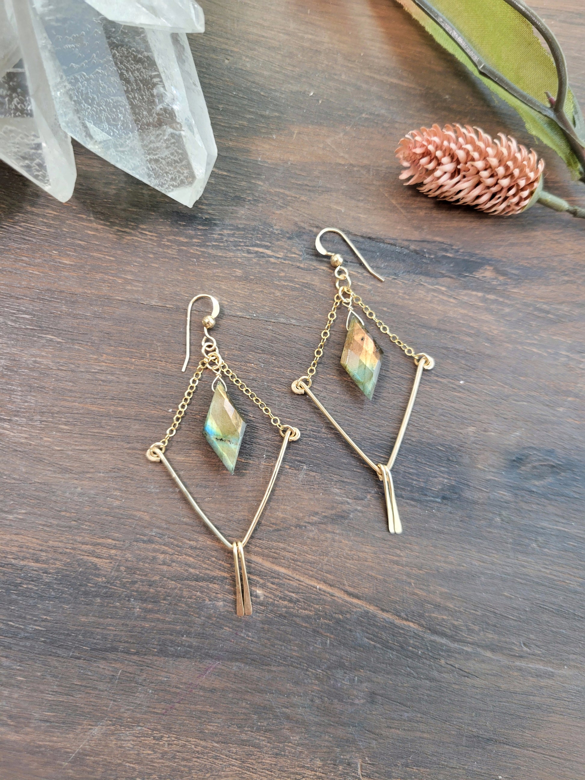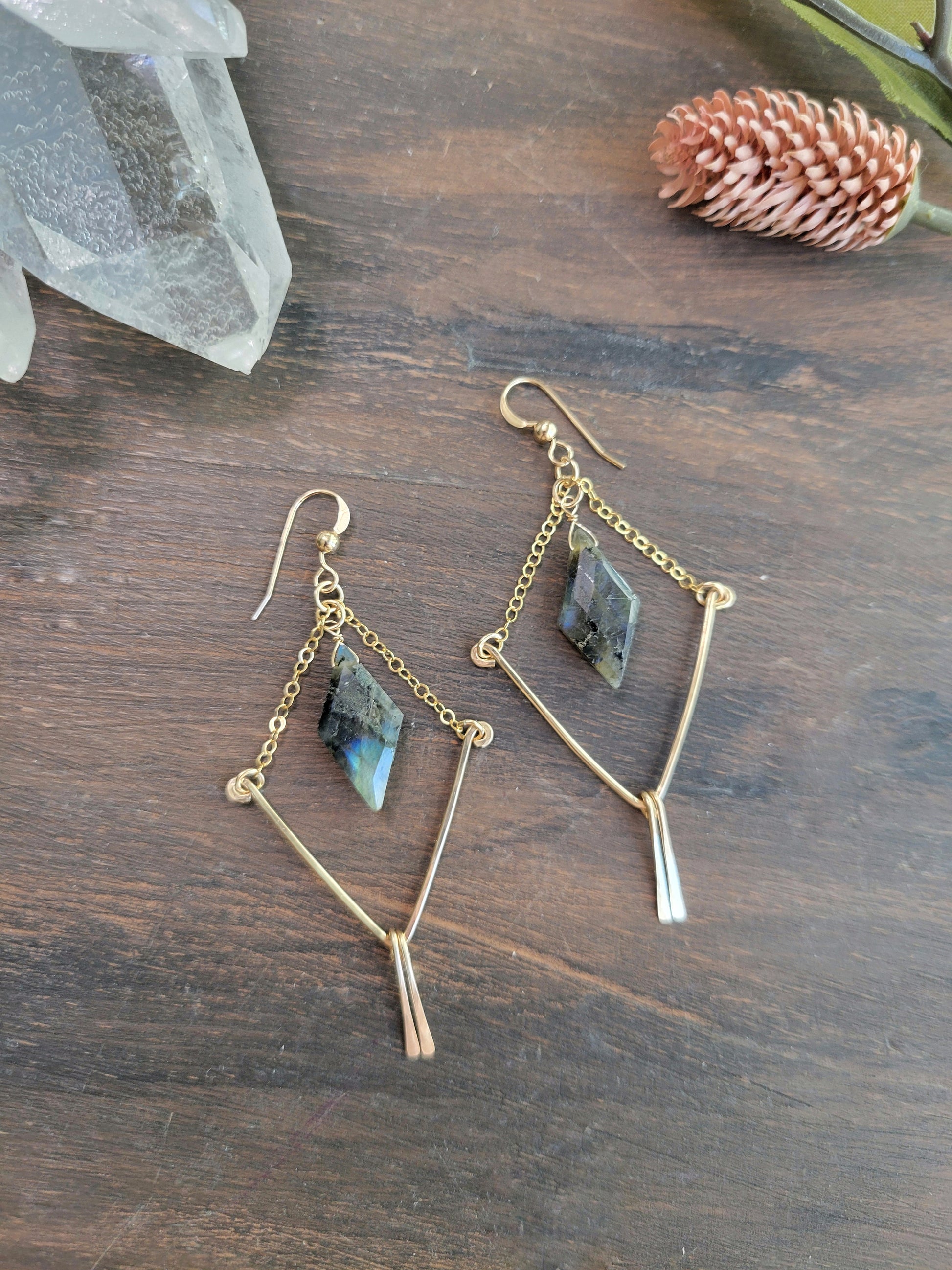 Beautiful and unique Labradorite V Fringe Earrings in your choice of Sterling Silver or 14K Gold Filled materials.