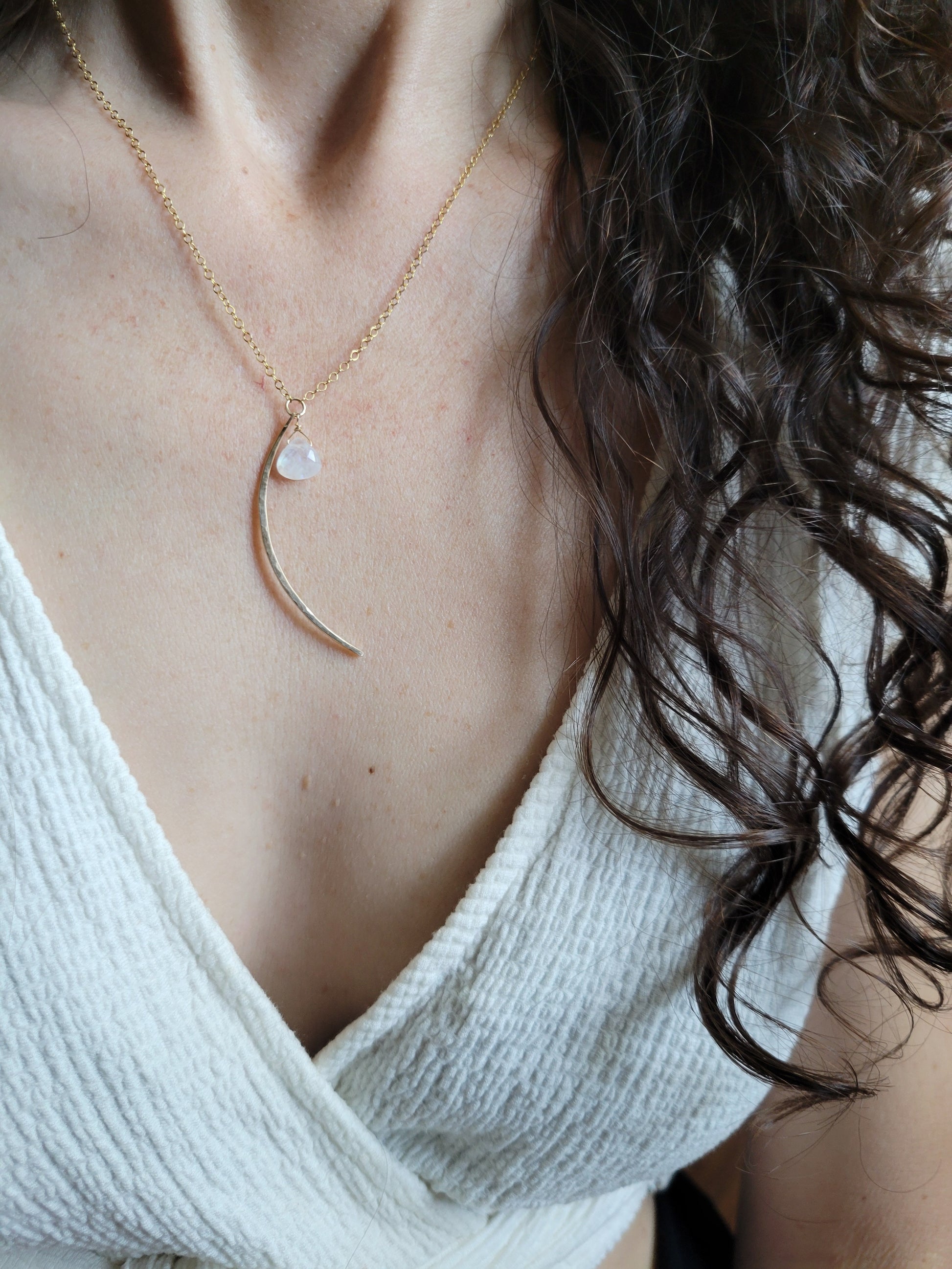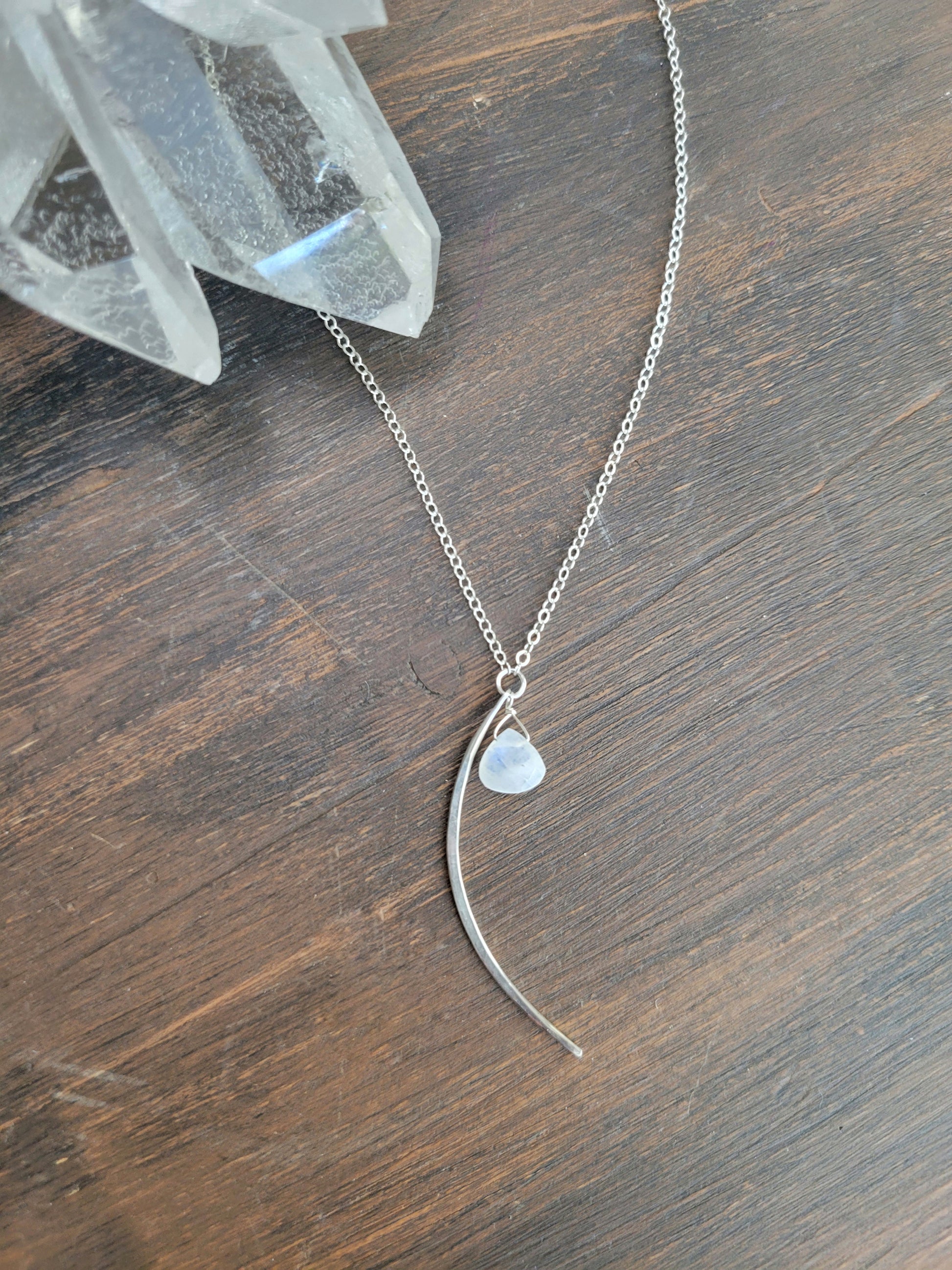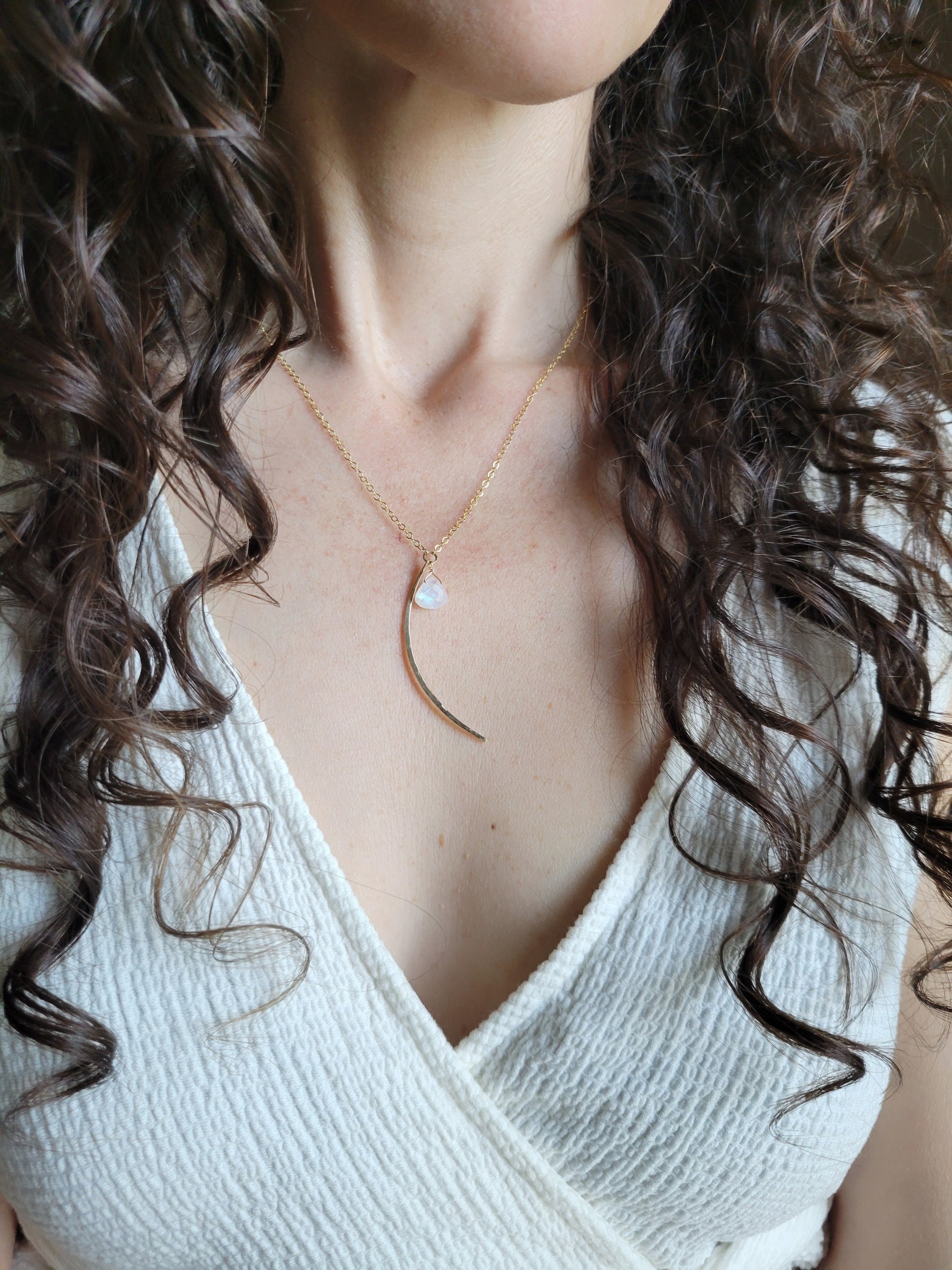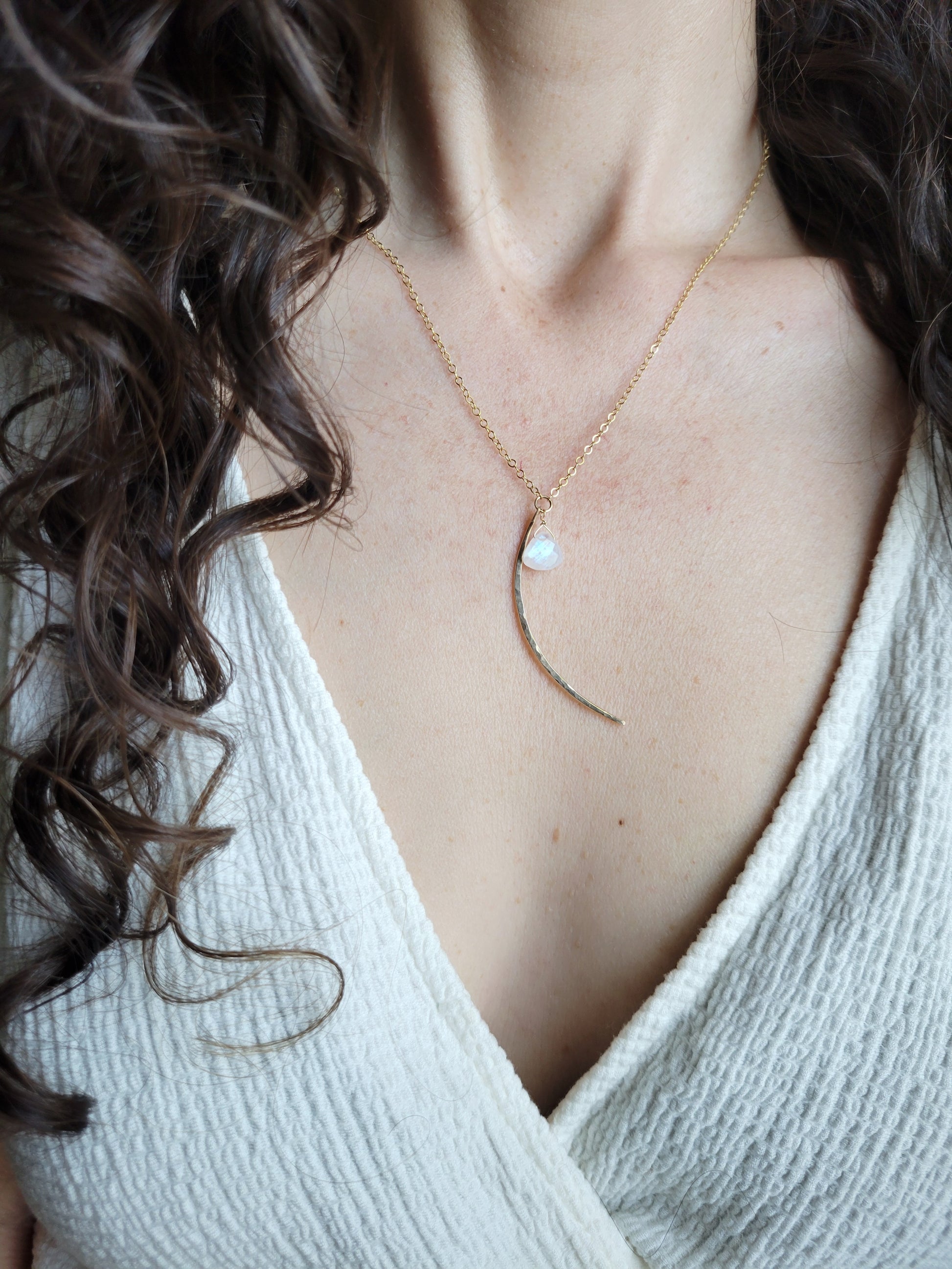 Gorgeous Crescent Moon Necklace featuring the magical Moonstone Gemstone. Easy to wear as you can dress it up or down.