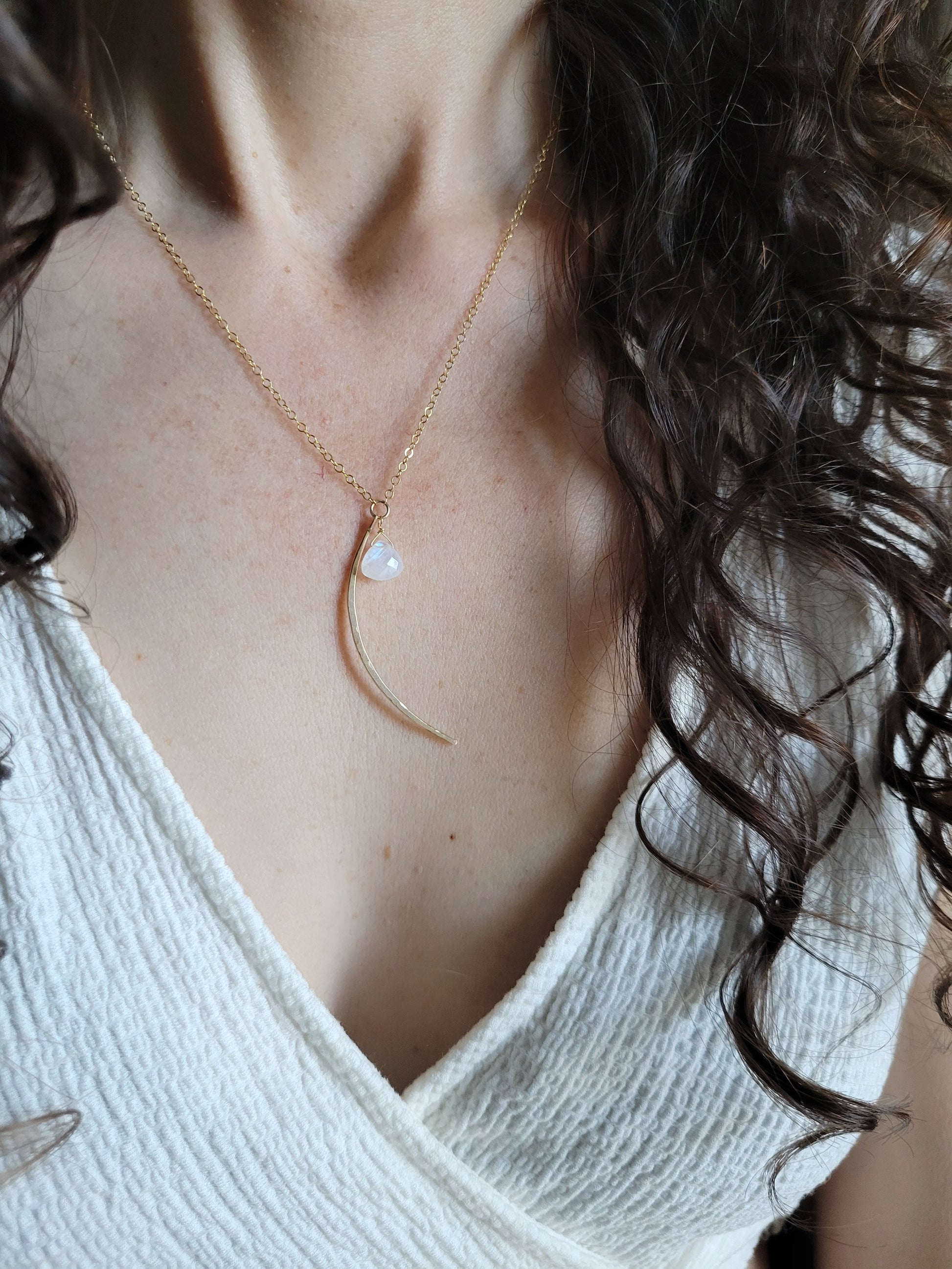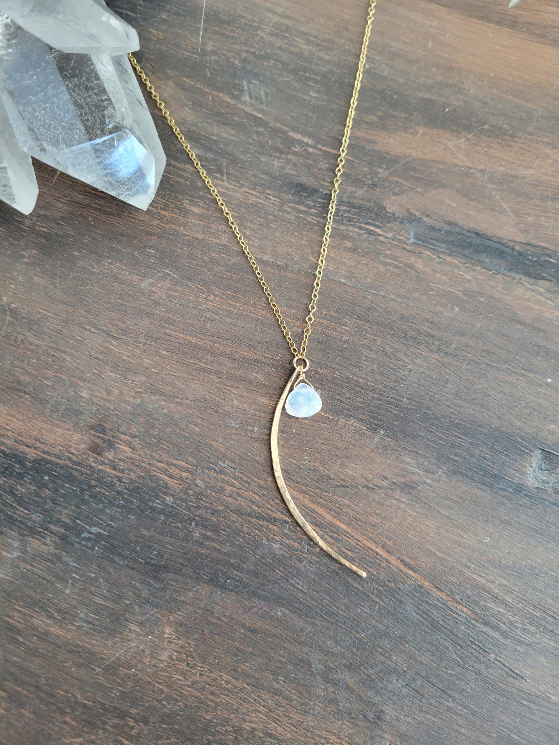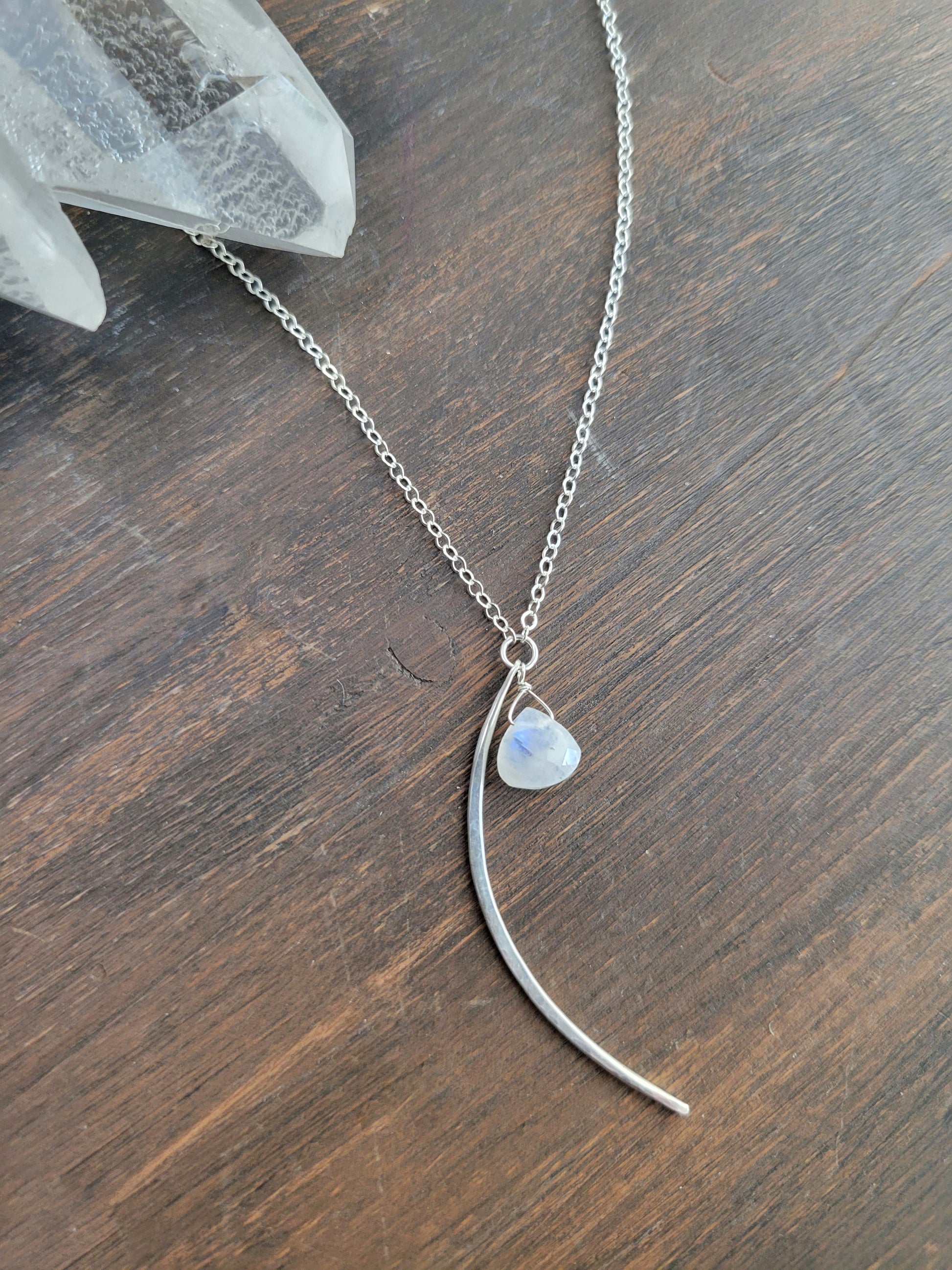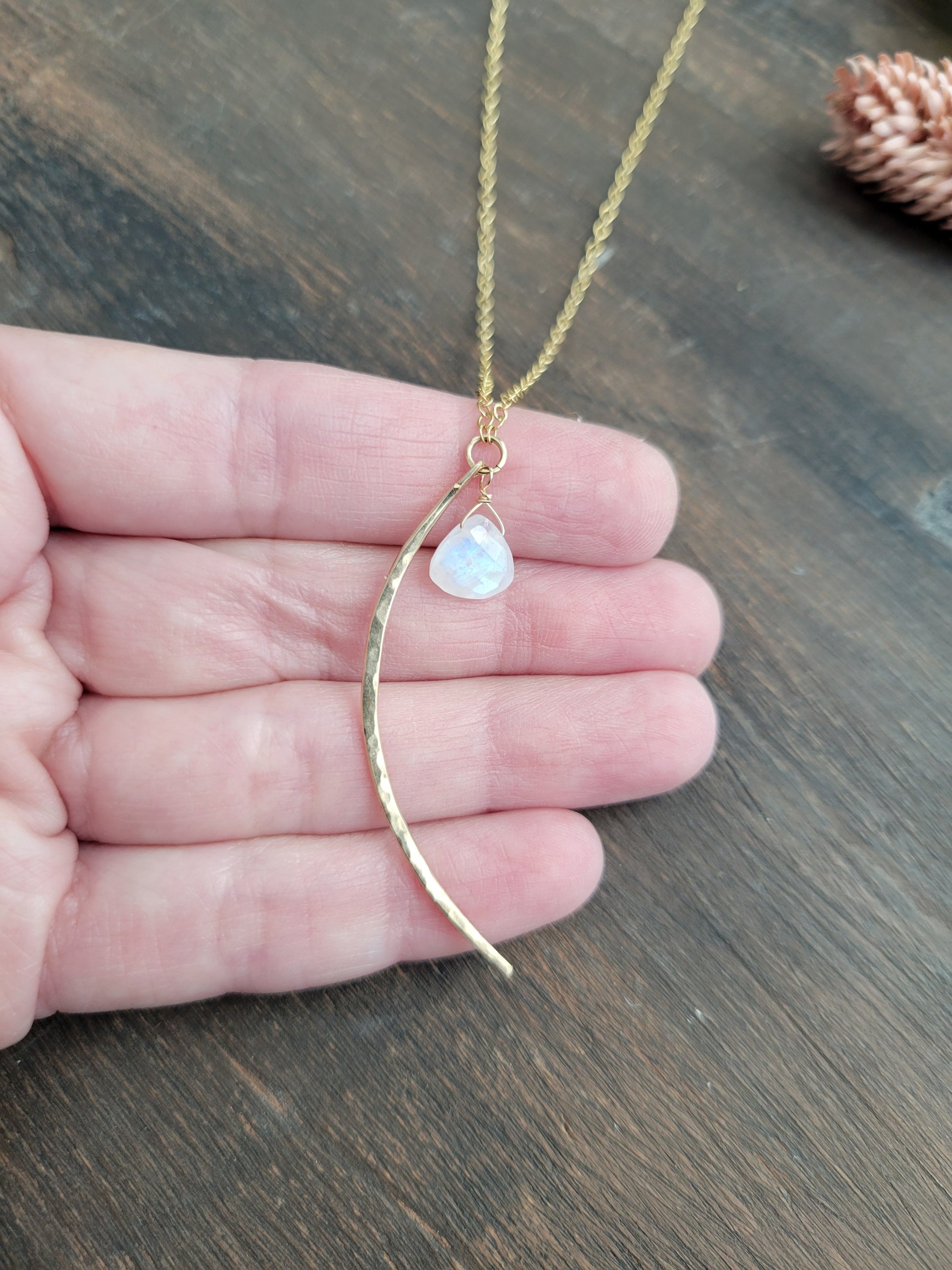 Gorgeous Crescent Moon Necklace featuring the magical Moonstone Gemstone. Easy to wear as you can dress it up or down.