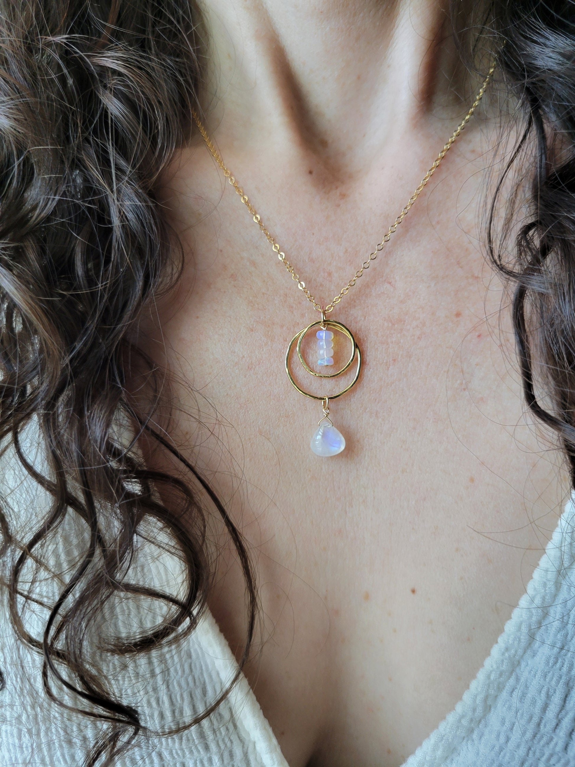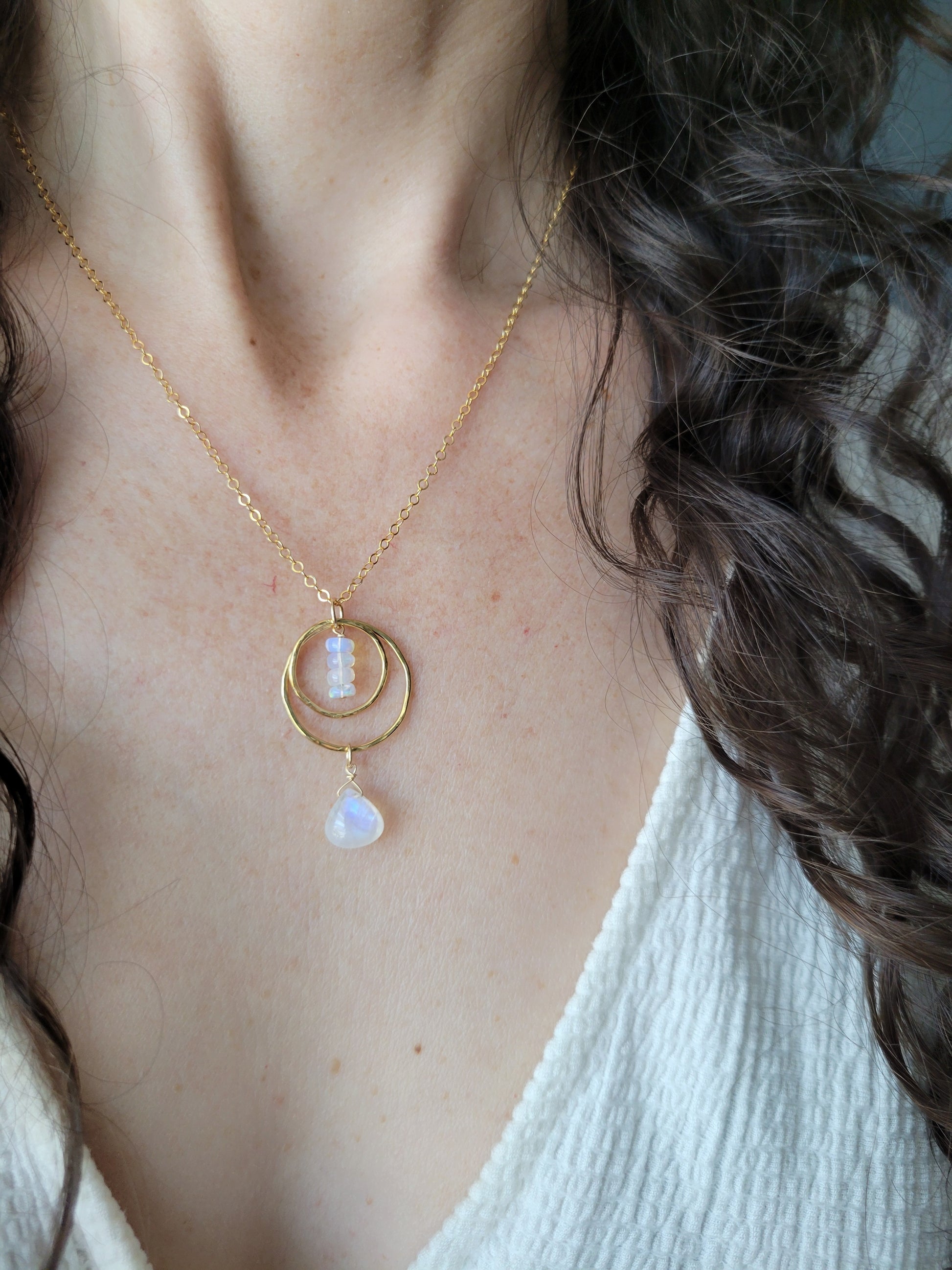 Gorgeous Ethiopian Opal and Moonstone Necklace. The Opals have a beautiful and light iridescent of colors that are so beautiful. The Moonstone dangles from the bottom and most will have a blue/rainbow flash. These two gems compliment each other so well.