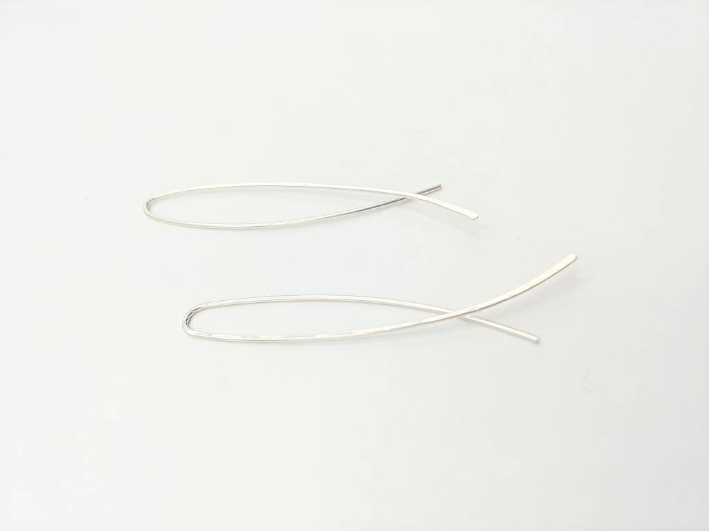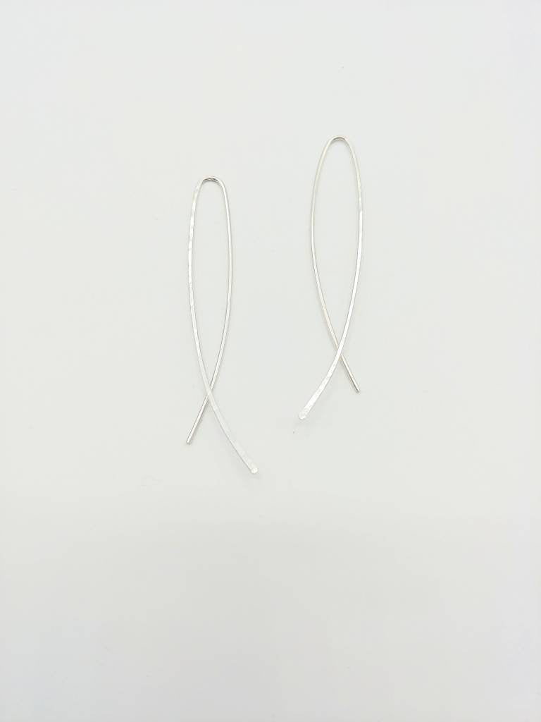 The total length of the earrings are approx. 2 1/4 in. The shorter side is the side that goes through your ear. They are hammered and the longer side is slightly hammered more for texture and shine.