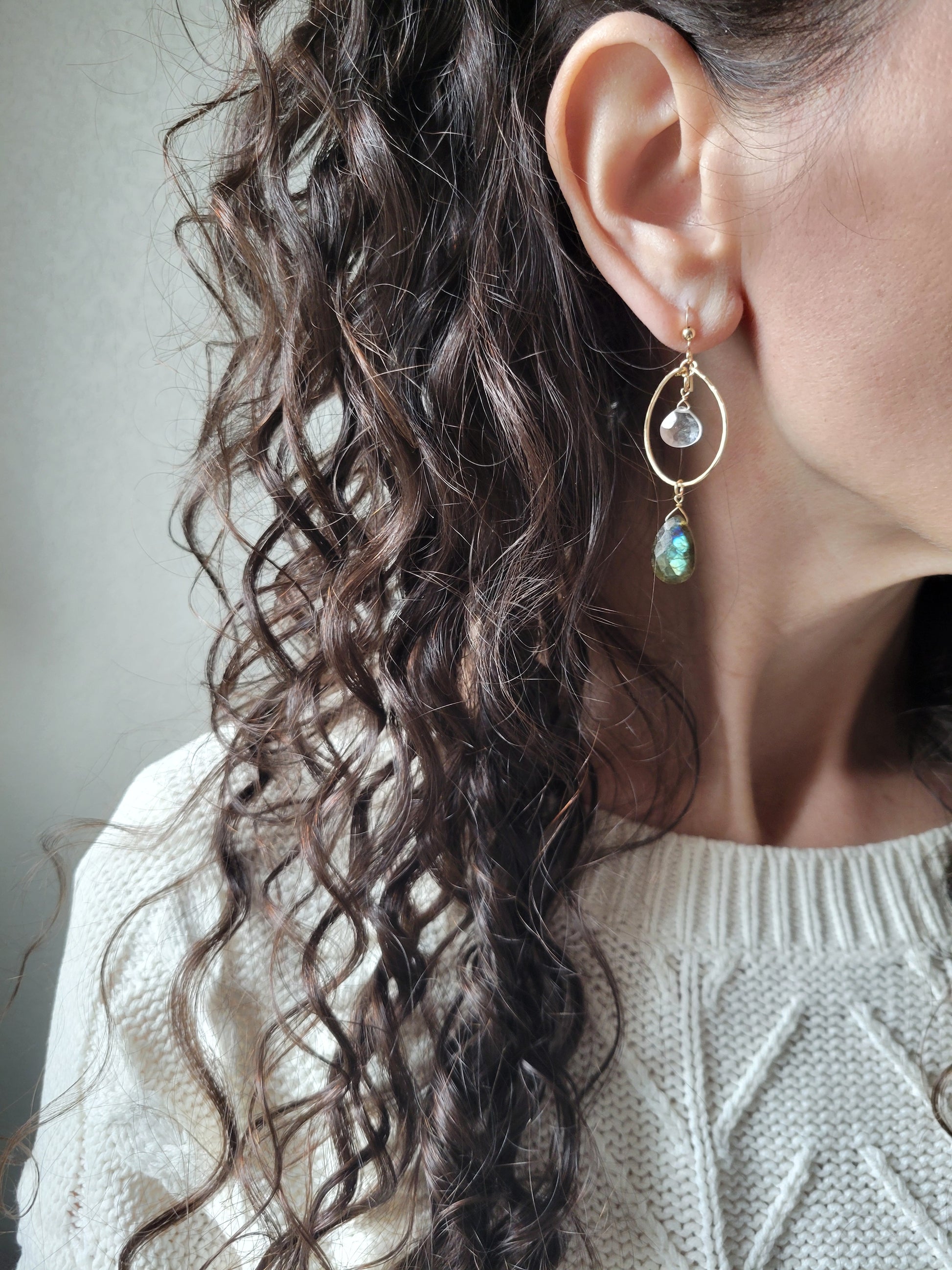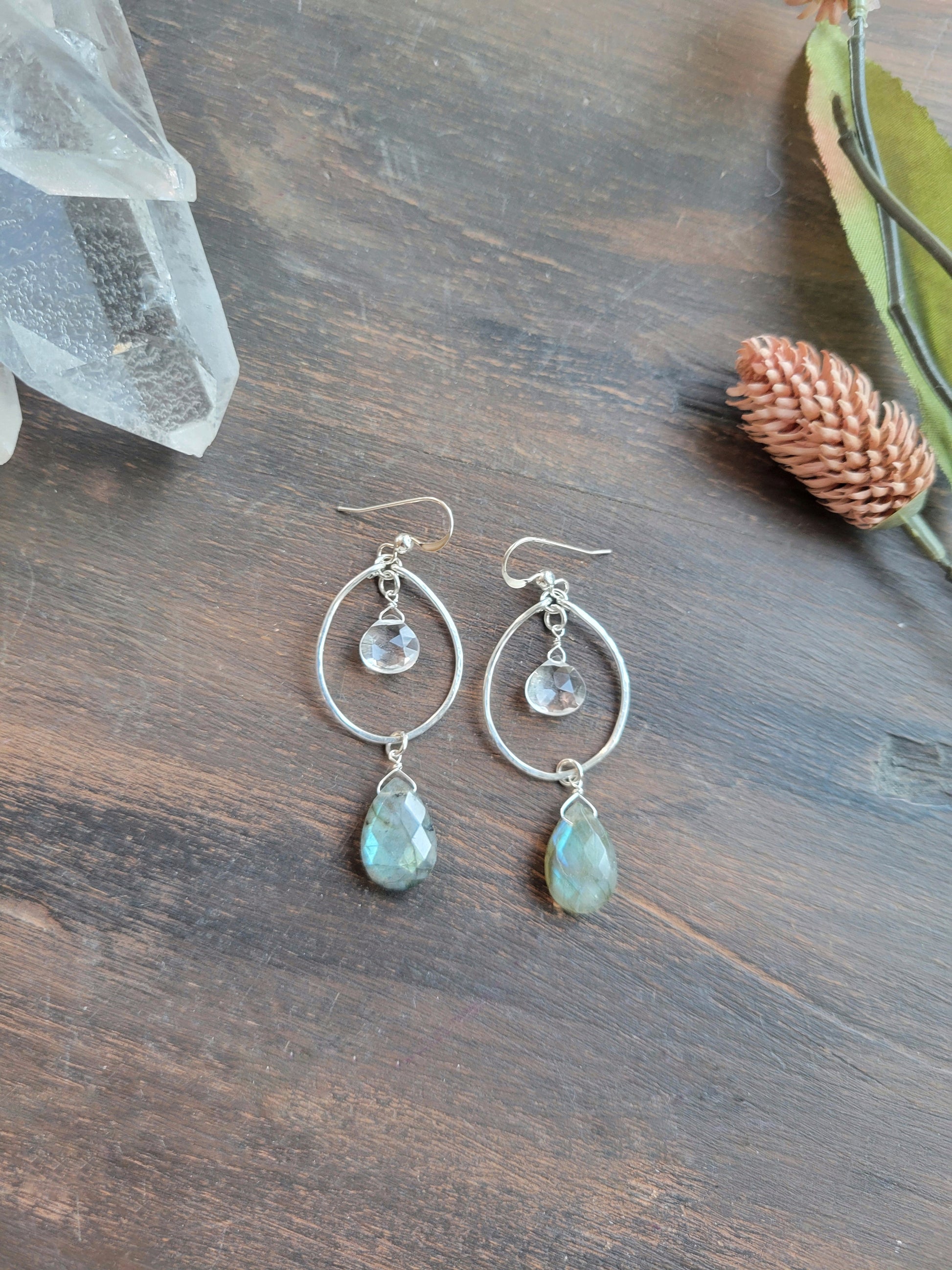 Beautiful and dainty Labradorite and Quartz Dangle Hoop Earrings in your choice of Sterling Silver or 14k Gold Filled.