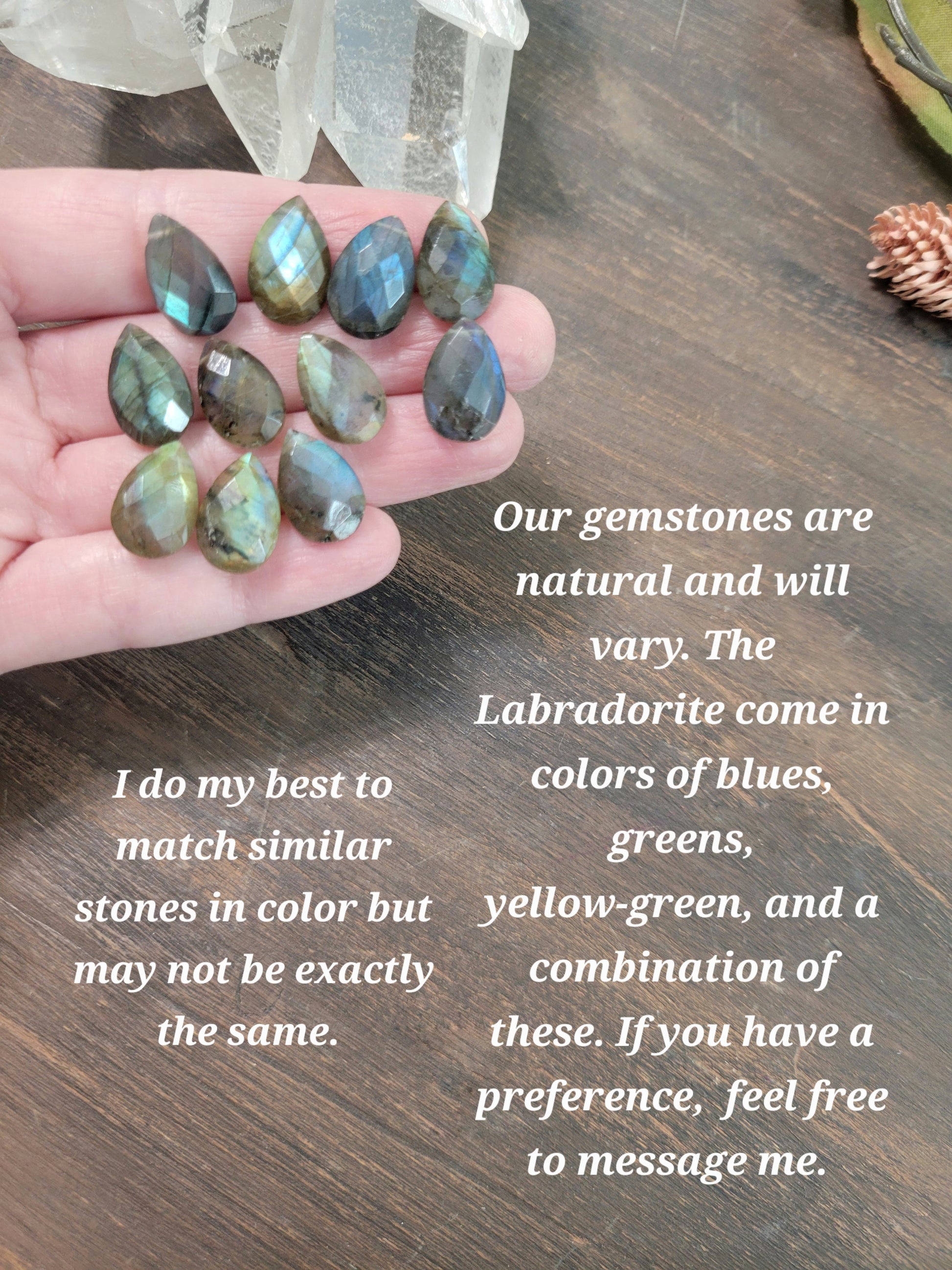 All gemstones are natural and the Labradorite will vary in beautiful colors of blues, greens, yellow-green, and a combinations of these. Please feel free to contact me if you have a preference. The Labradorite will flash differently depending on lighting and angles.