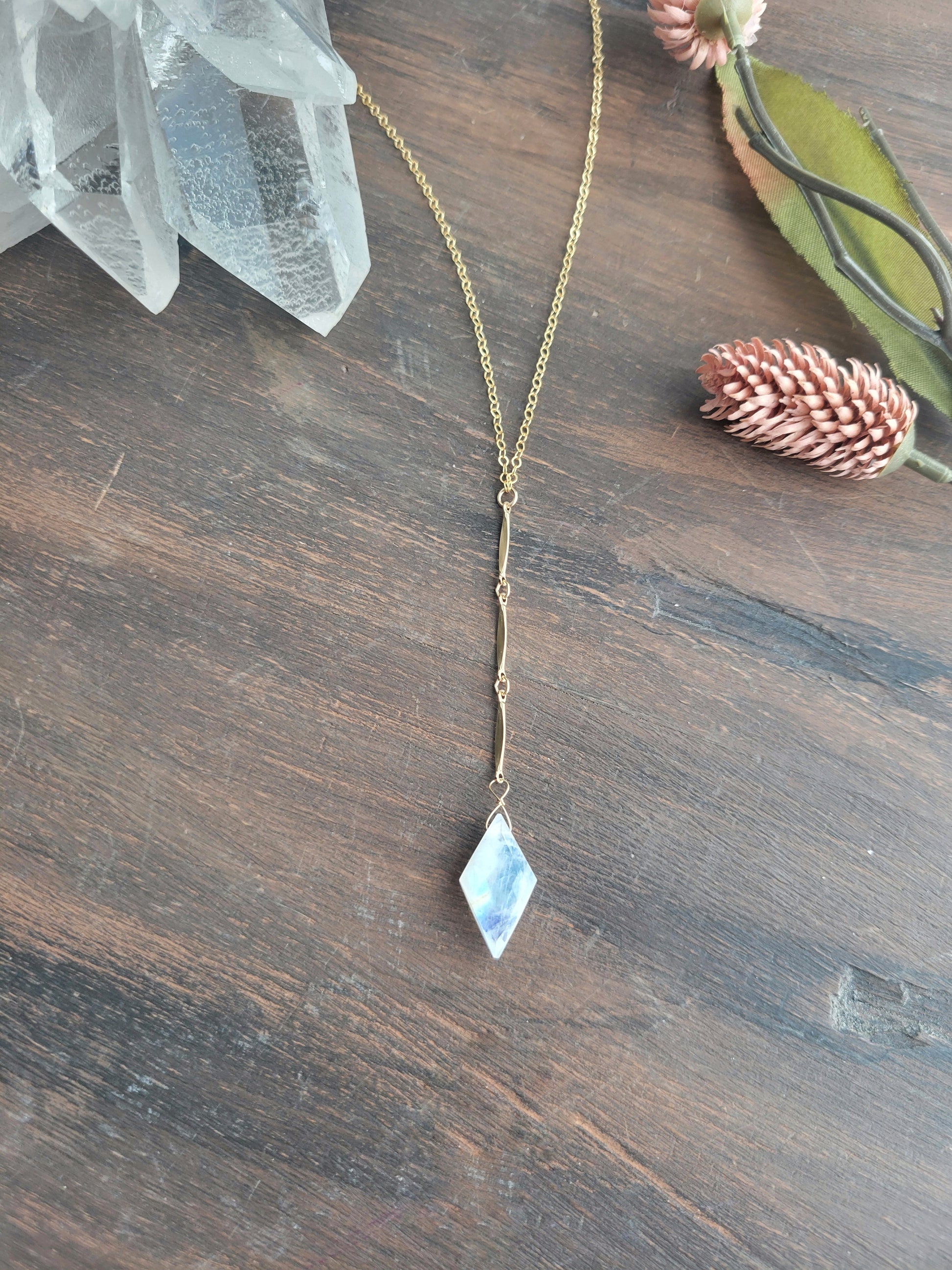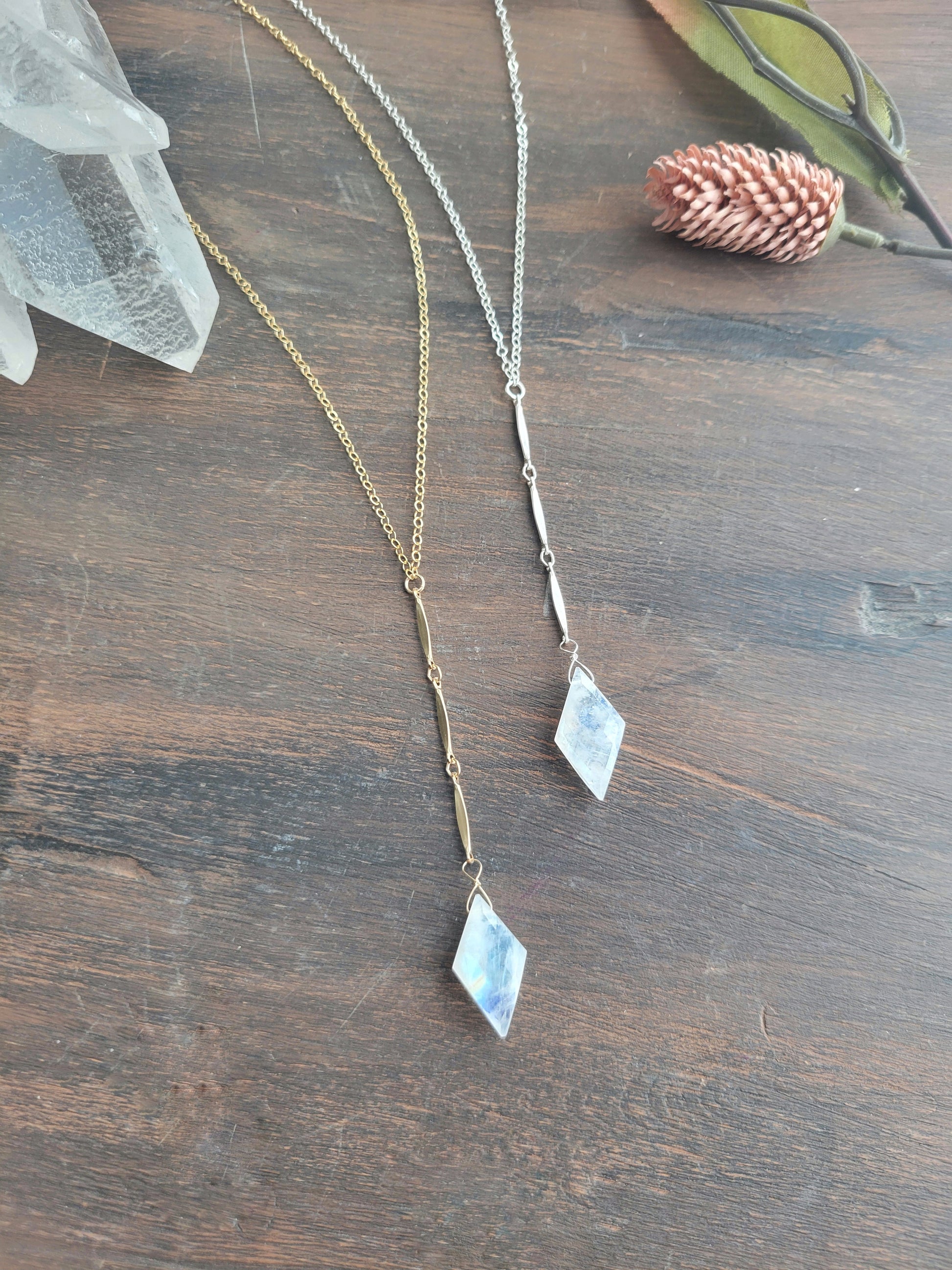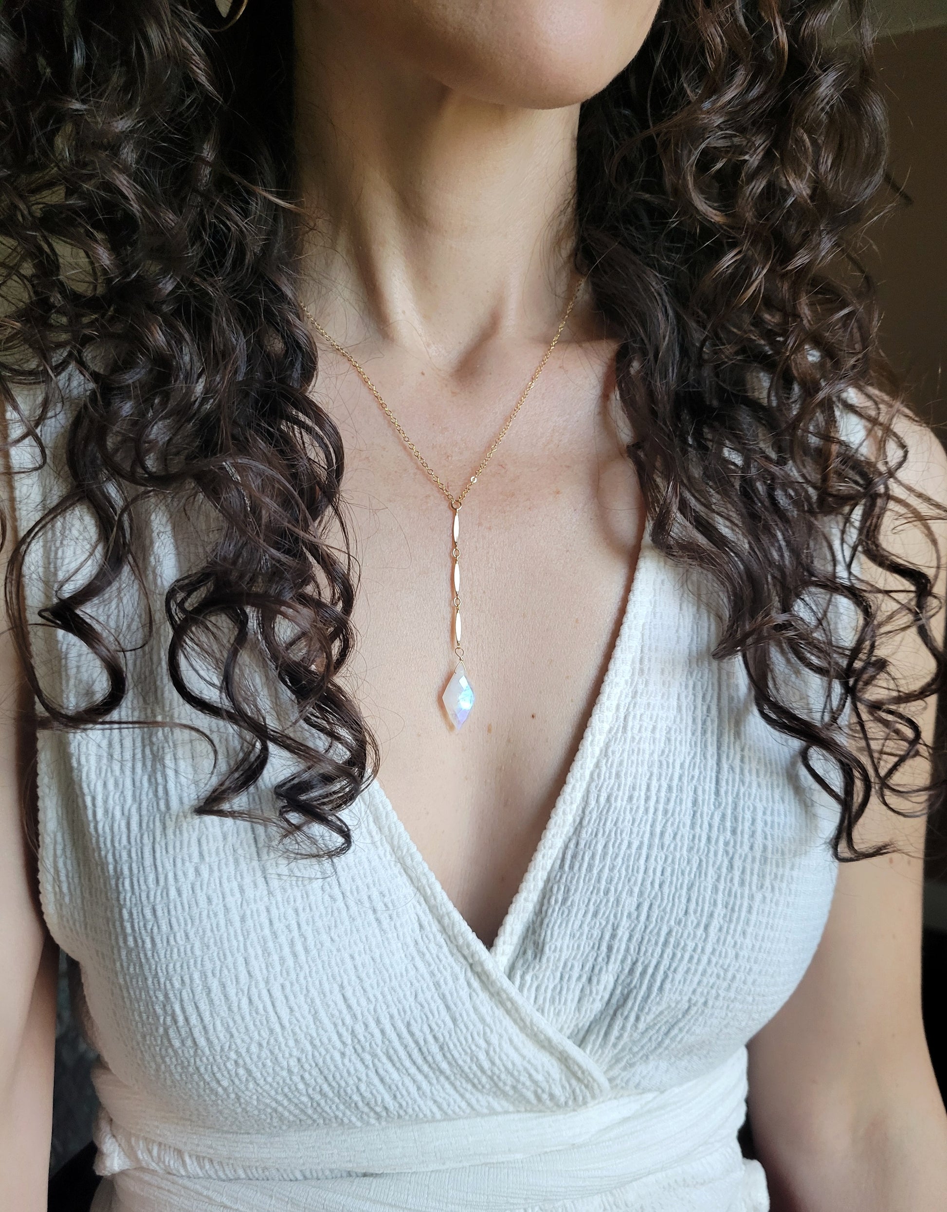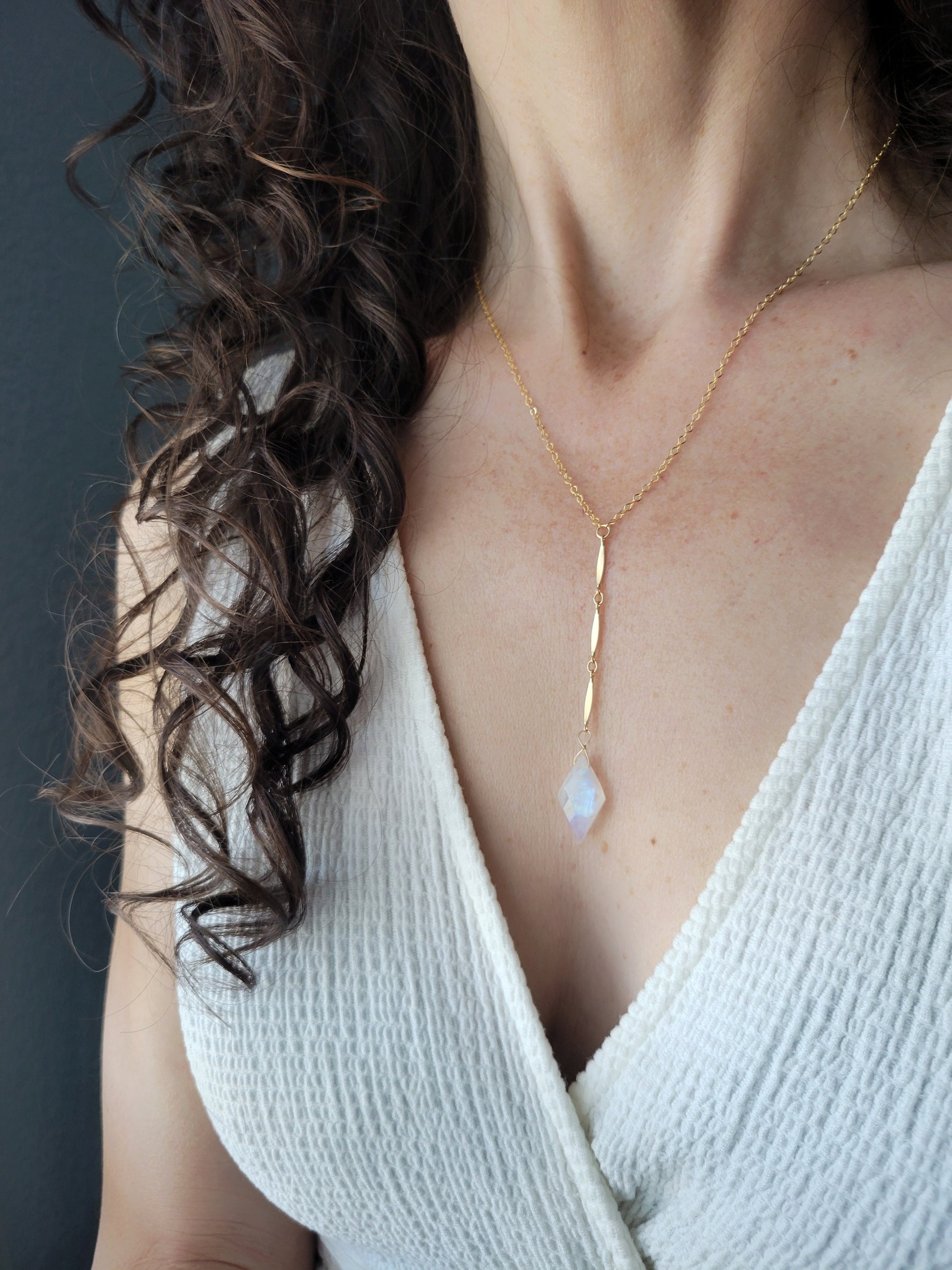 Dainty and magical Rainbow Moonstone Y Necklace in your choice of Sterling Silver or 14K Gold Filled. This necklace looks beautiful worn with a V neck as shown or over the top of a t-shirt for a more casual look. The glow in these Moonstones are gorgeous!