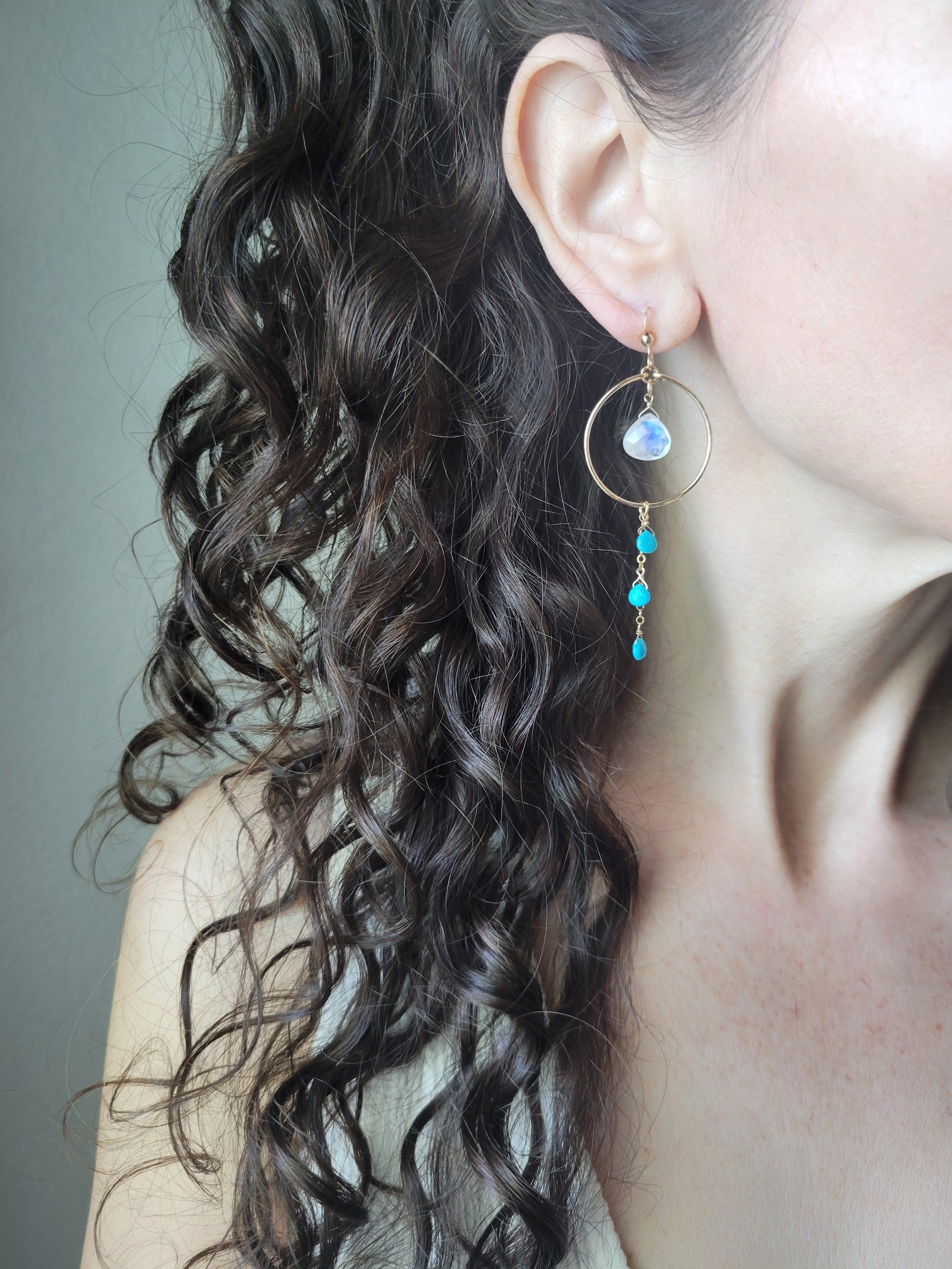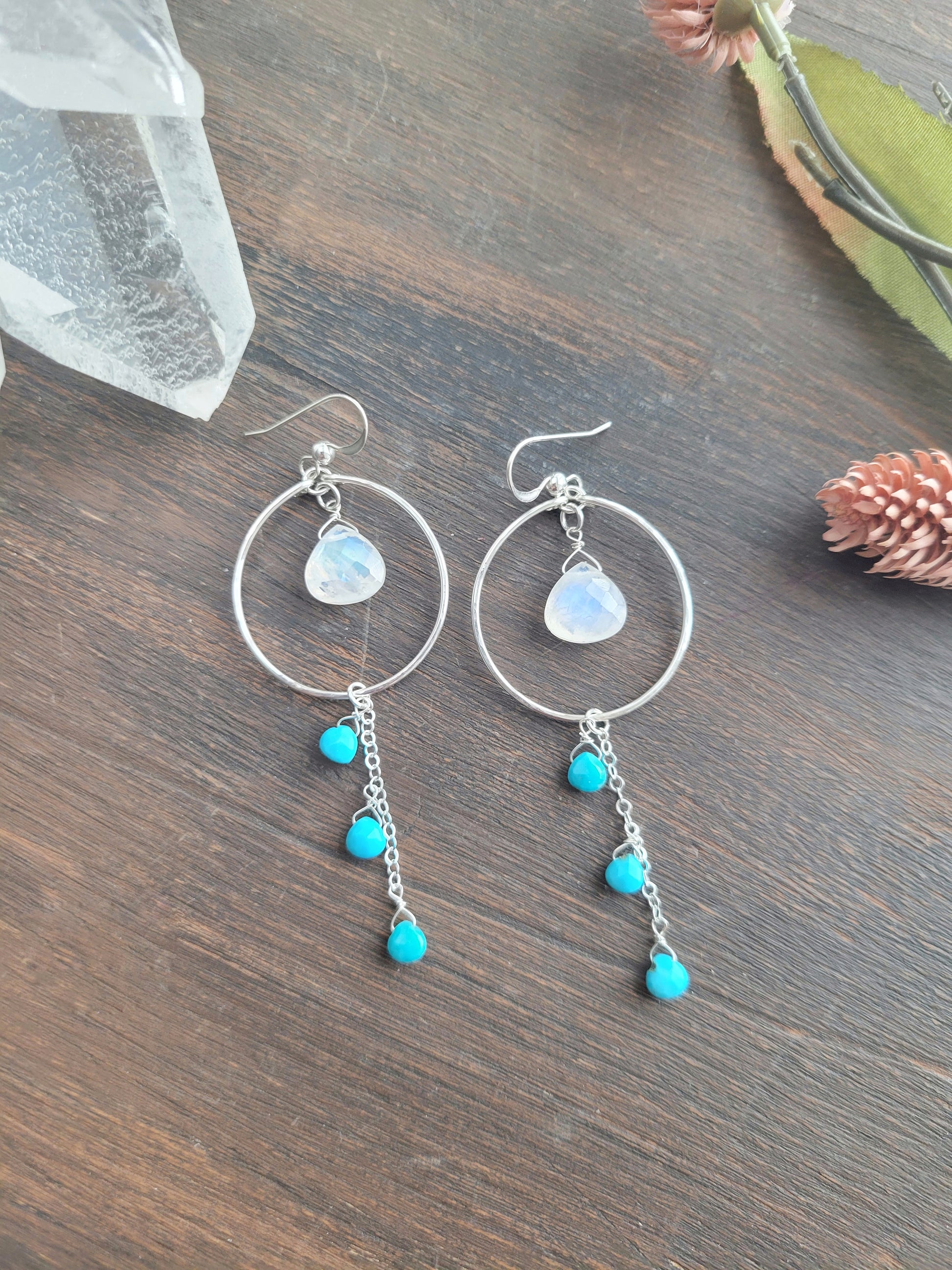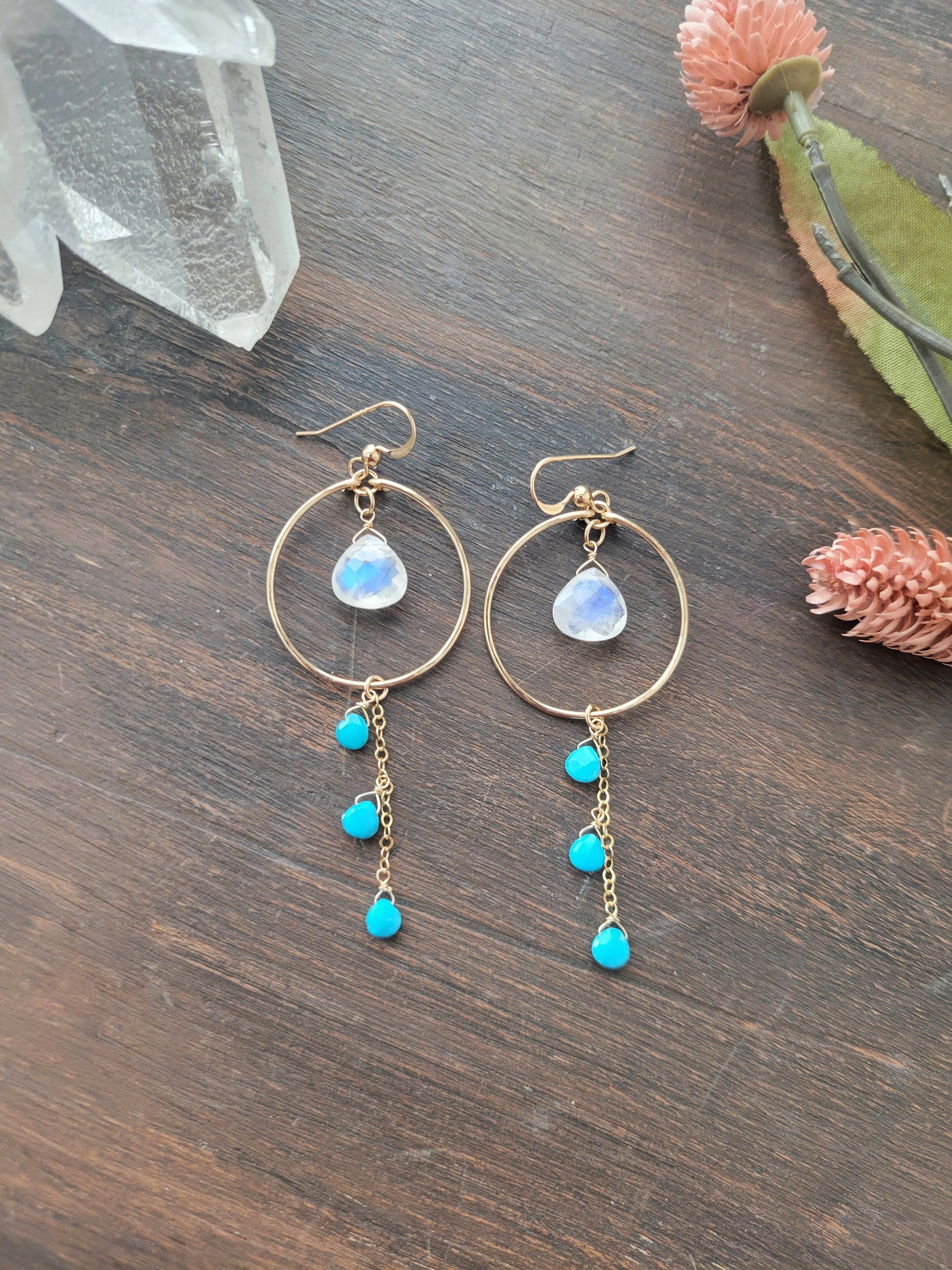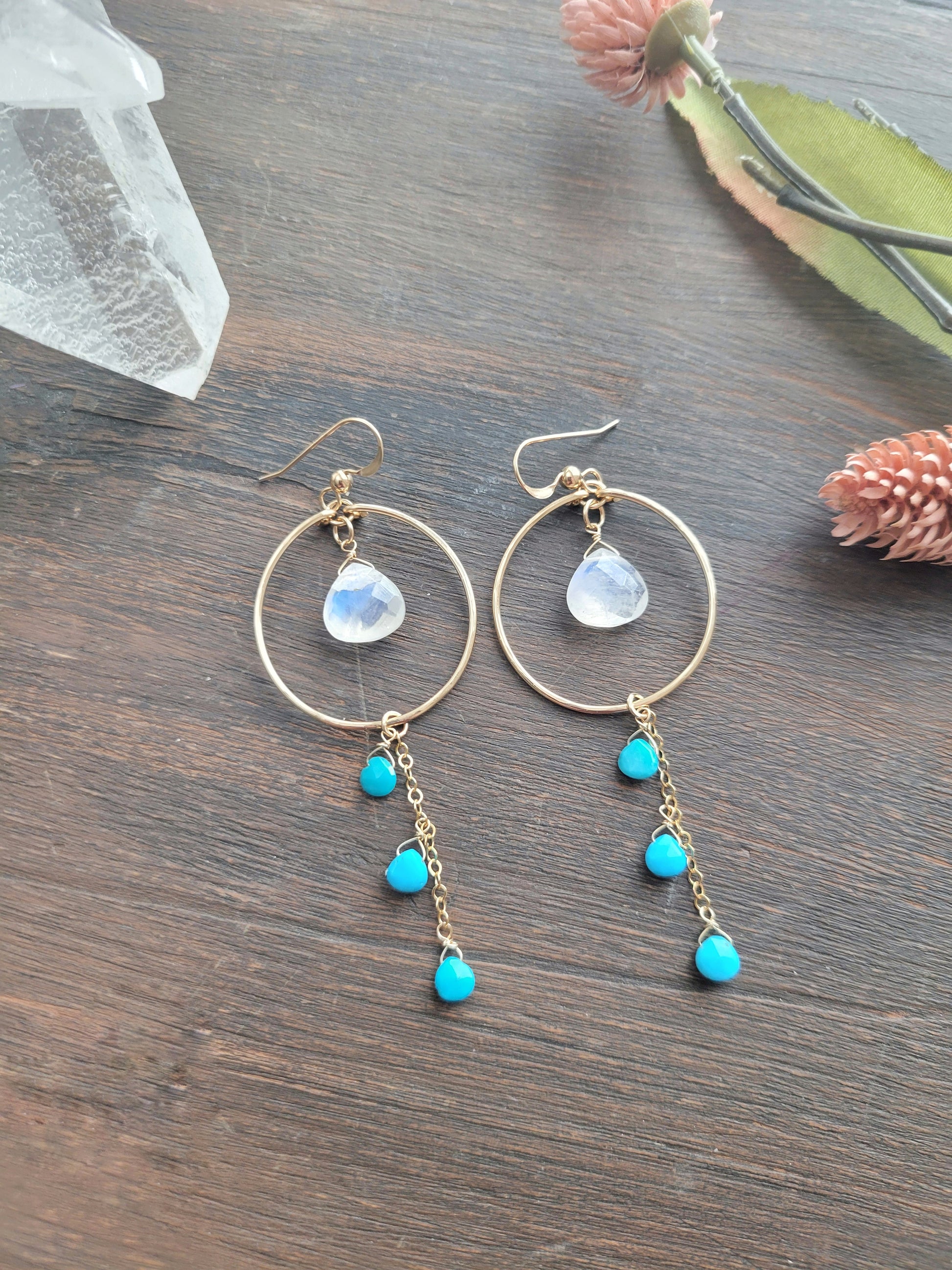 Gorgeous Rainbow Moonstone and Sleeping Beauty Turquoise Dangle Hoop Earrings. These beauties are lightweight and will add some fun and color to any outfit.