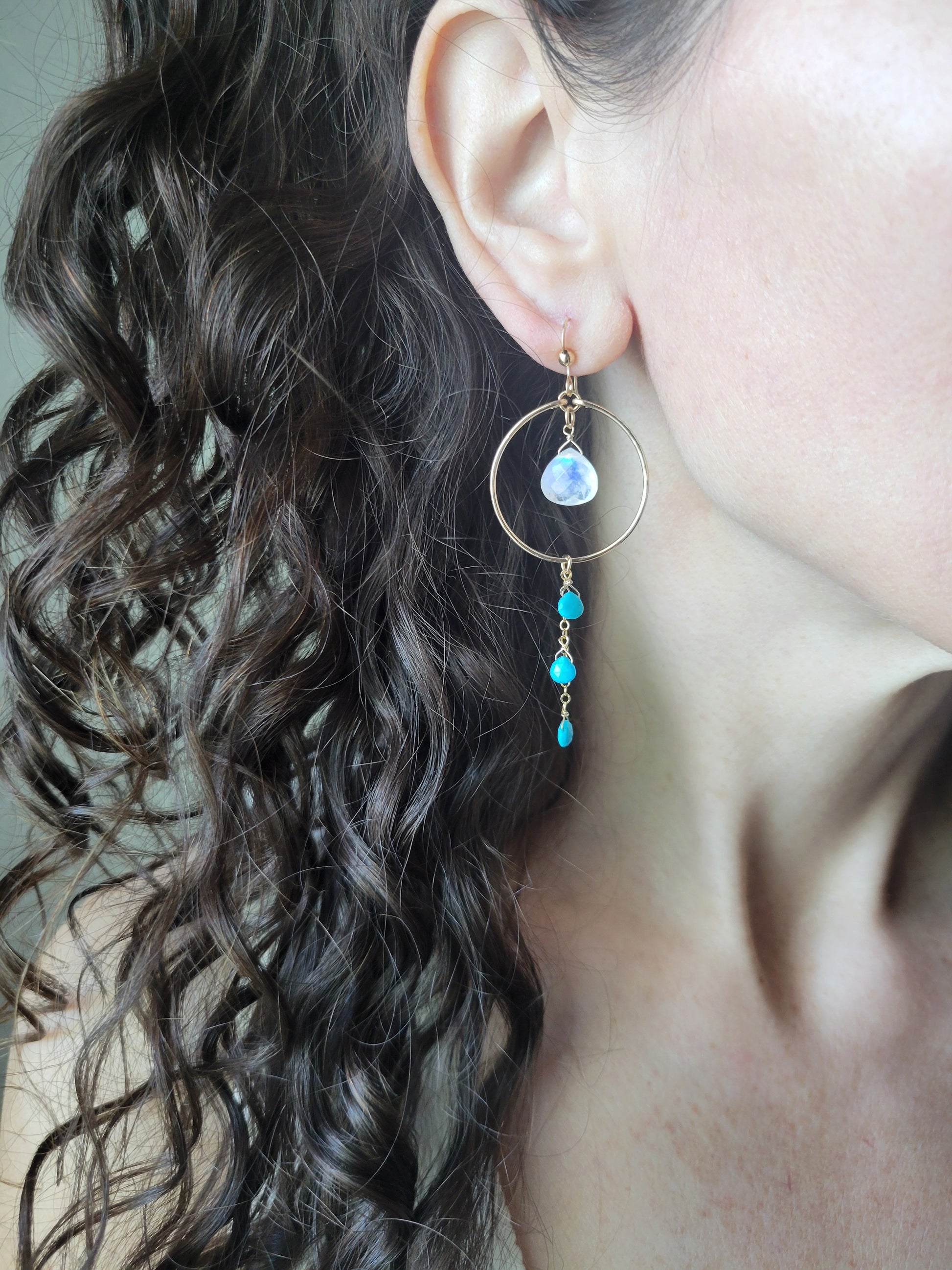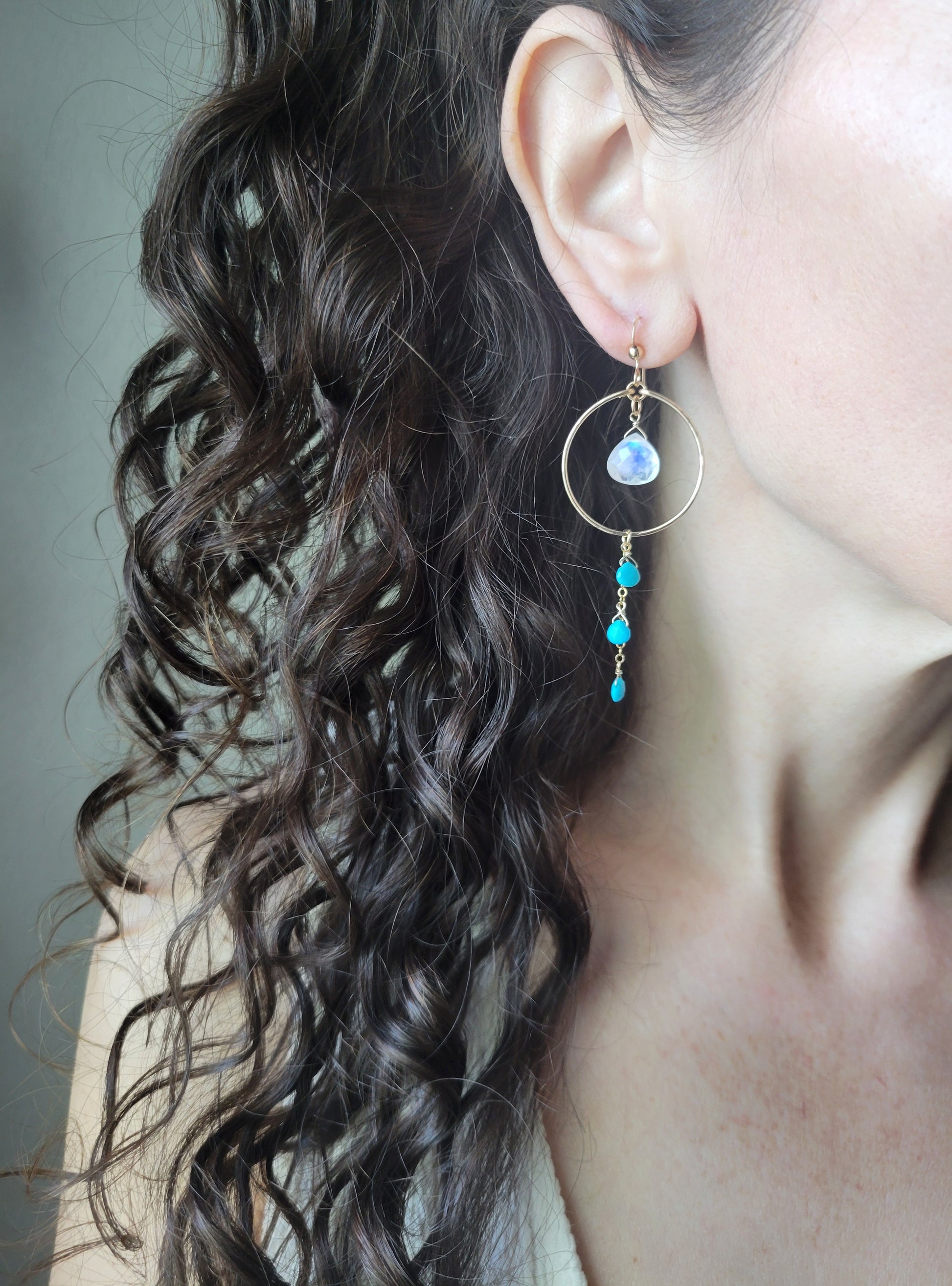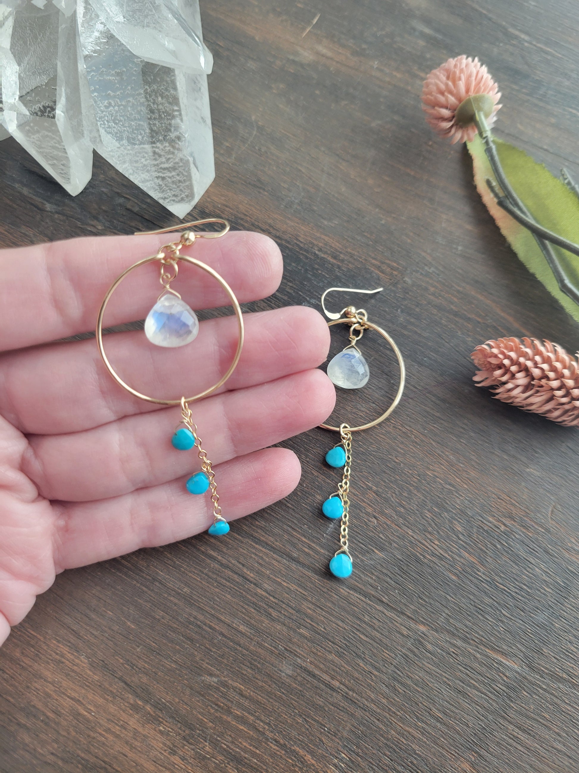 Rainbow Moonstone and Turquoise Dangle Hoop Earrings