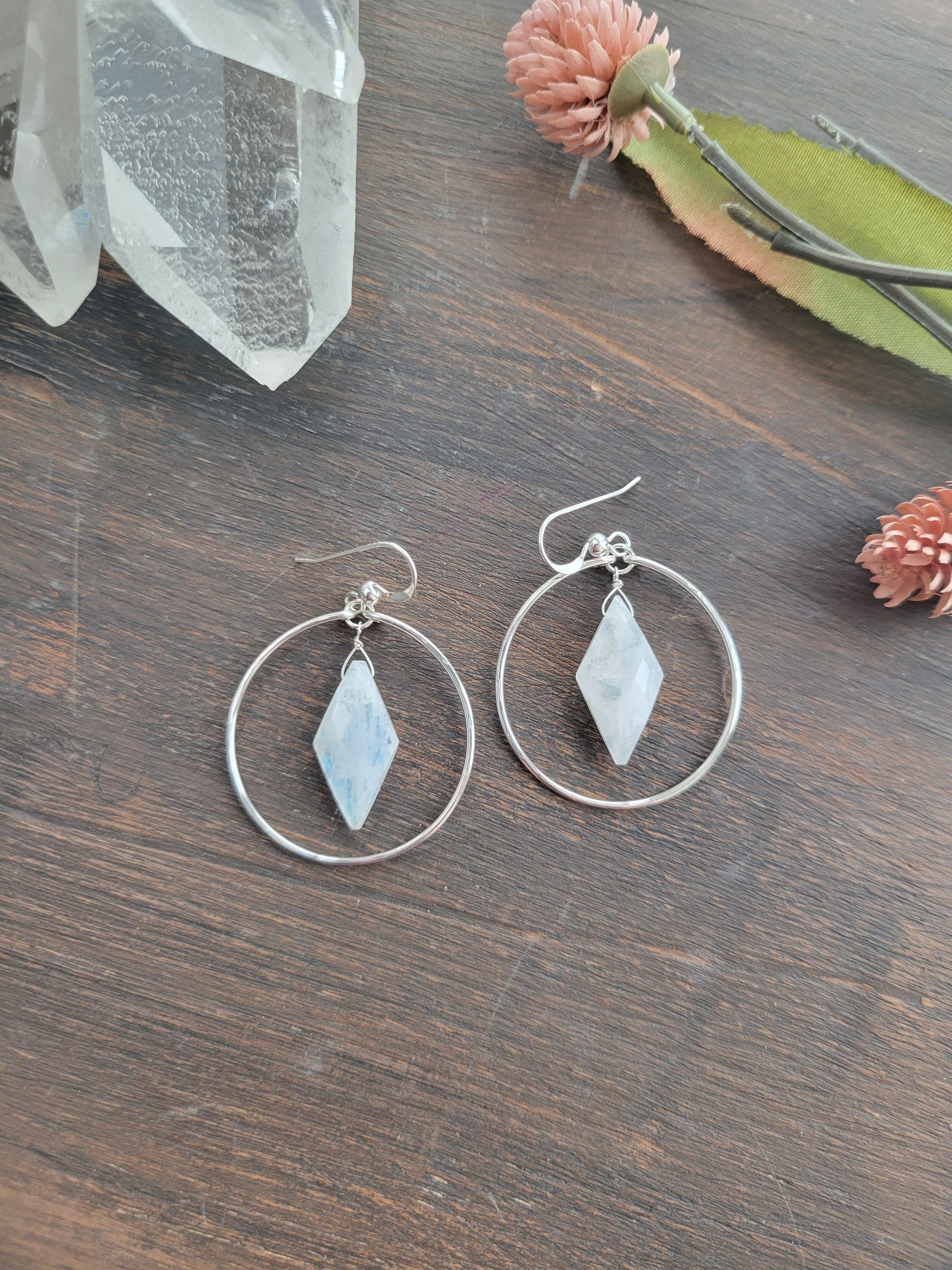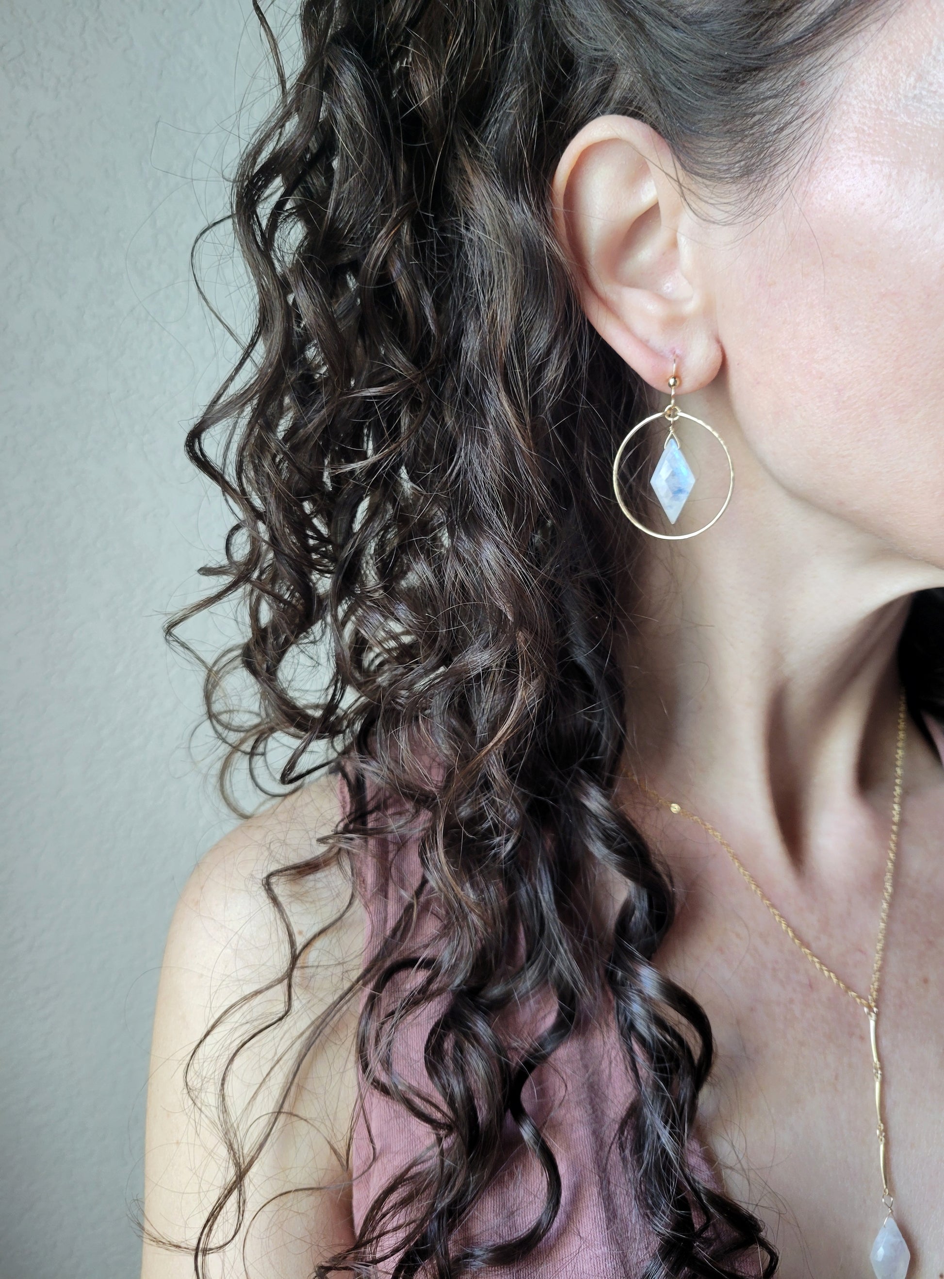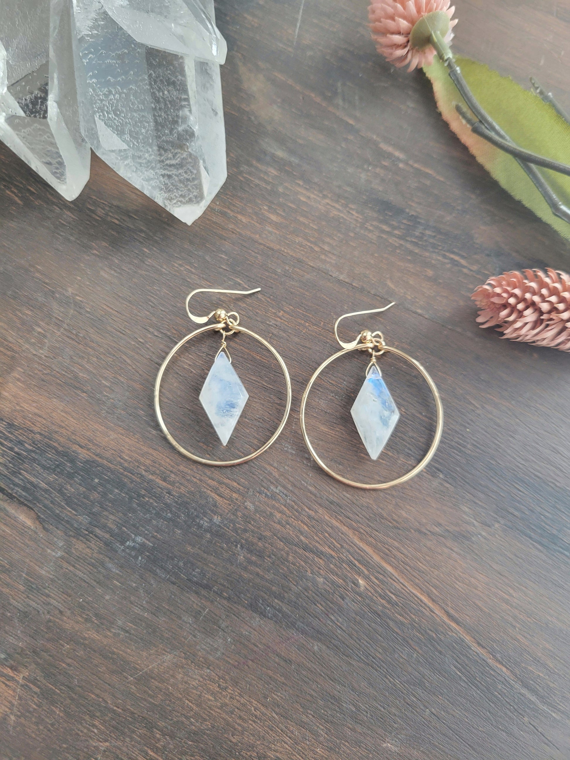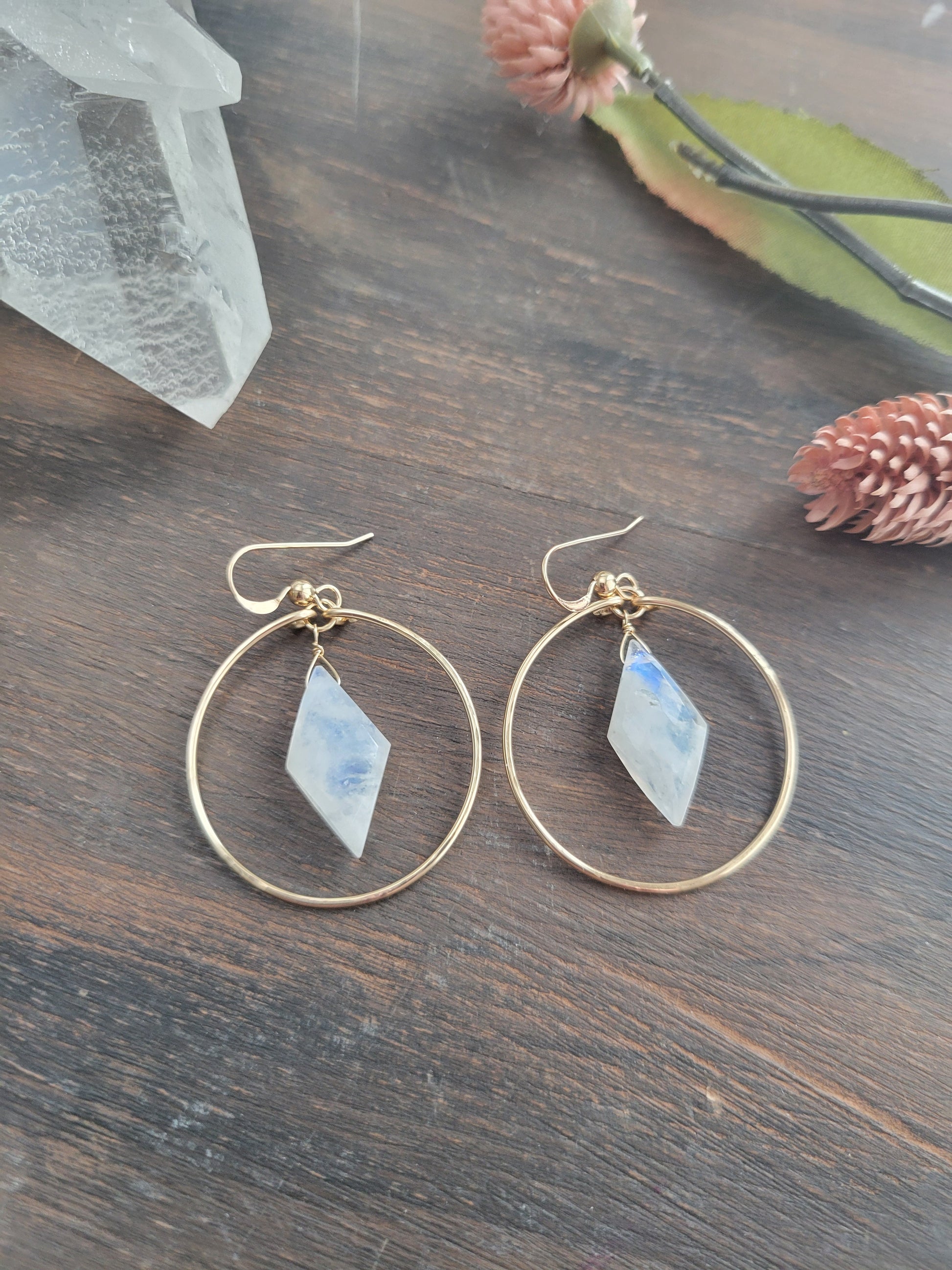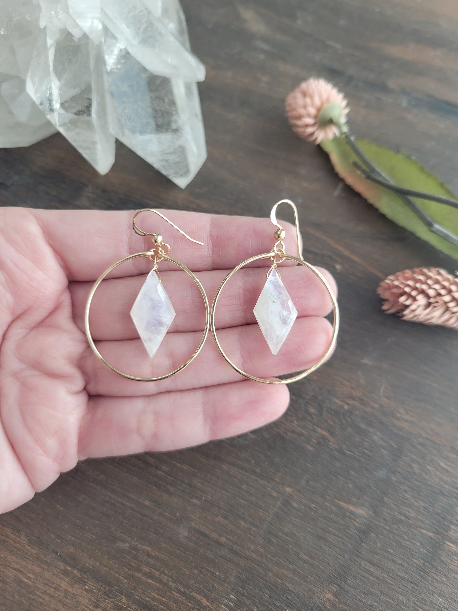 Gorgeous Rainbow Moonstone Hoop Earrings in your choice of 14K Gold Filled or Sterling Silver. Dainty statement earrings that are lightweight and strikingly beautiful with its glow and shape. A beautiful gift for another or yourself!