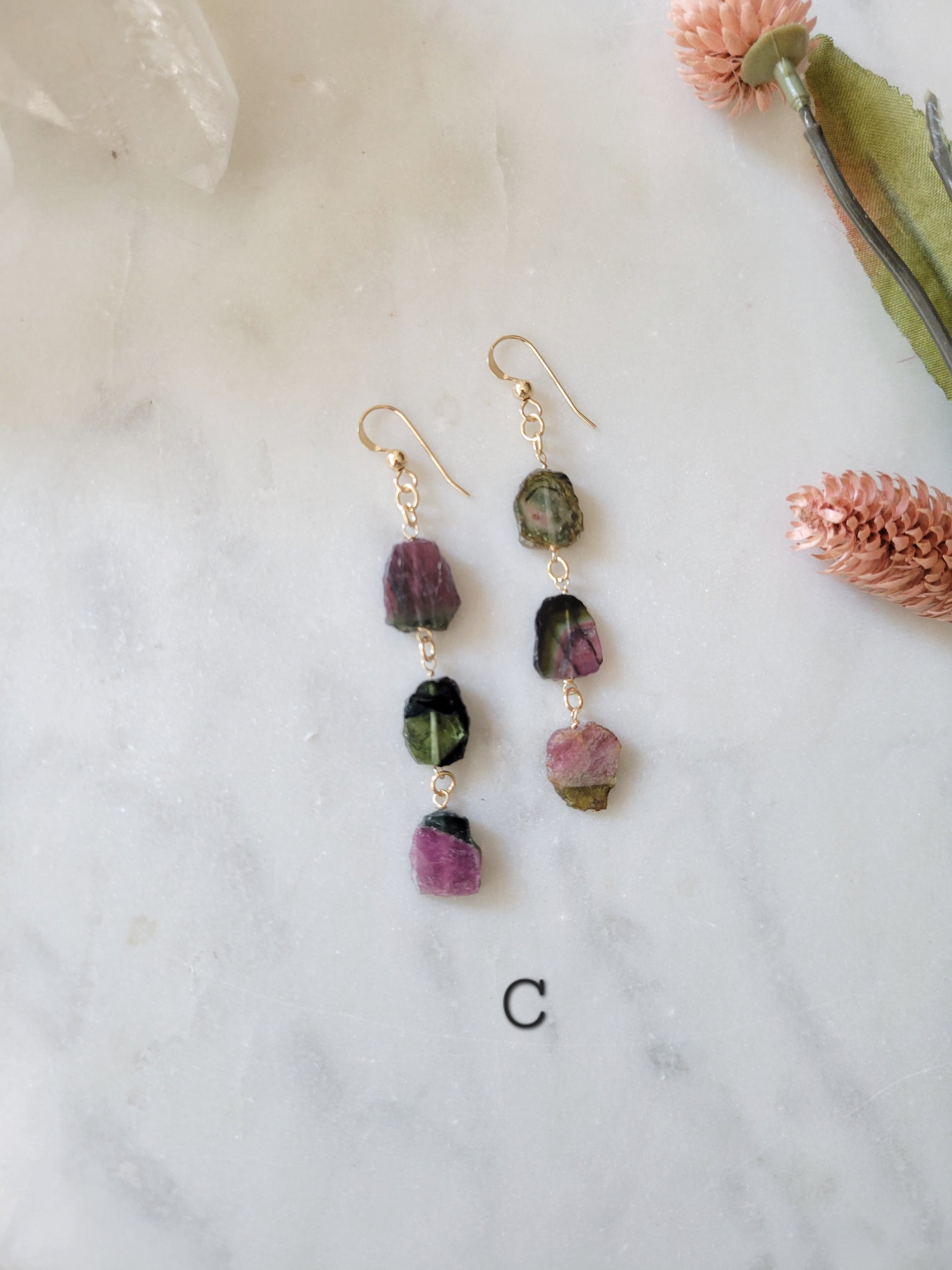 Beautiful Raw Watermelon Tourmaline Dangle Earrings. They are available in 14k Gold Filled. A unique and gorgeous gift for a friend or to yourself! Only three available.