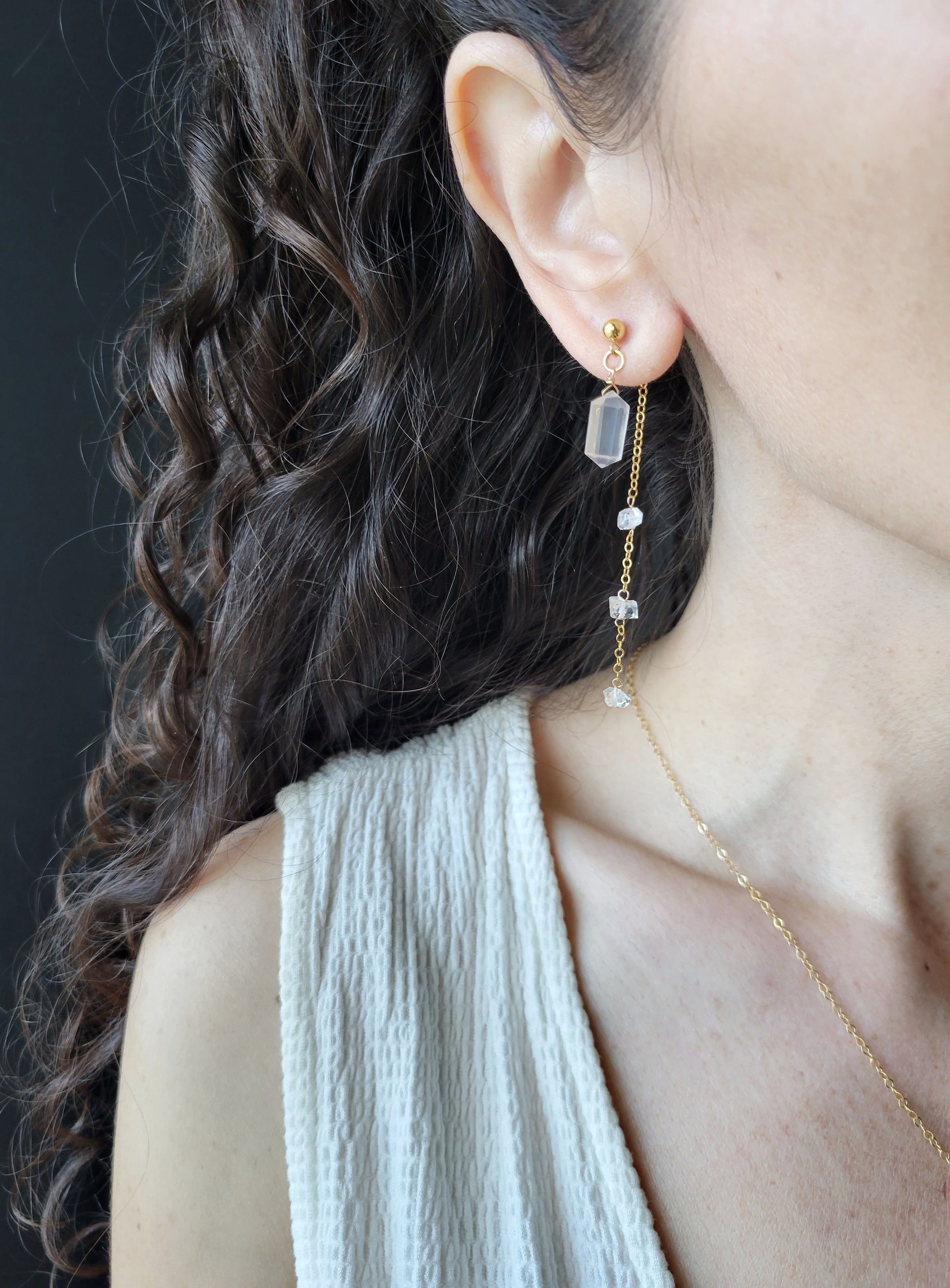 A Rose Quartz Point Crystal dangles from the front of the stud. In the back, connected to the backing, 3 Herkimer Diamonds dangle from a cable chain.