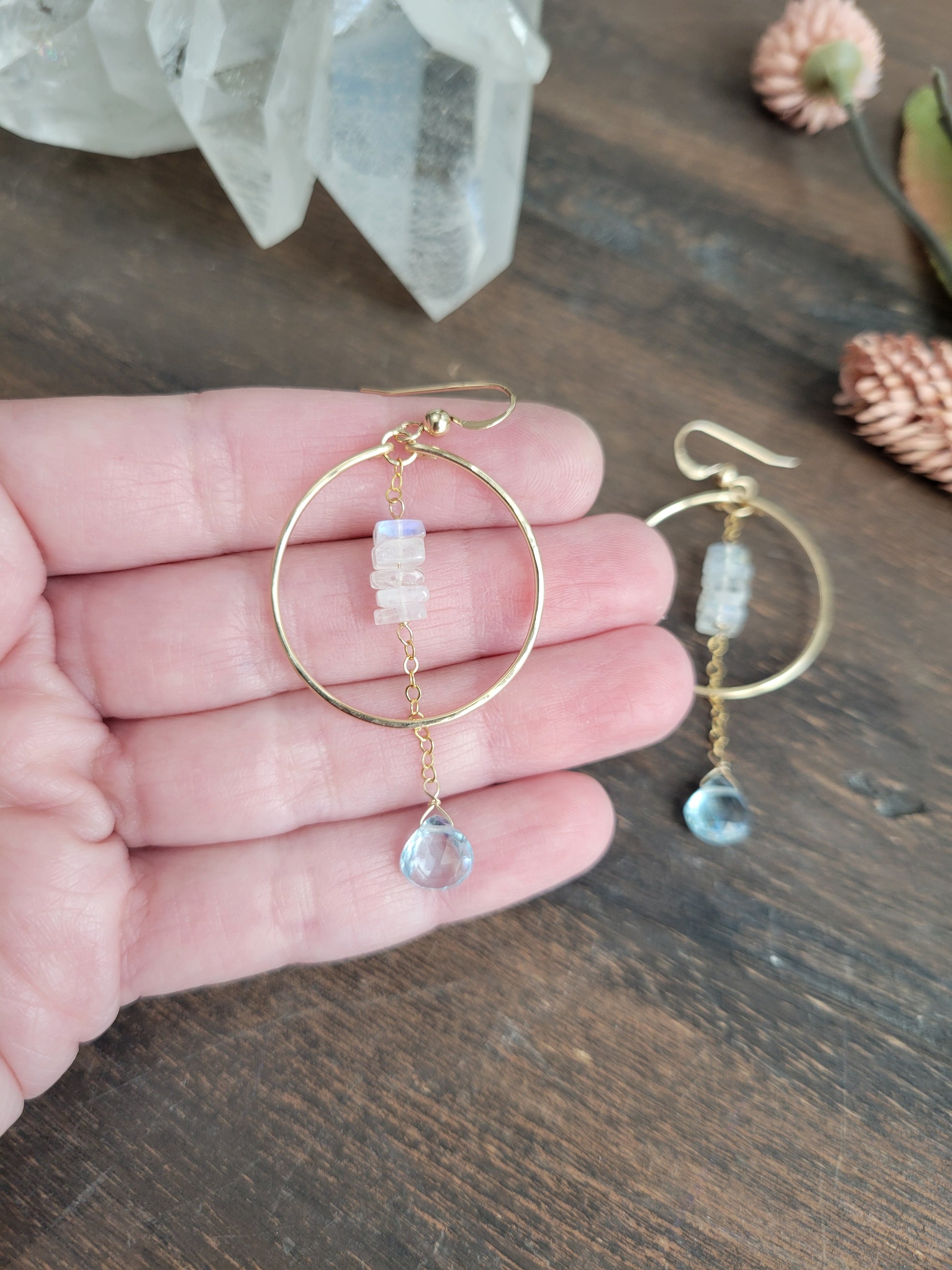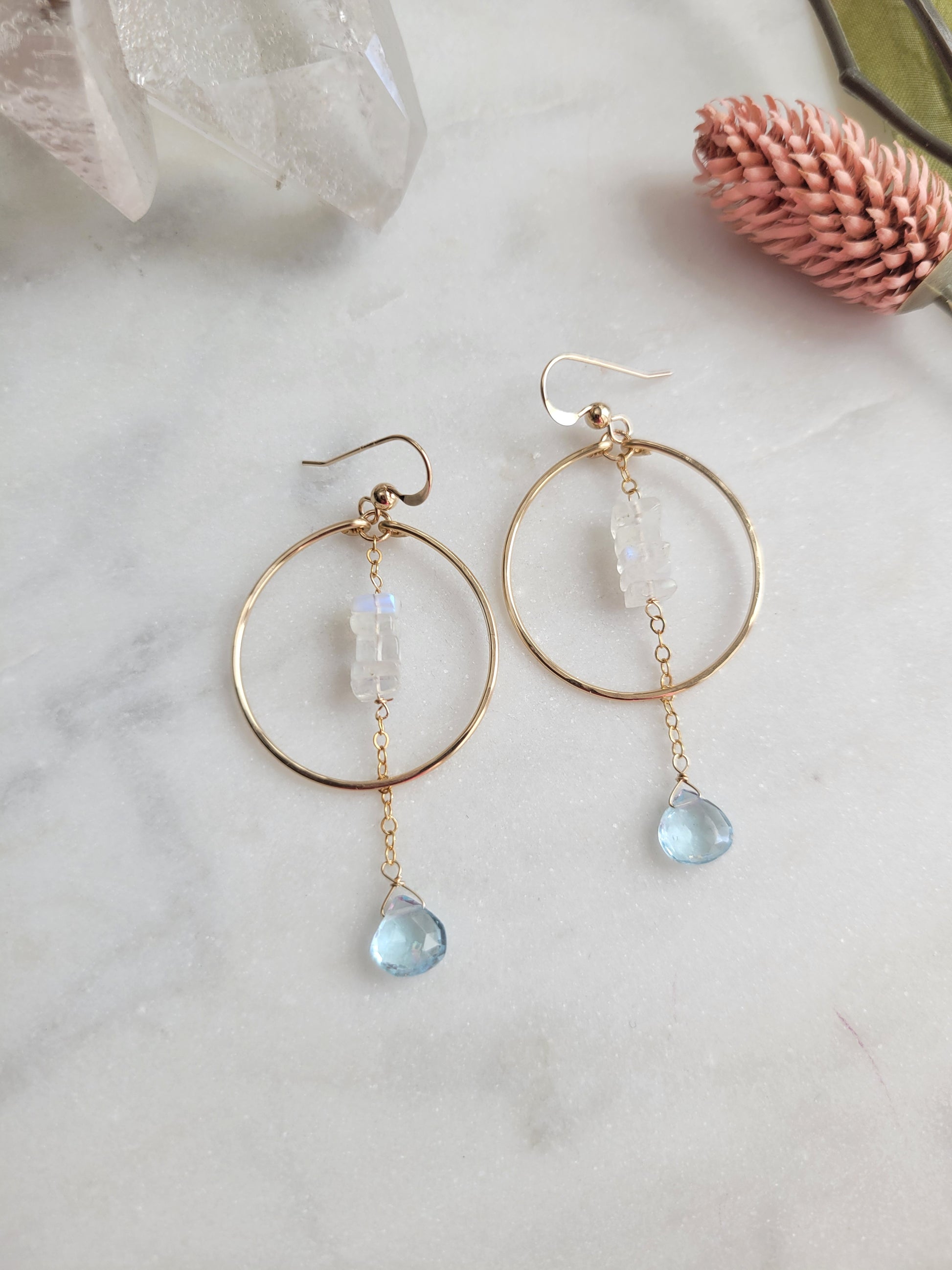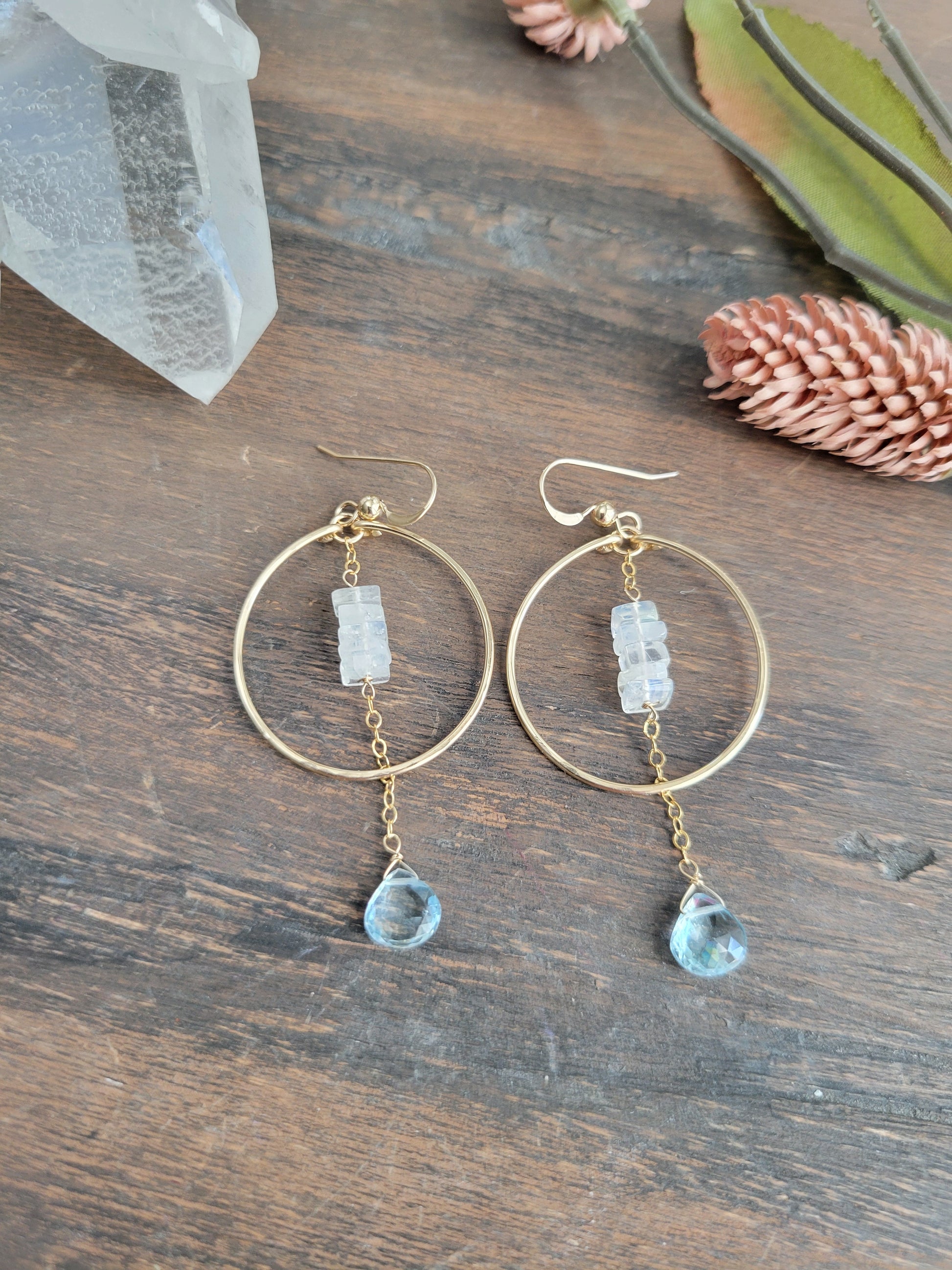 Sky Blue Topaz Hoop Dangle Earrings with Moonstone in your choice of Sterling Silver or 14K Gold Filled. Lightweight with delicate movement. You can easily dress these beauties up or down.