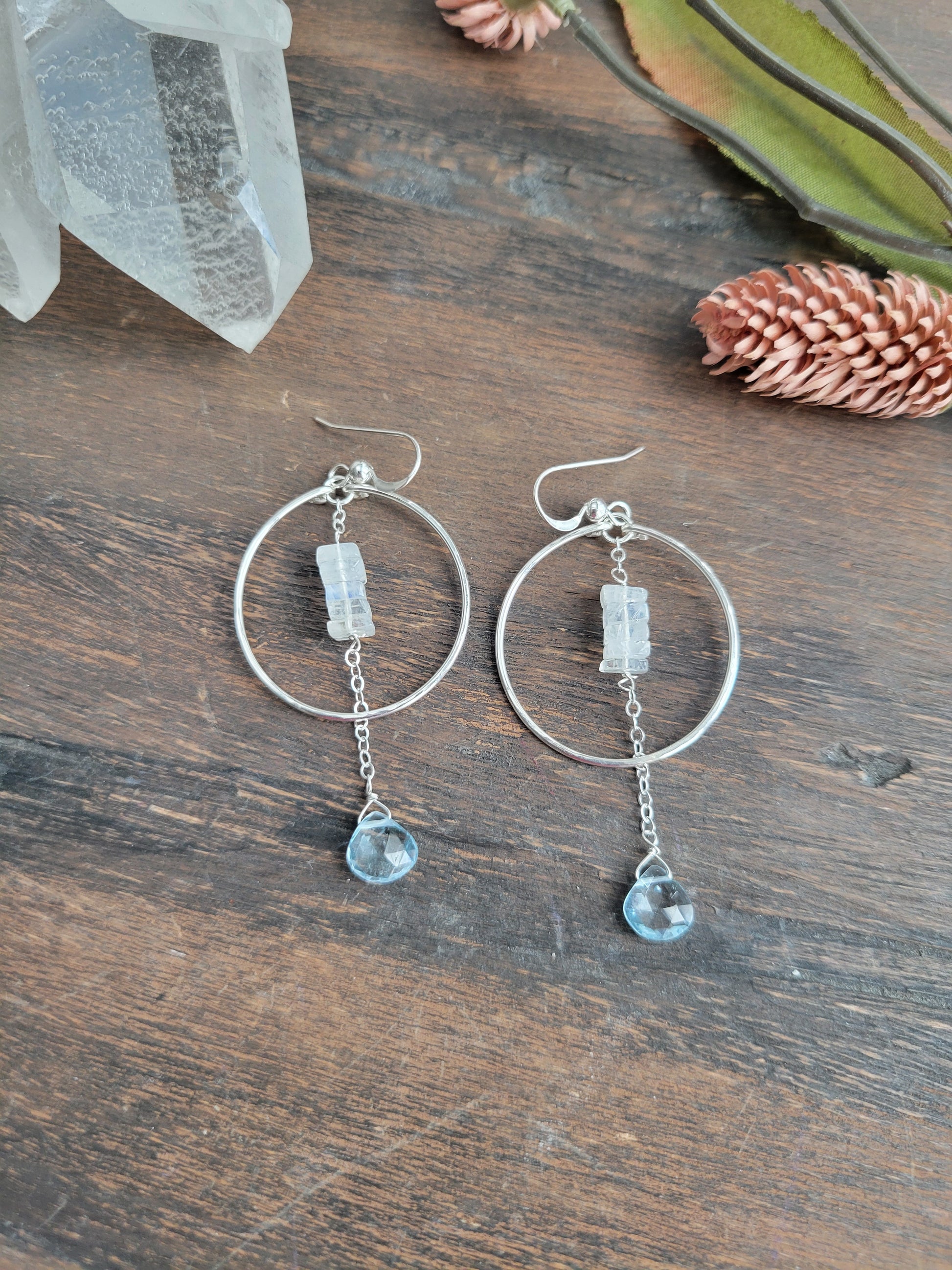 Sky Blue Topaz Hoop Dangle Earrings with Moonstone
