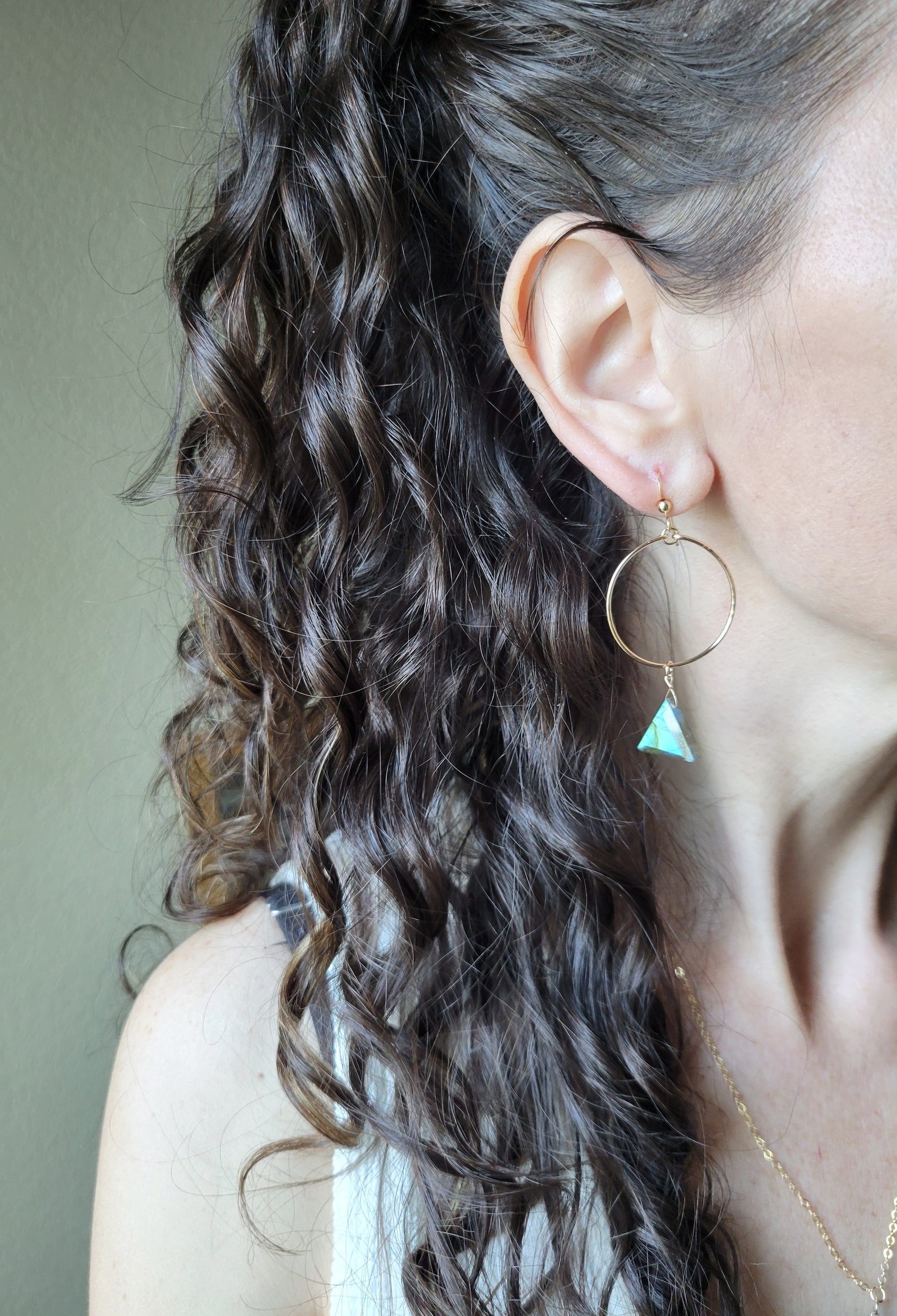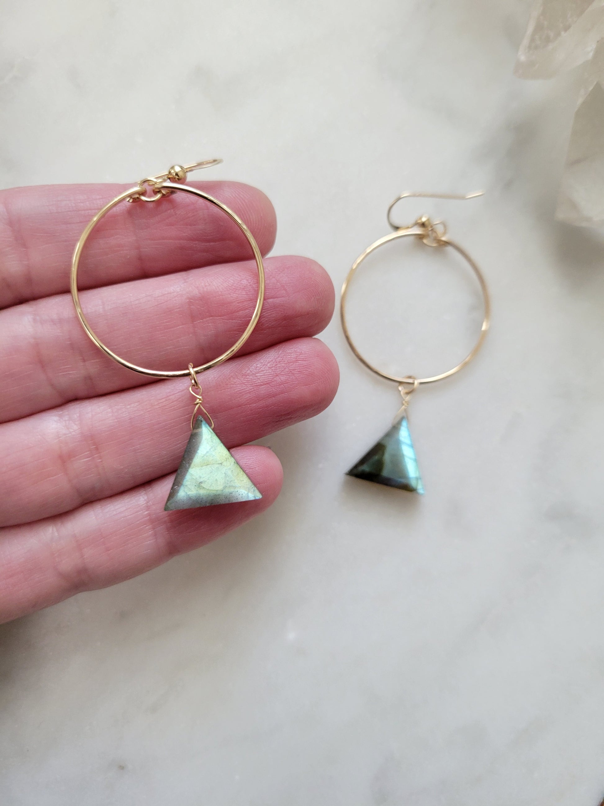 The Labradorite Triangle Hoop Earrings are fun, beautiful, and lightweight.
