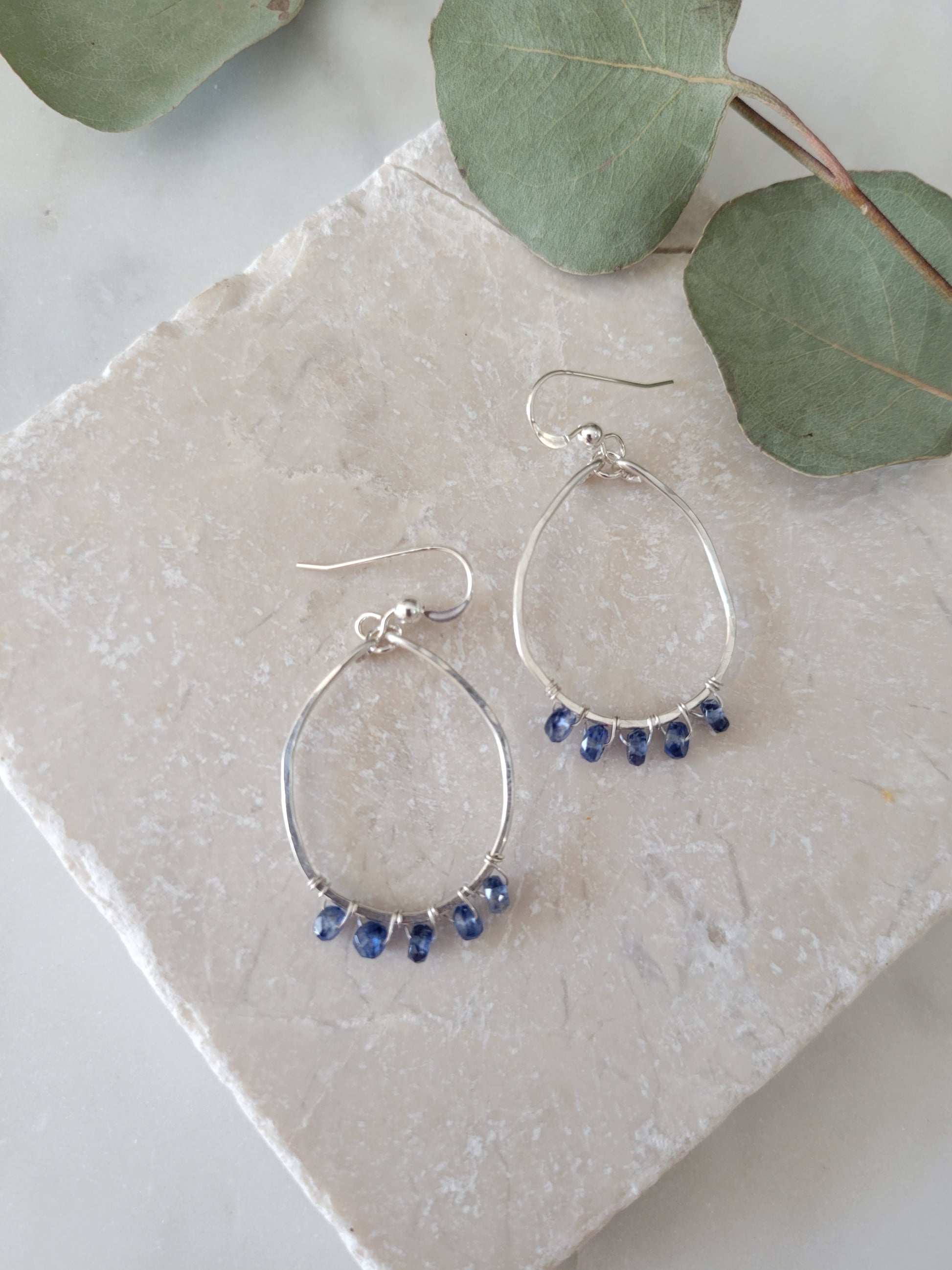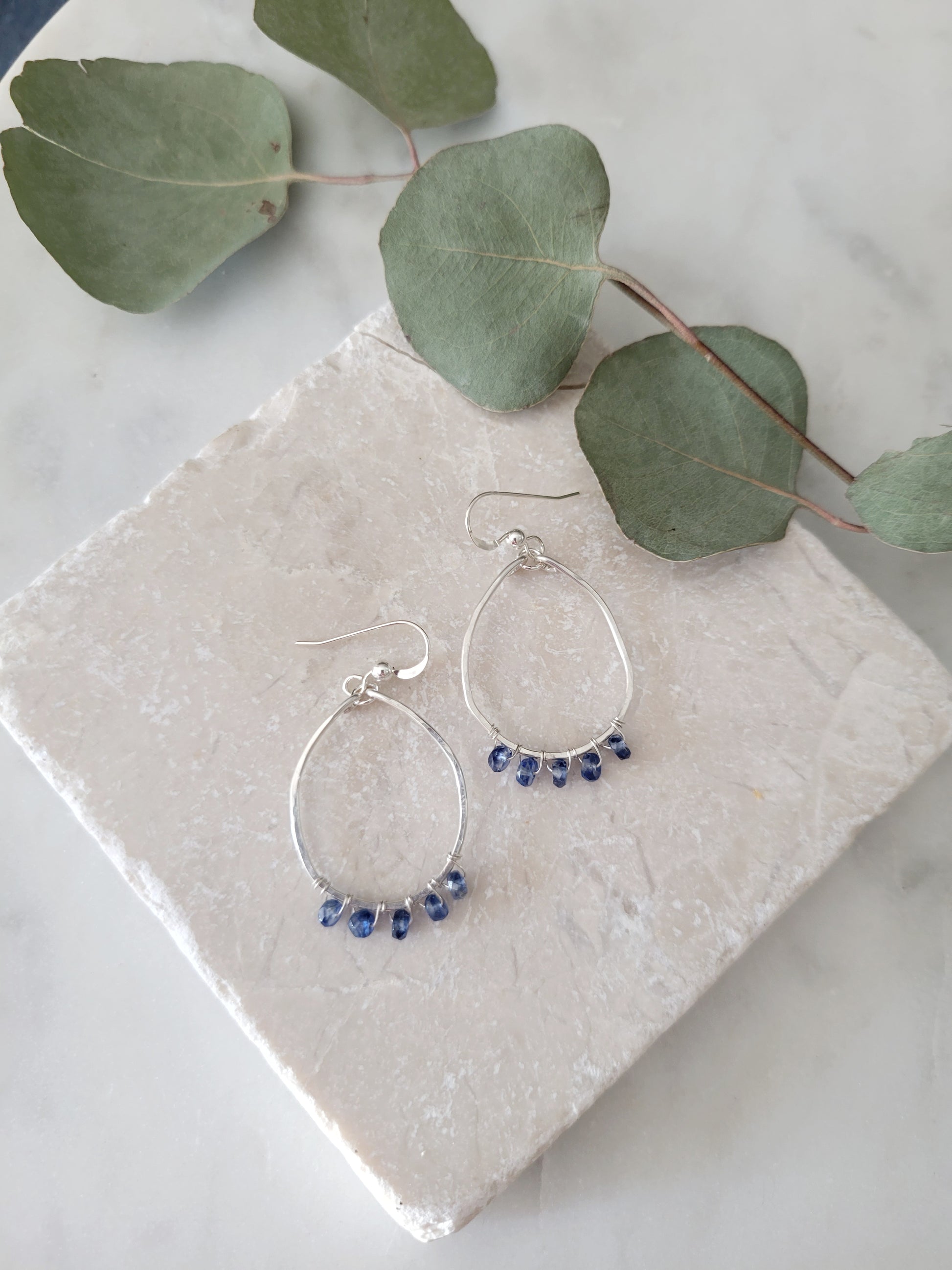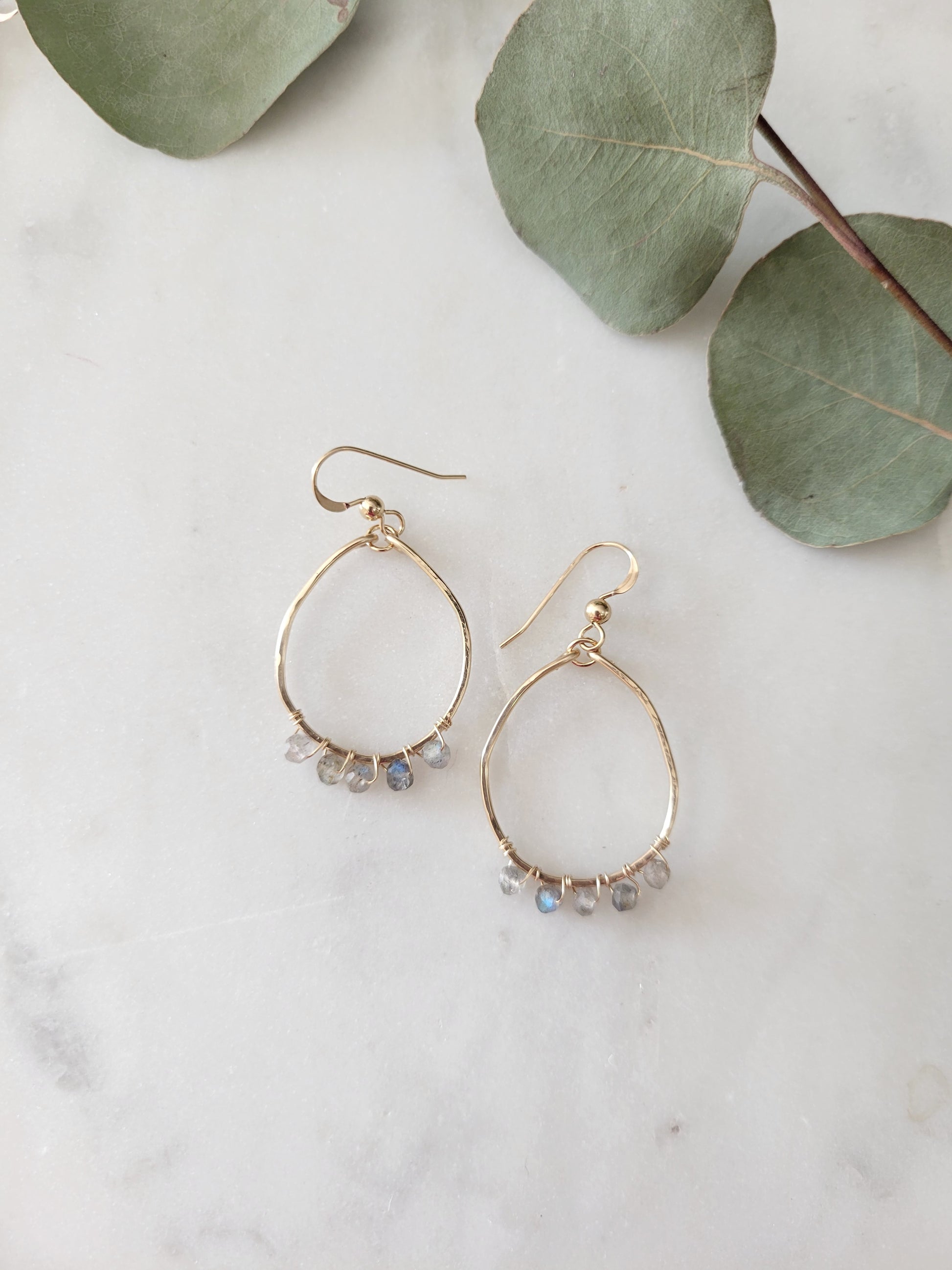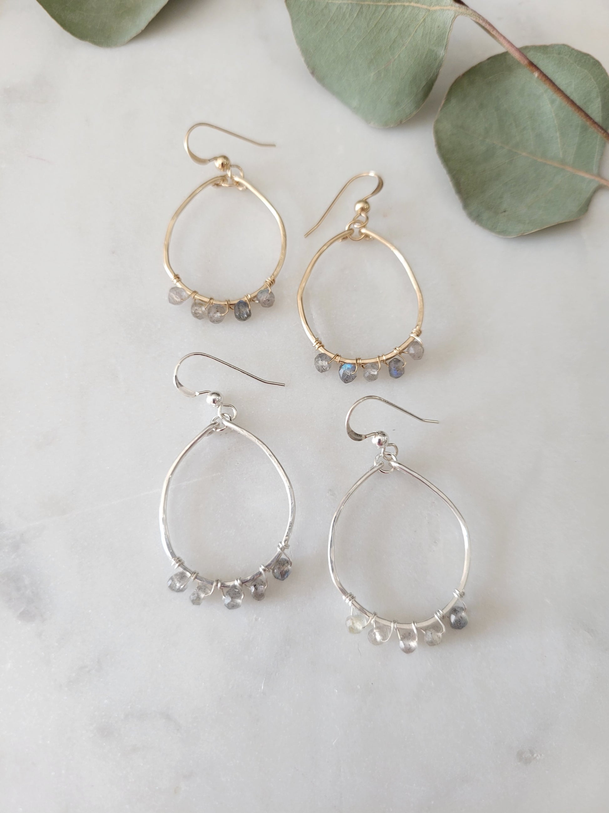 Dainty and sweet gemstone hoop earrings in your choice of Kyanite Gemstone (Blue) or Labradorite Gemstone (Gray with a light flash of color) These are super light and easy to wear! The blue of the Kyanite is such a gorgeous blue! Both gemstones are great for the upcoming fall season!