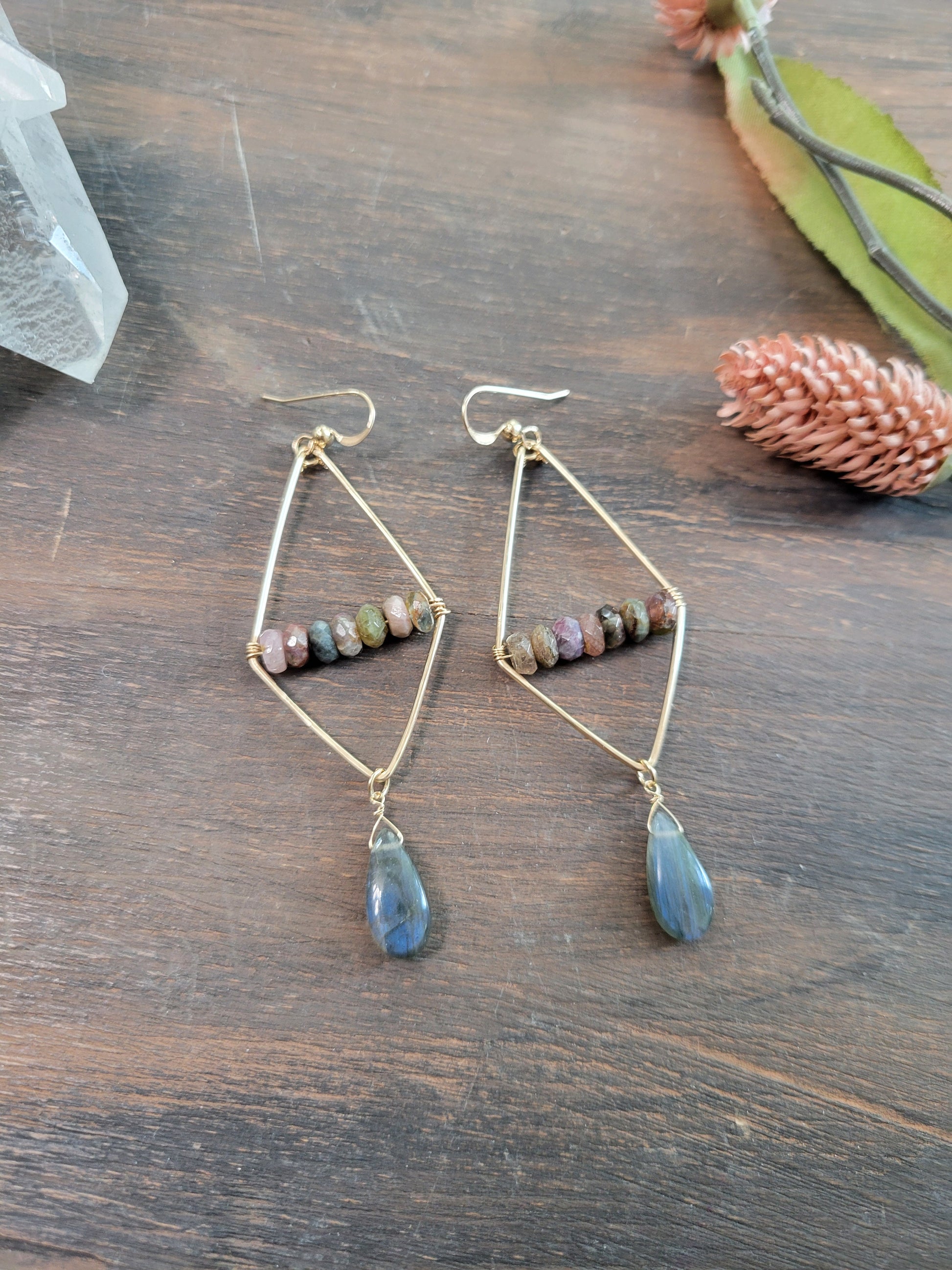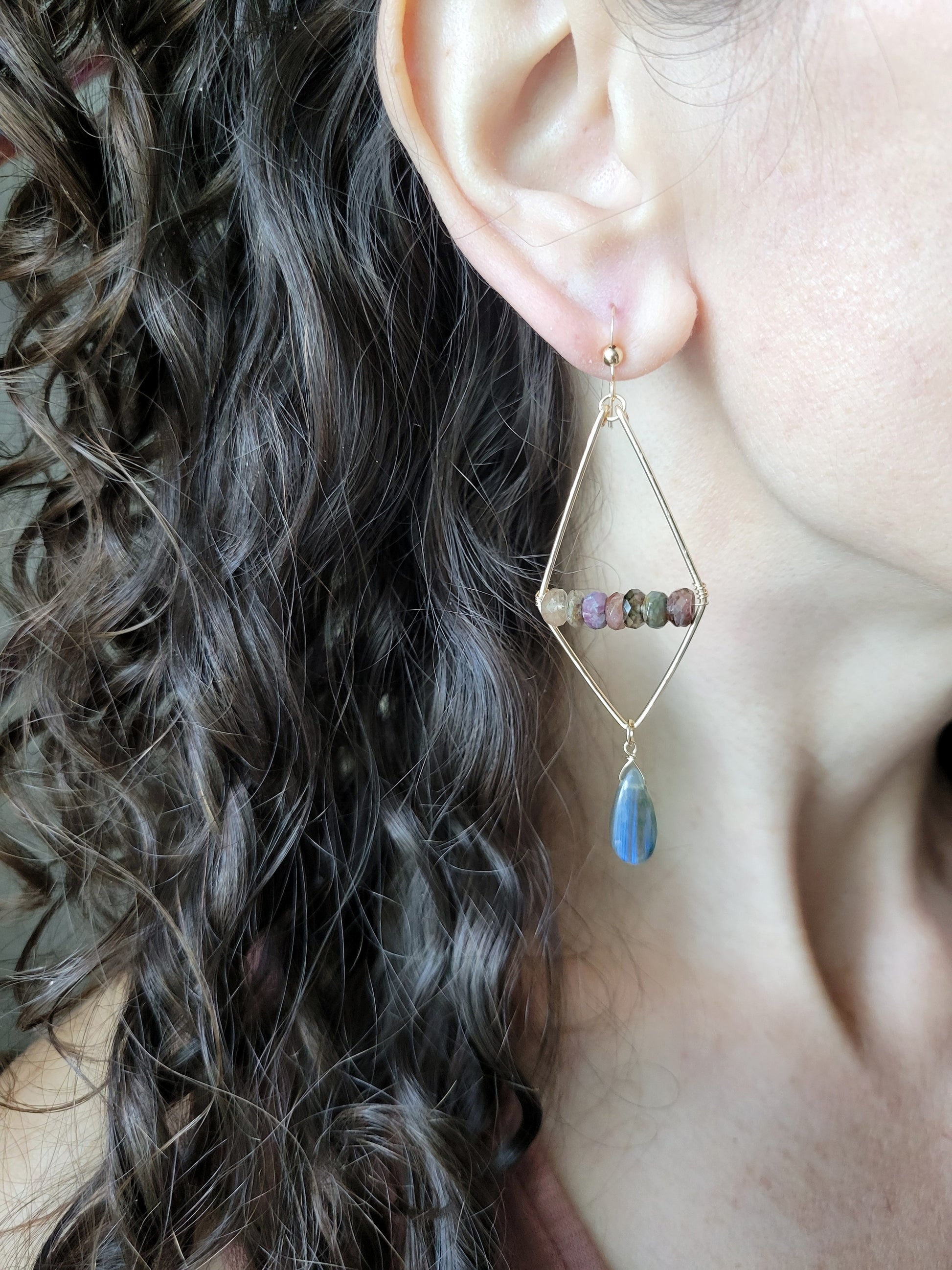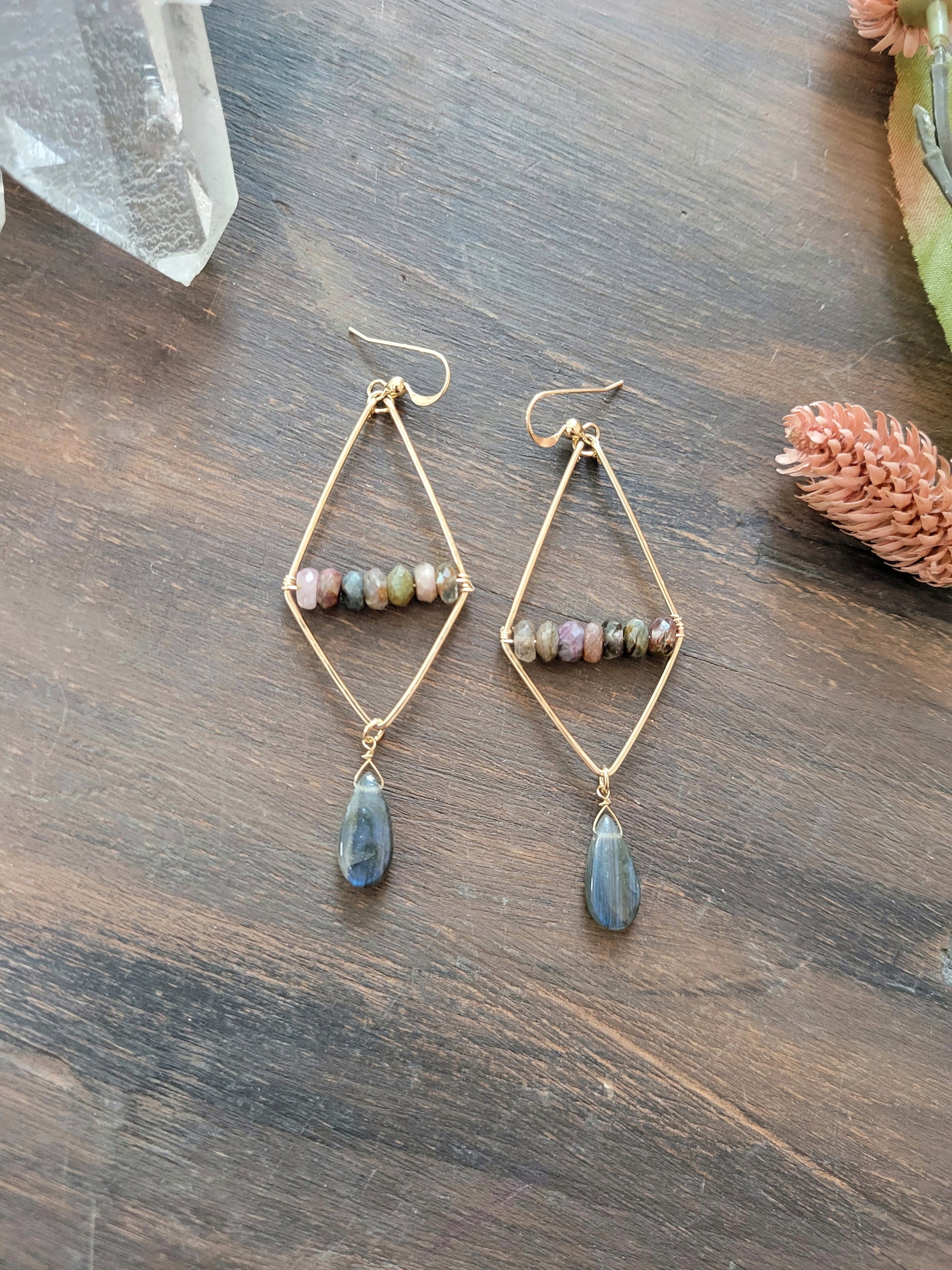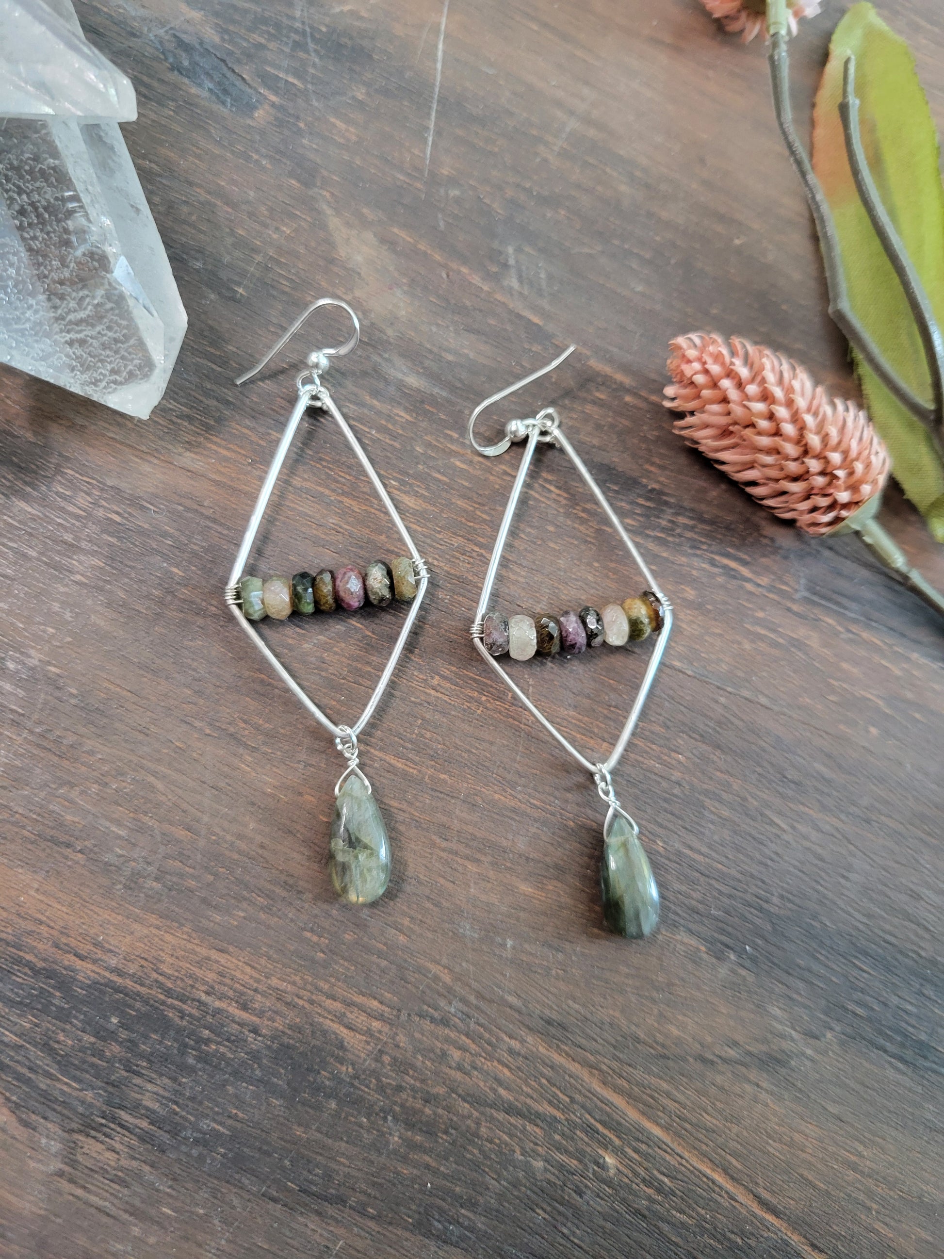 The diamond shape hoops are hand formed and lightly hammered for texture and shape. The Watermelon Tourmaline are wire wrapped across the diamond and the Labradorite dangles from the bottom.