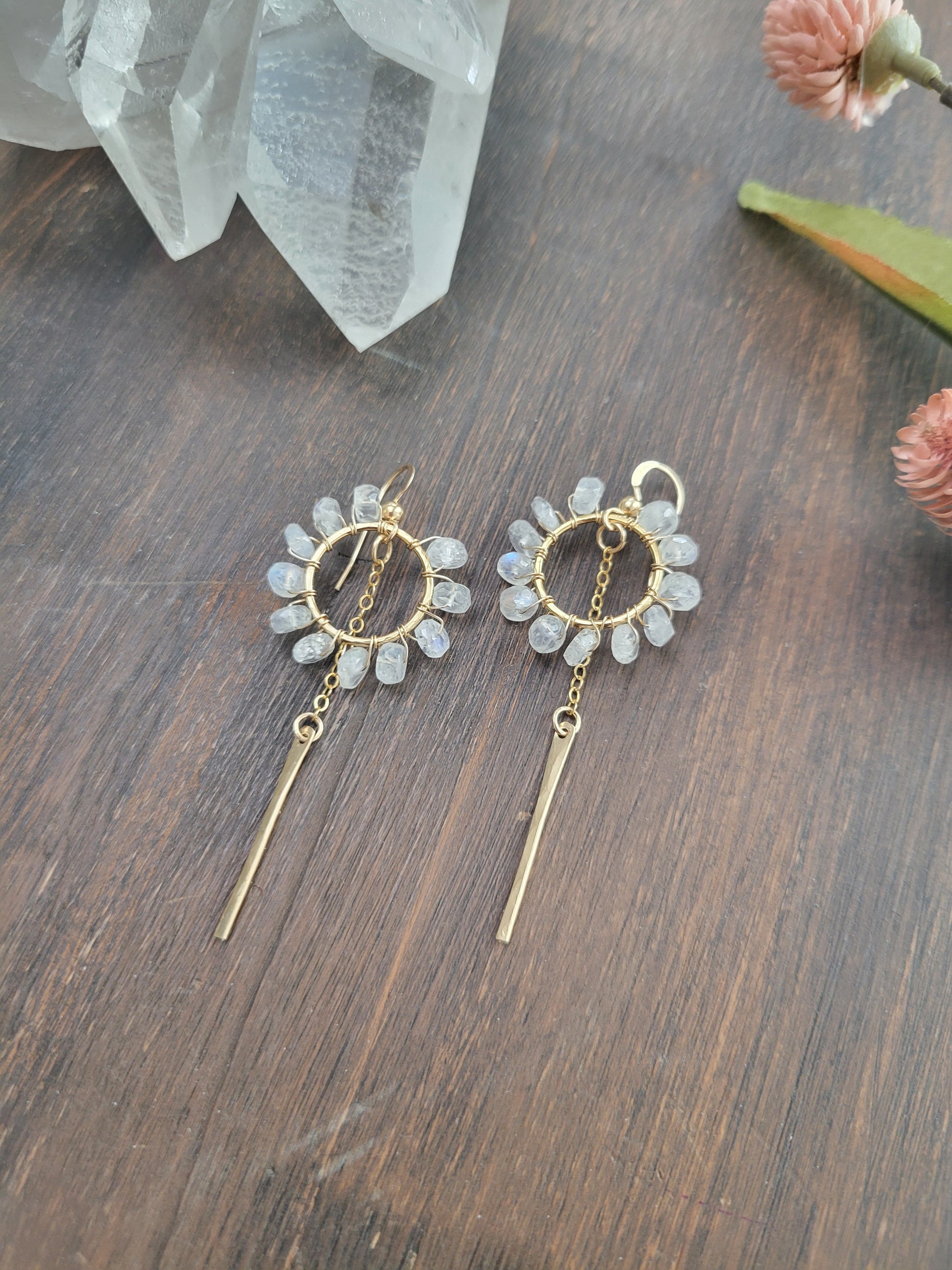 Lightly hammered circles with hand wire wrapped Moonstone gems. In the center dangles a cable chain with a hand hammered bar.